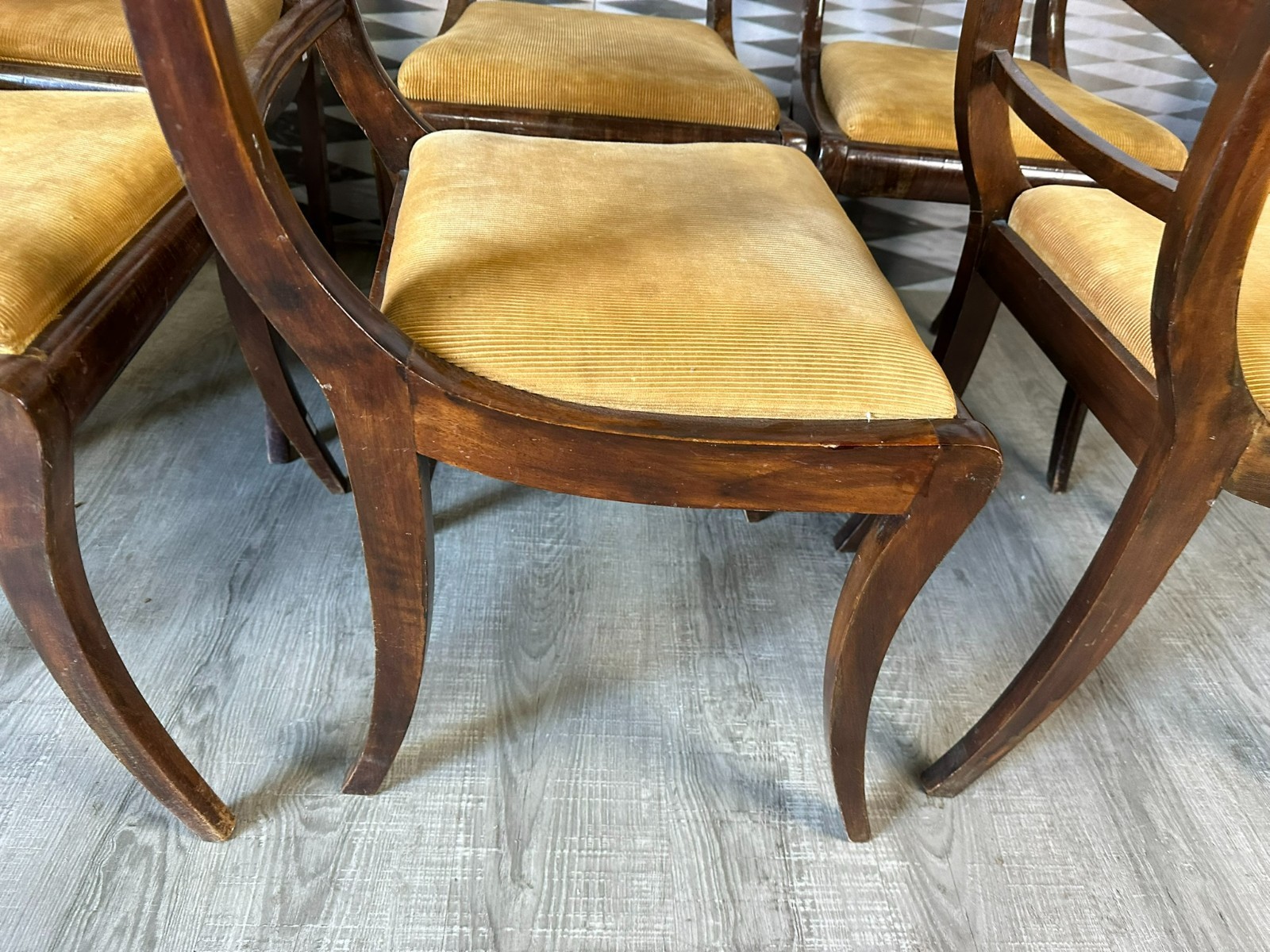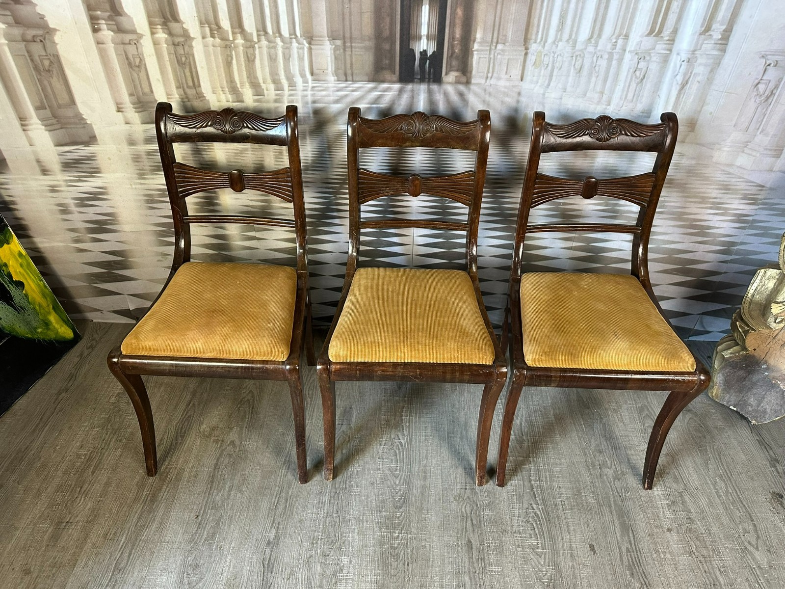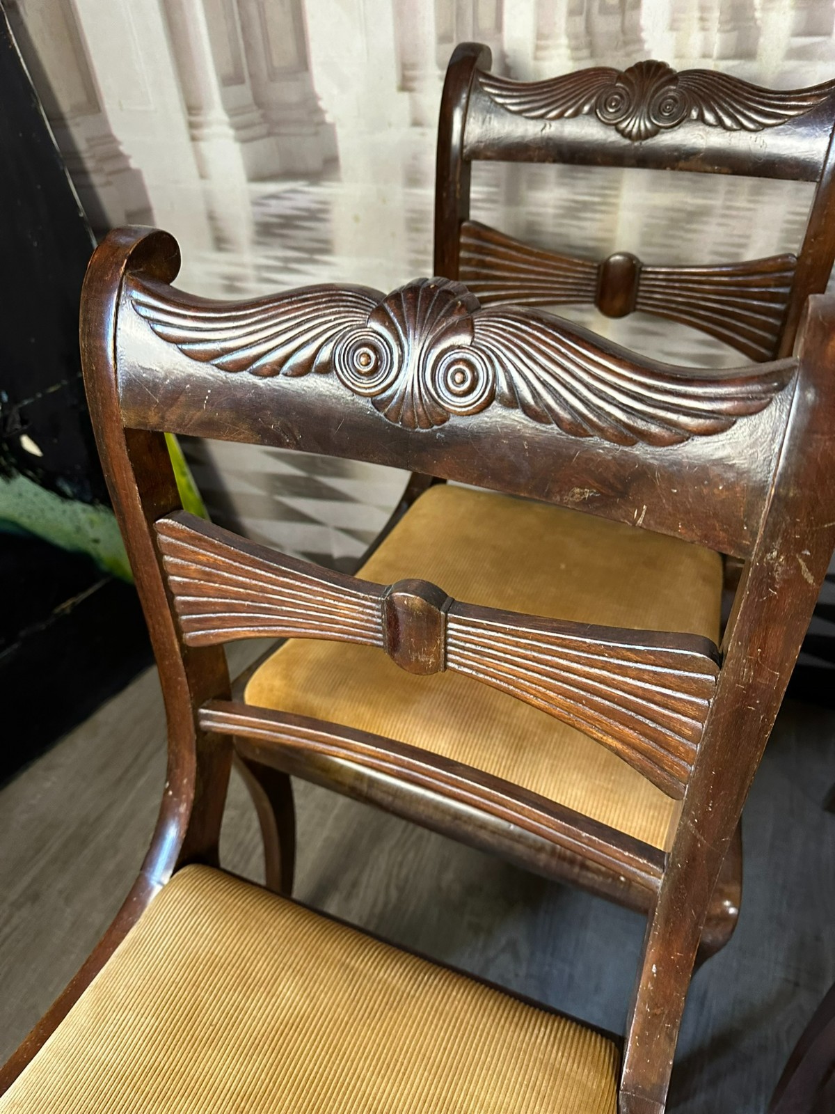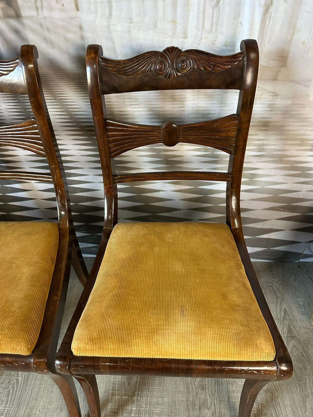 Set bestehend aus sechs antiken englischen Regency-Stühlen, 19-tes Jhdt. Die Sitzflächen wurden mal überarbeitet und sind leicht fleckig. Gestelle aus Mahagoni, dunkelbraun patiniert. Insgesamt Abrieb, kleiner Druckstellen und Nutzungsspuren. Die Füße zum Teil leicht krumm, die Stabilität wird dadurch nicht beeinträchtigt. Guter Sitzkomfort. Einer der sechs Stühle geht an einer hinteren Verbundstelle (siehe Foto) leicht auseinander. Abmessungen BTH 45/49/85cm, Sitzhöhe 47cm.