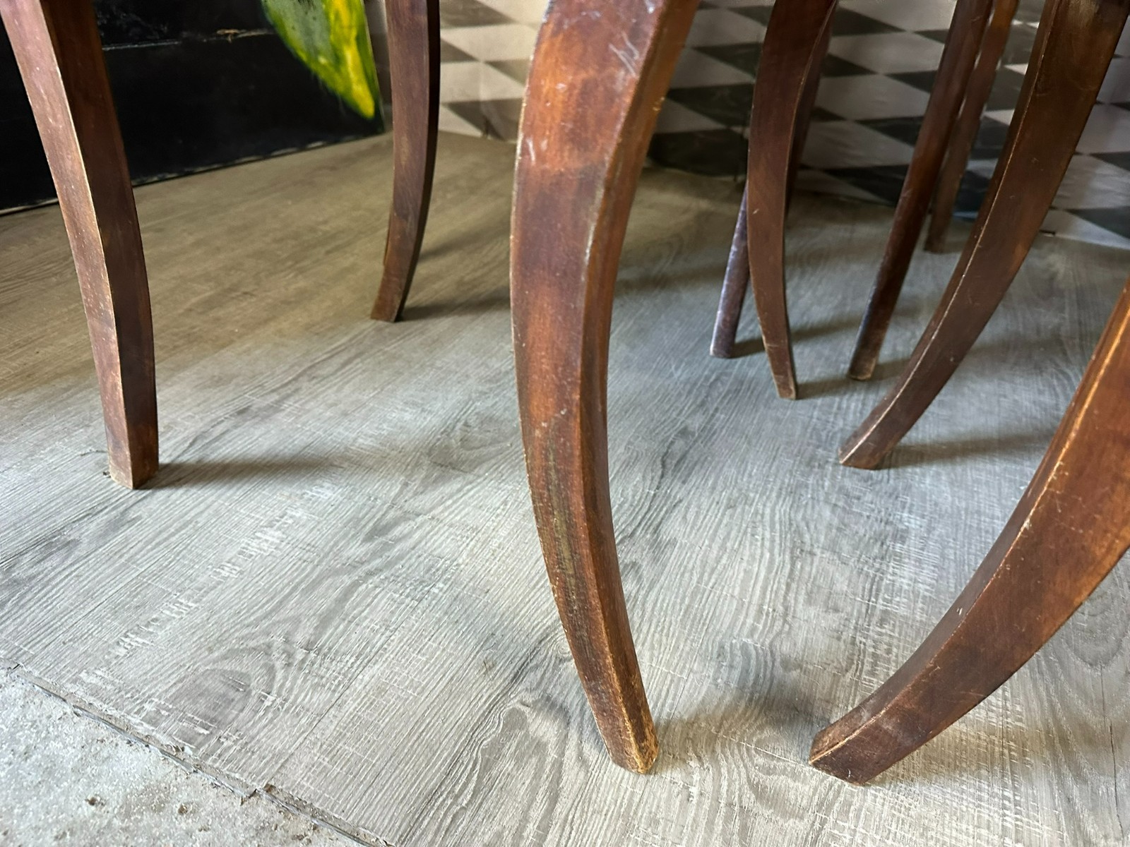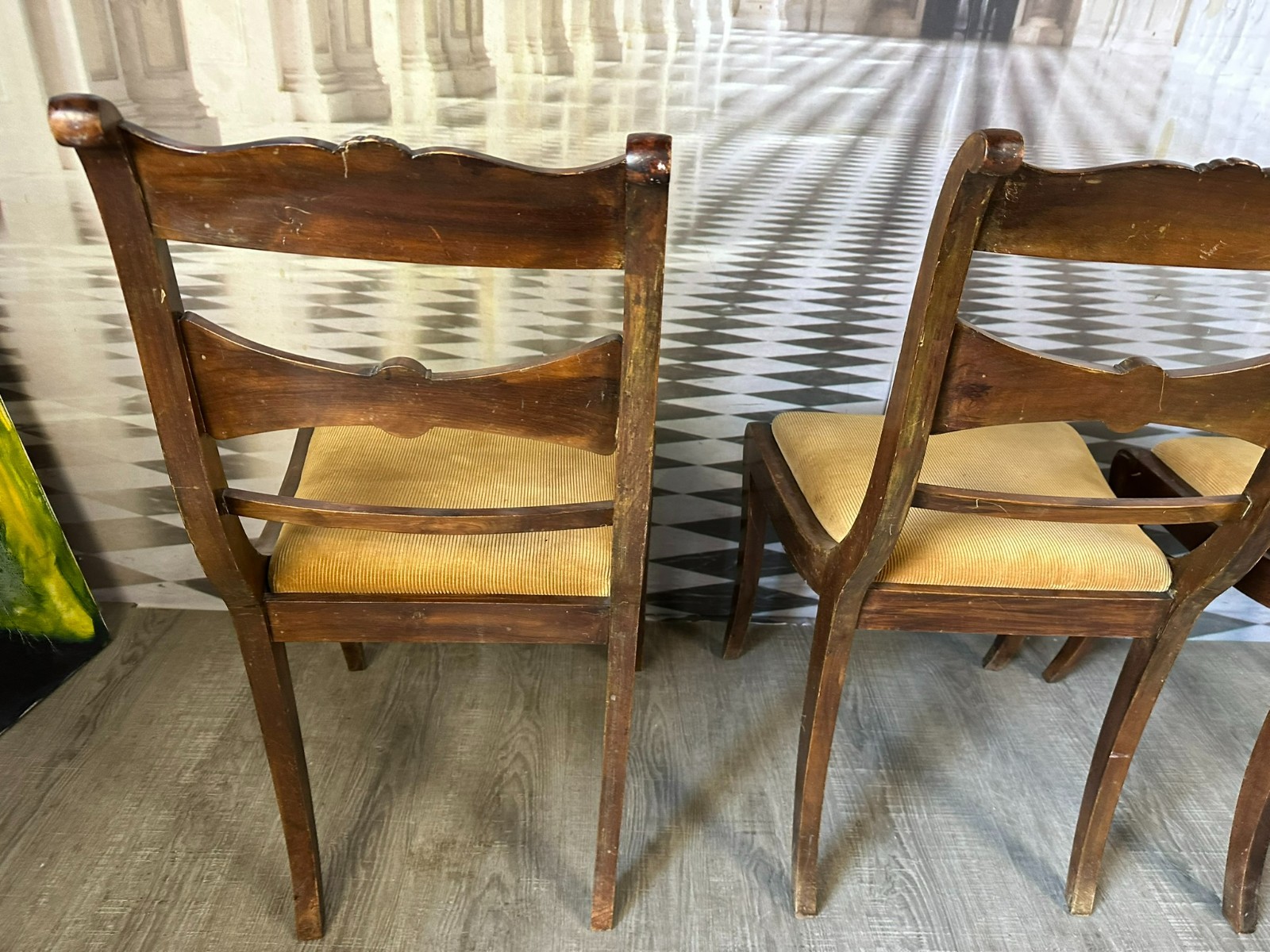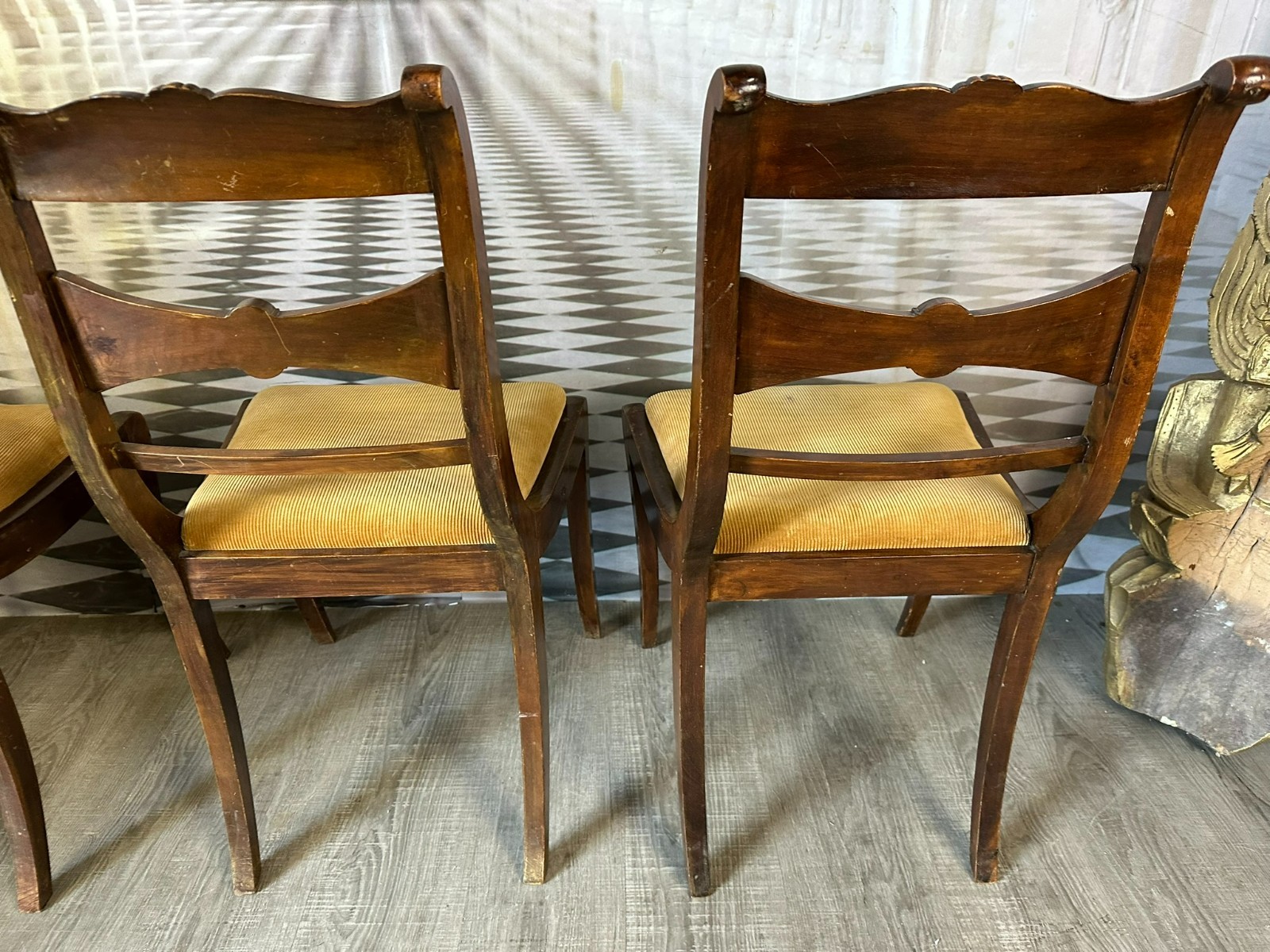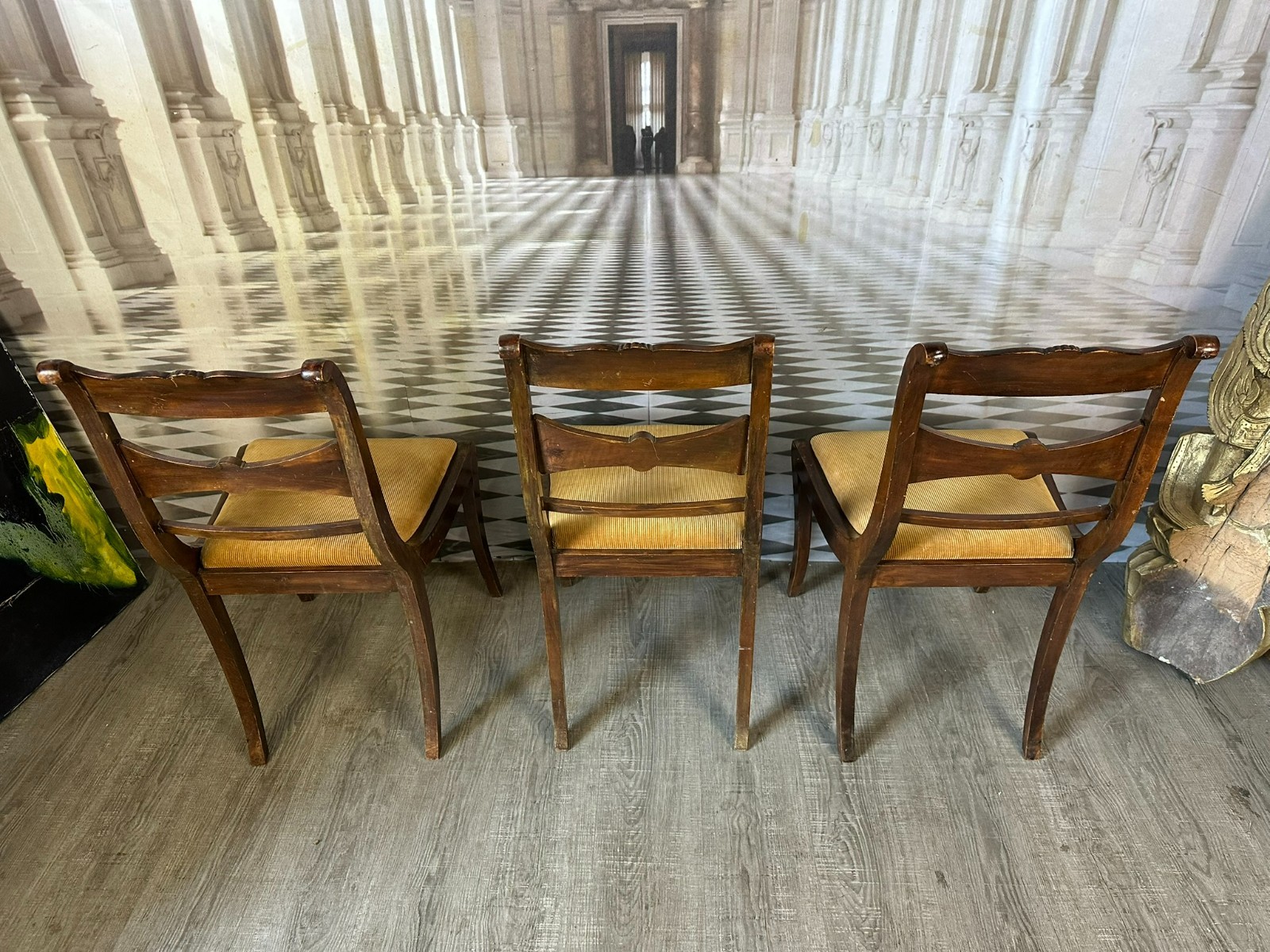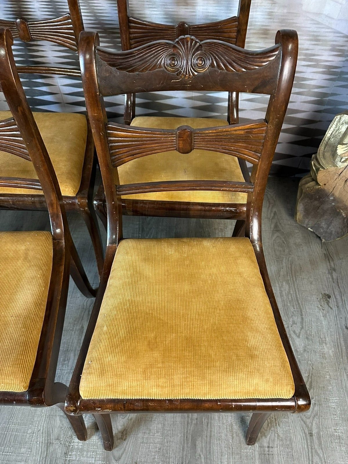 Set bestehend aus sechs antiken englischen Regency-Stühlen, 19-tes Jhdt. Die Sitzflächen wurden mal überarbeitet und sind leicht fleckig. Gestelle aus Mahagoni, dunkelbraun patiniert. Insgesamt Abrieb, kleiner Druckstellen und Nutzungsspuren. Die Füße zum Teil leicht krumm, die Stabilität wird dadurch nicht beeinträchtigt. Guter Sitzkomfort. Einer der sechs Stühle geht an einer hinteren Verbundstelle (siehe Foto) leicht auseinander. Abmessungen BTH 45/49/85cm, Sitzhöhe 47cm.