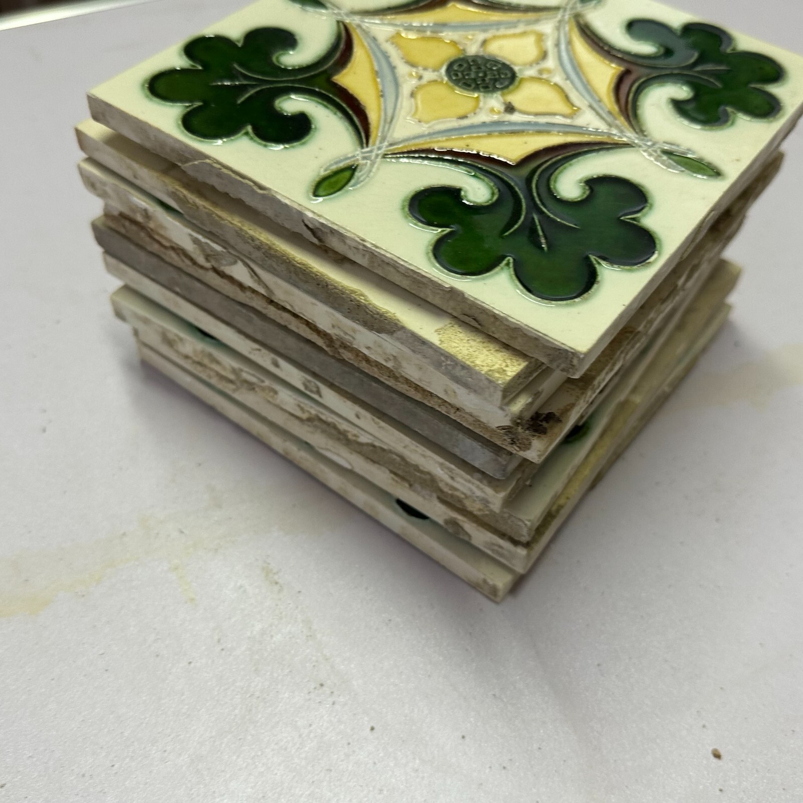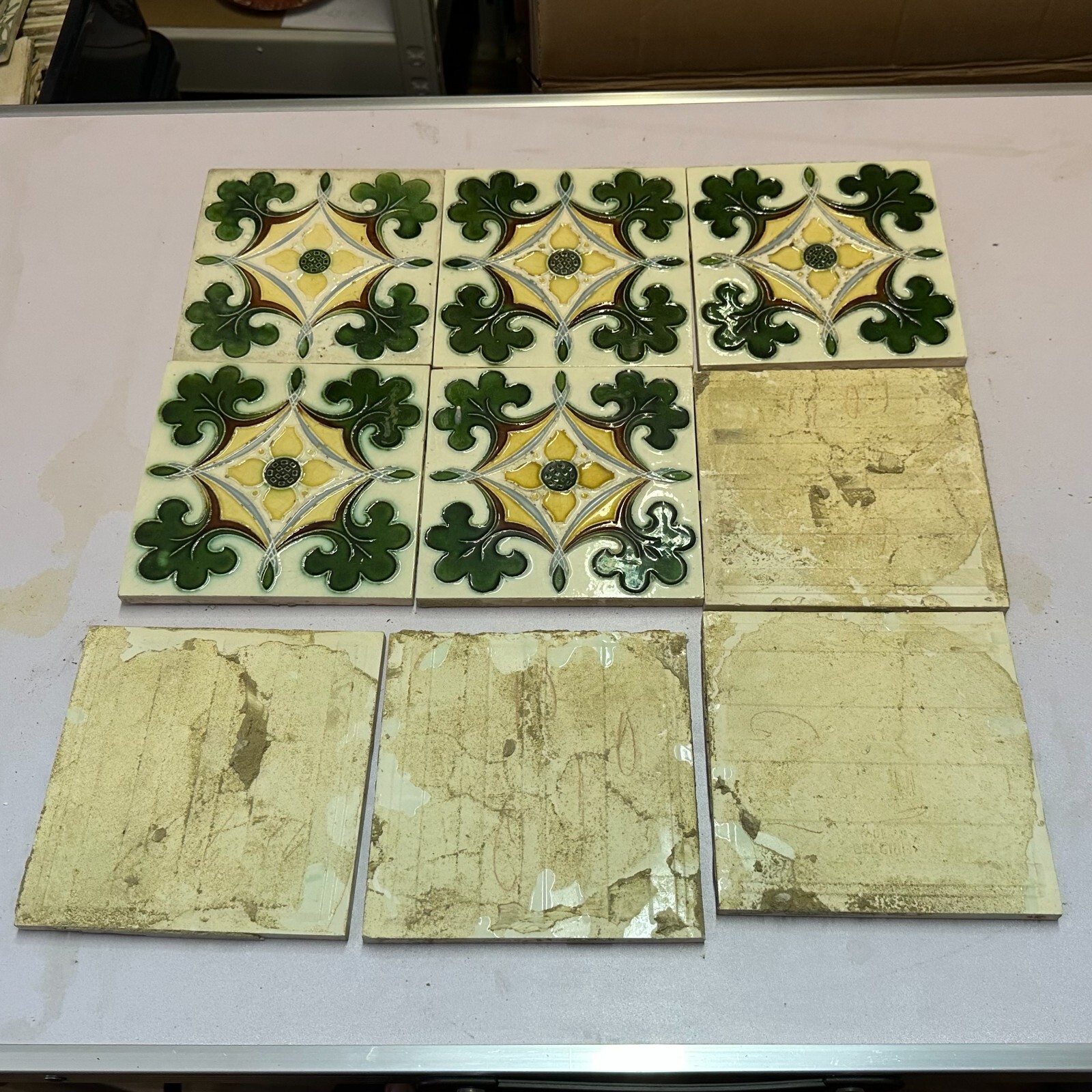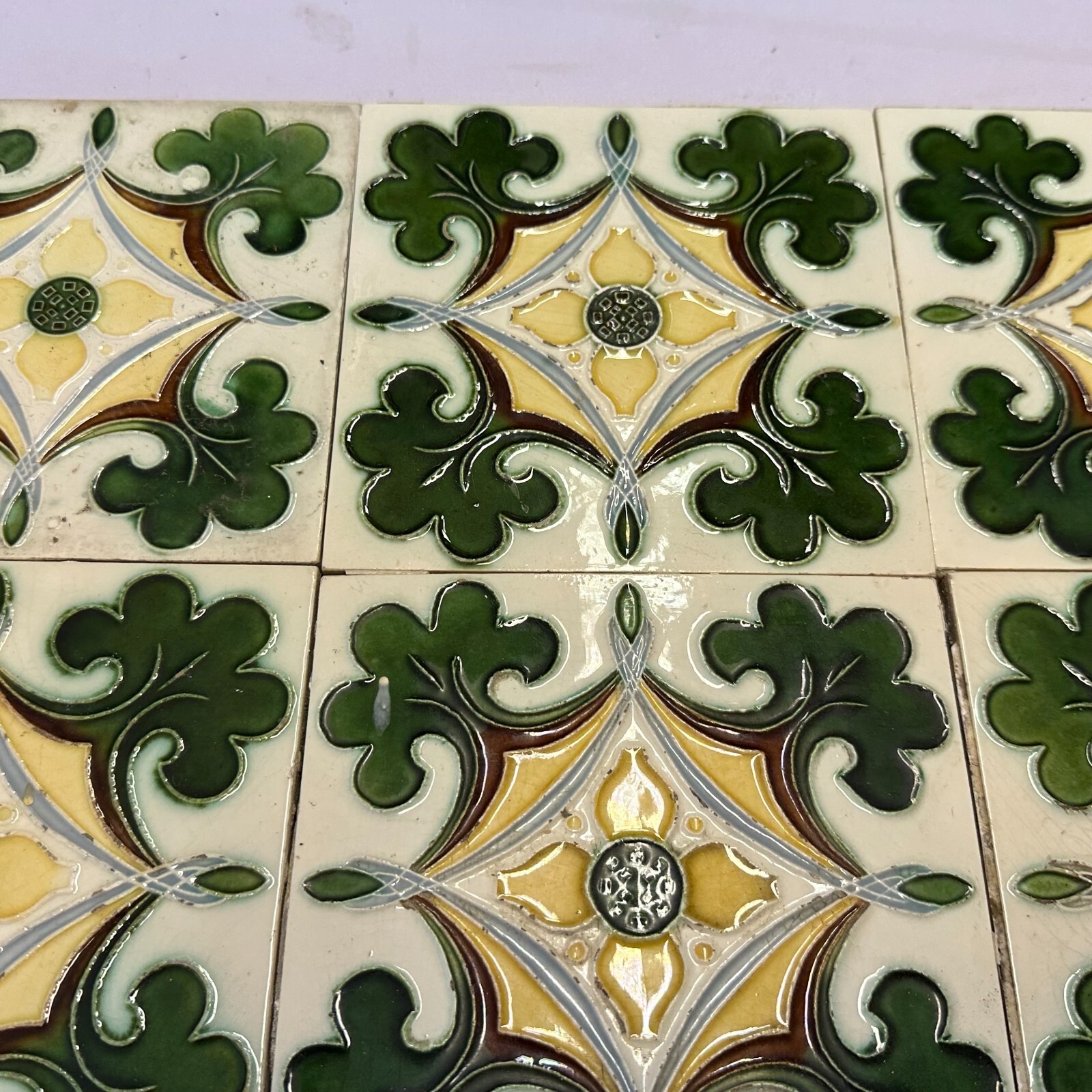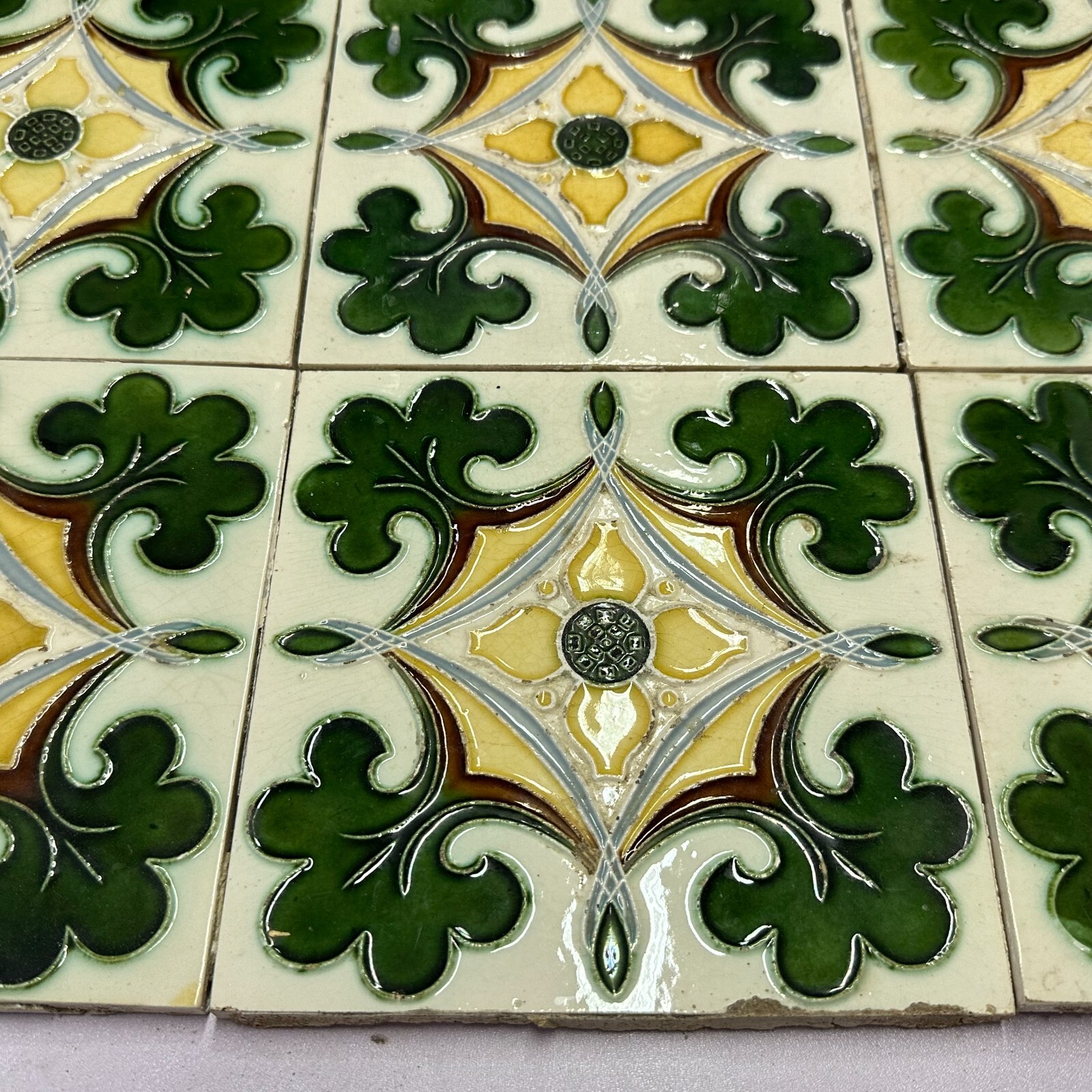 9x Antike Jugendstil Fliesen aus Keramik. Abmessungen je Fliese ca. 15x15x1cm. Die Fliesen waren bereits geklebt, an der Rückseite Reste von Mörtel. Oberfläche mit Nutzungsspuren (Chips, Kratzer, Sprünge, Krakelee, Farbreste möglich), den genauen Zustand entnehmen Sie bitte den Fotos.