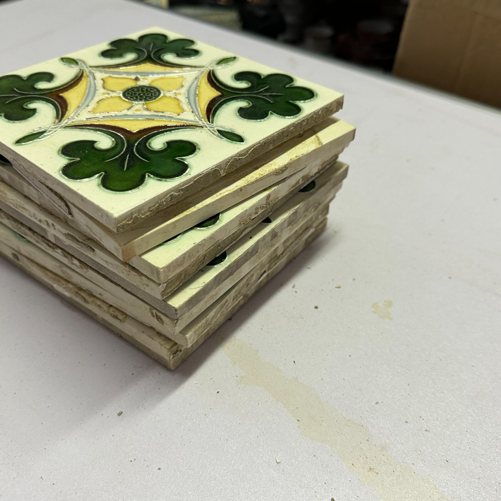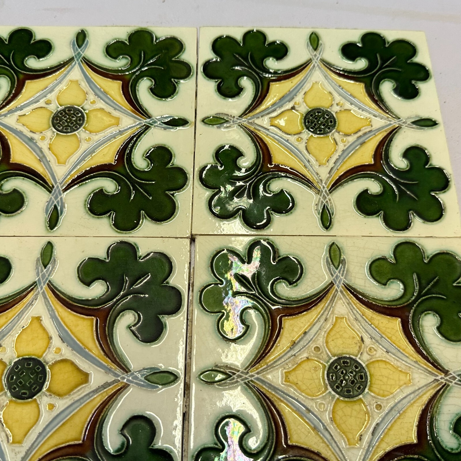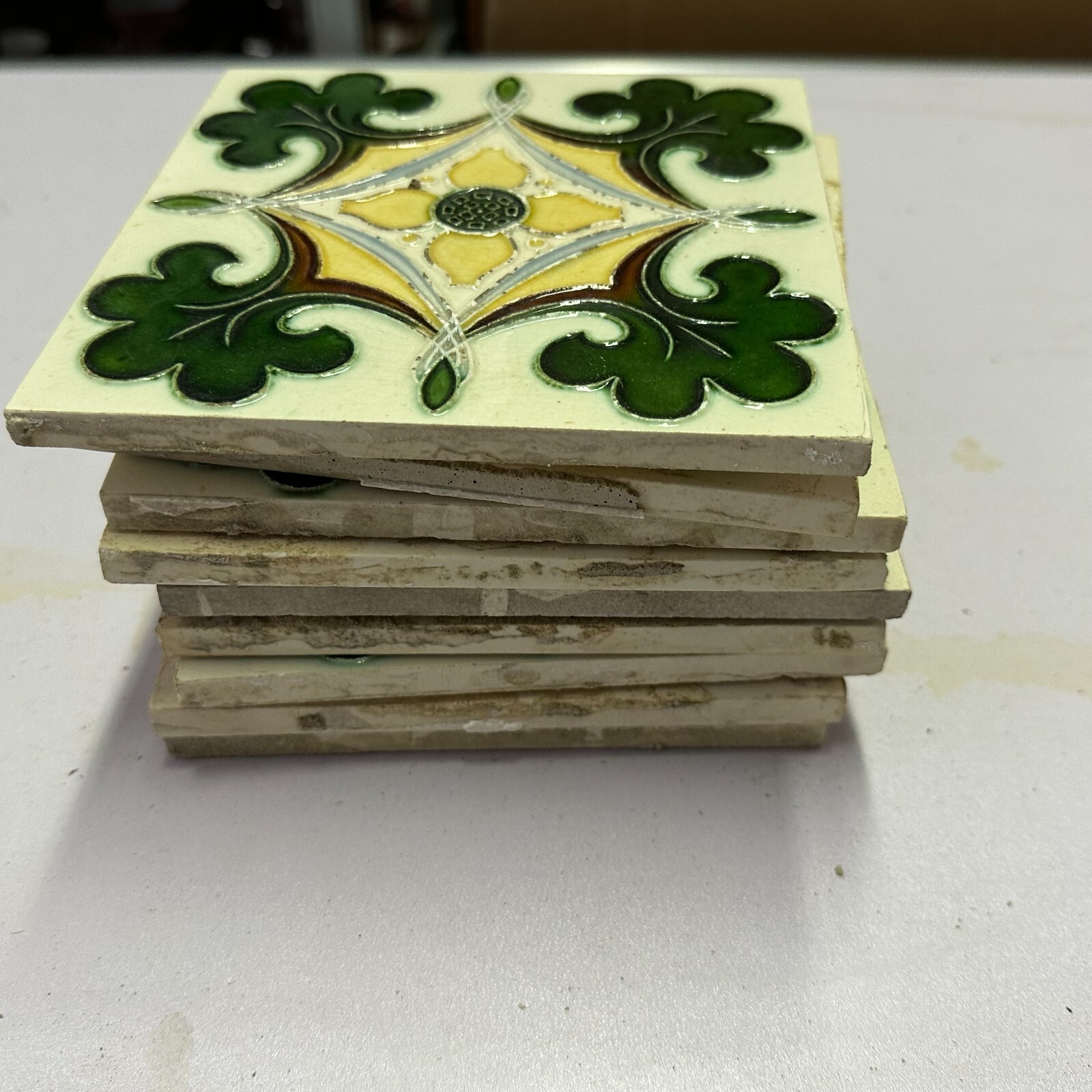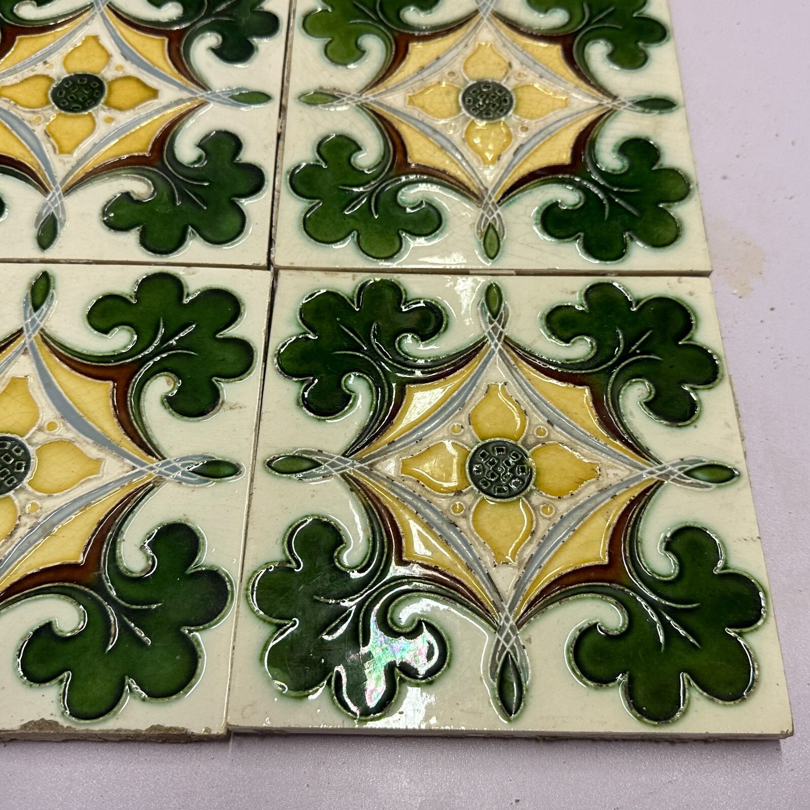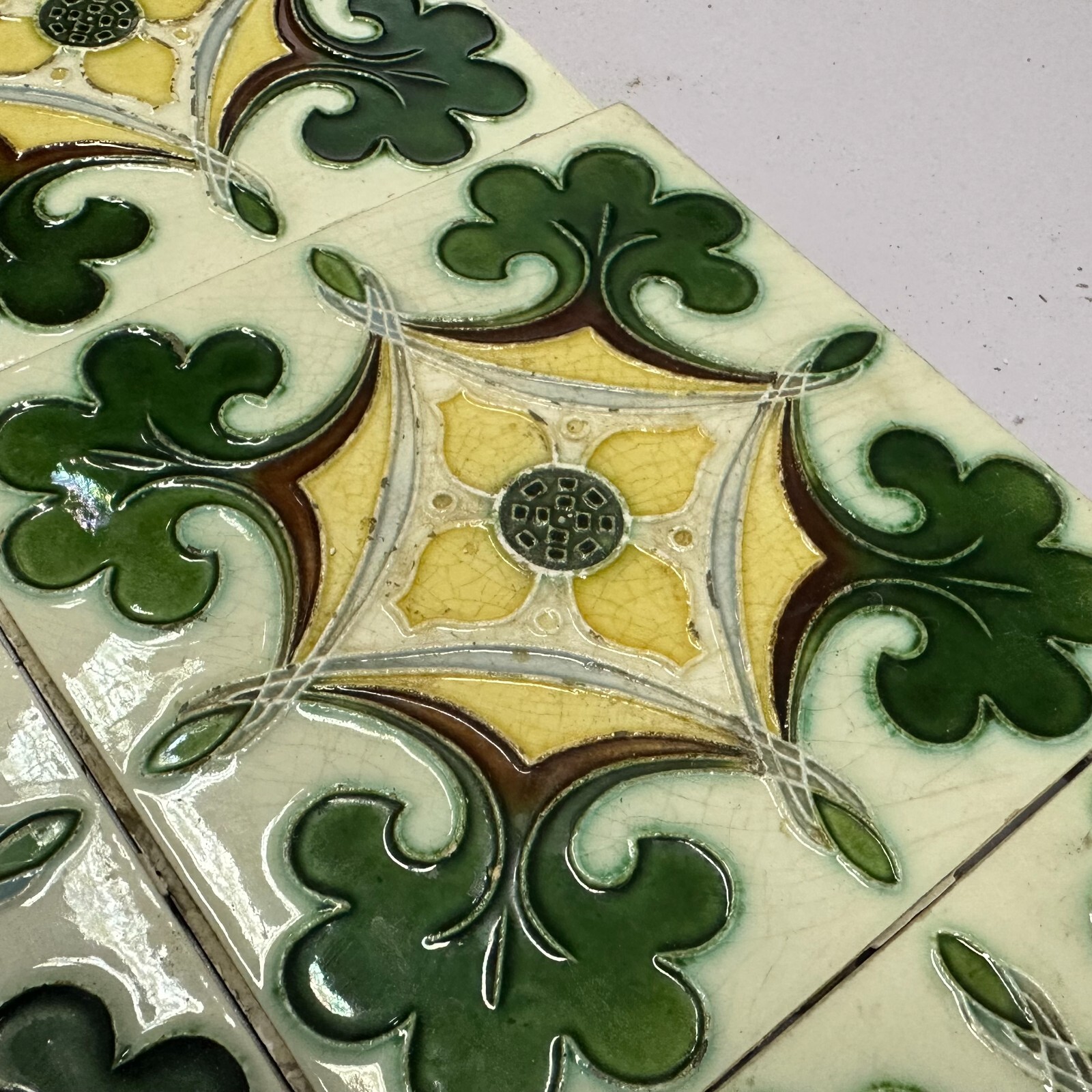 9x Antike Jugendstil Fliesen aus Keramik. Abmessungen je Fliese ca. 15x15x1cm. Die Fliesen waren bereits geklebt, an der Rückseite Reste von Mörtel. Oberfläche mit Nutzungsspuren (Chips, Kratzer, Sprünge, Krakelee, Farbreste möglich), den genauen Zustand entnehmen Sie bitte den Fotos.