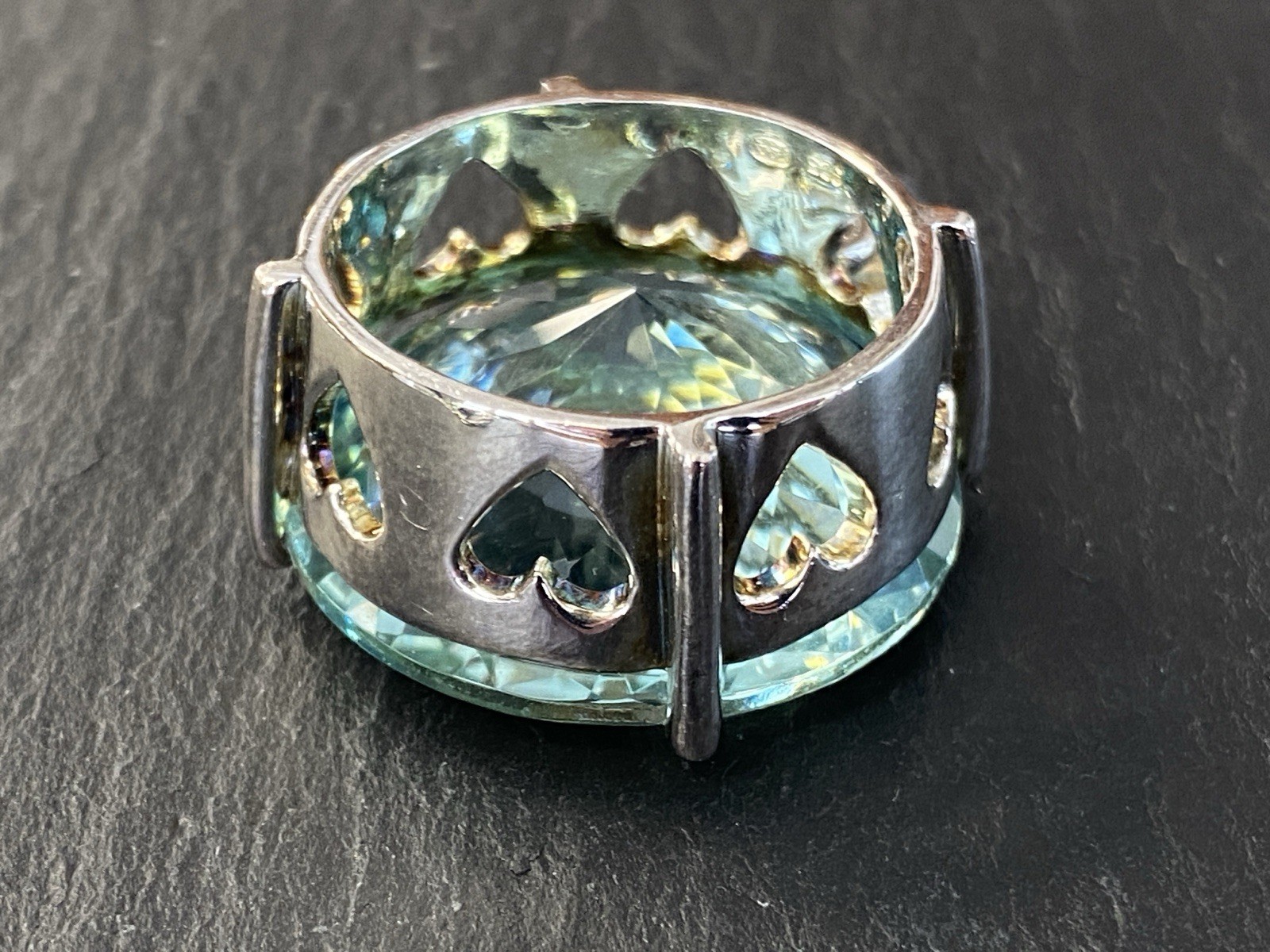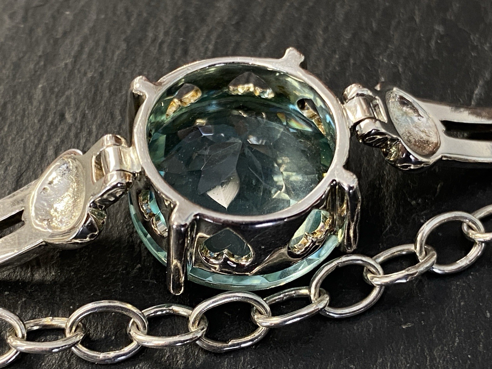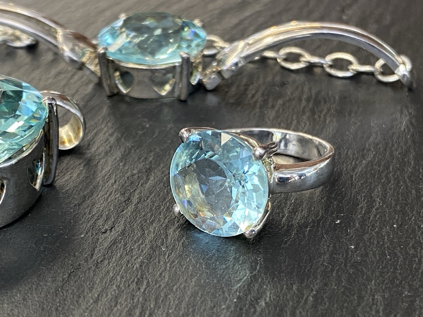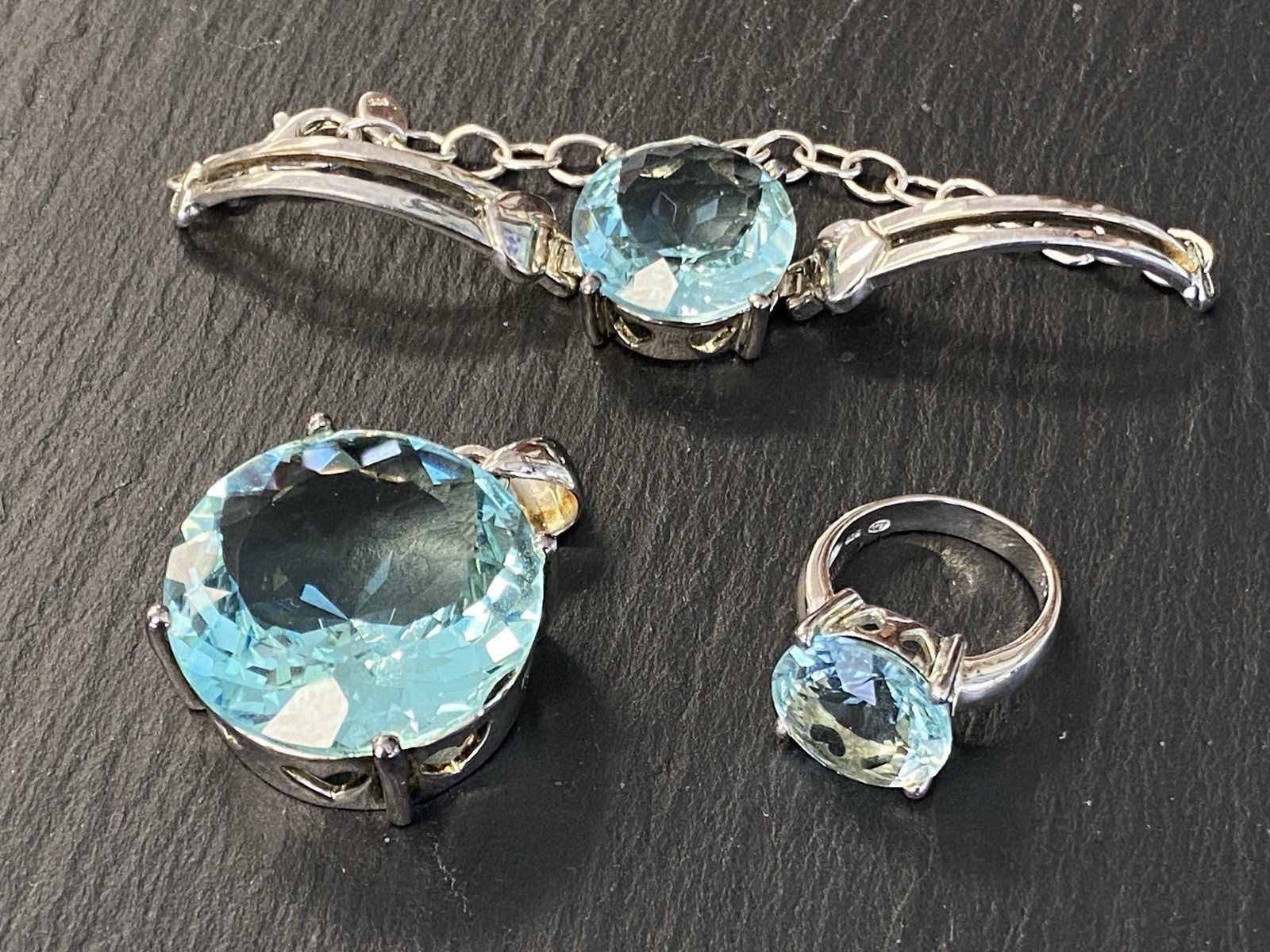 Modeschmuck Set bestehend aus einem Armband, einem Ring und einem Kettenanhänger mit Glassteinen in Aquamarinfarben, alle Teile sind mit 925 gestempelt. Die Glassteine sind bei allen 3 Teilen an den Kanten und besonders im Bereich der Grappen gebrochen, am Kettenanhänger ist es sichtbar, beim Ring und dem Armband erst bei genauerem hinschauen. BTH Anhänger 3/1,6/3,4cm, Gesamtgewicht ca. 26,00g. BTH des Mittelstücks am Ring 1,5/0,9/1,5cm, B/H der Ringschiene 0,4/0,1cm, Ringgröße 56, Gesamtgewicht ca. 6,96g. BTH des Mittelstücks am Armband 2/1,1/2cm, Durchmesser ca. 5cm, Länge der Verlängerungskette ca. 9,5cm, Gesamtgewicht ca. 20,00g.