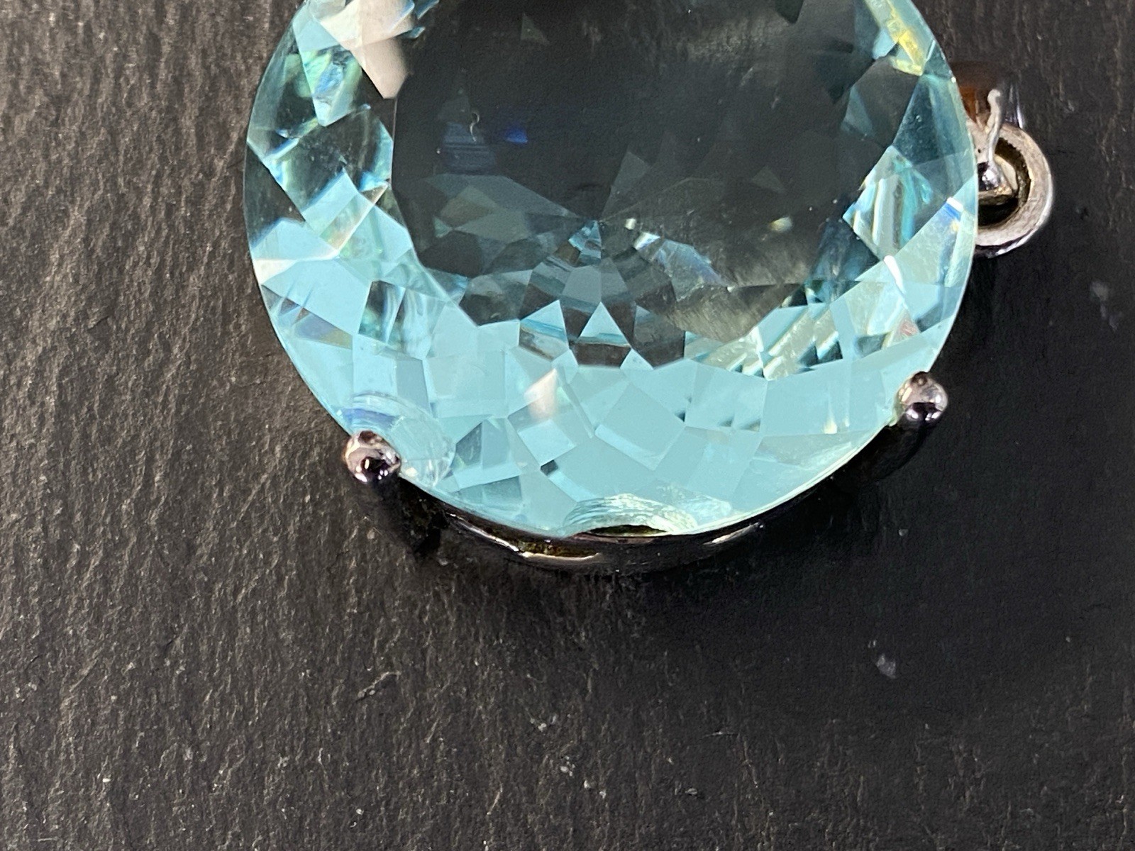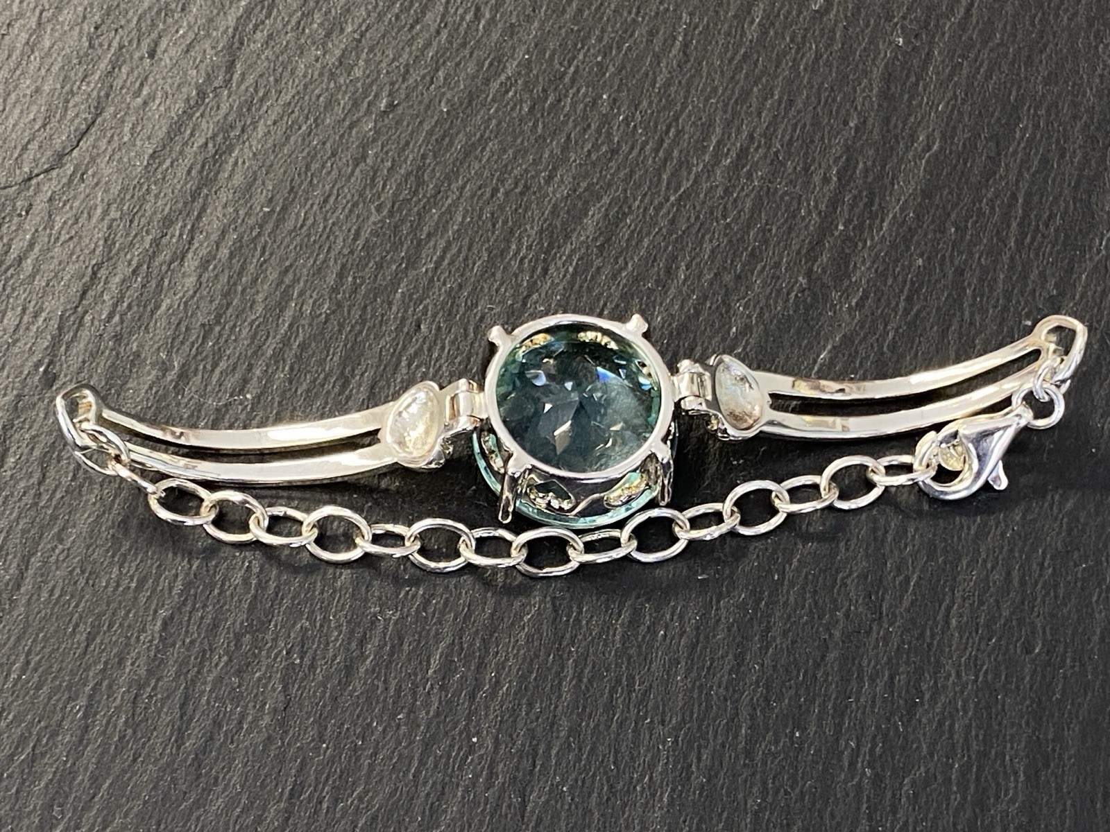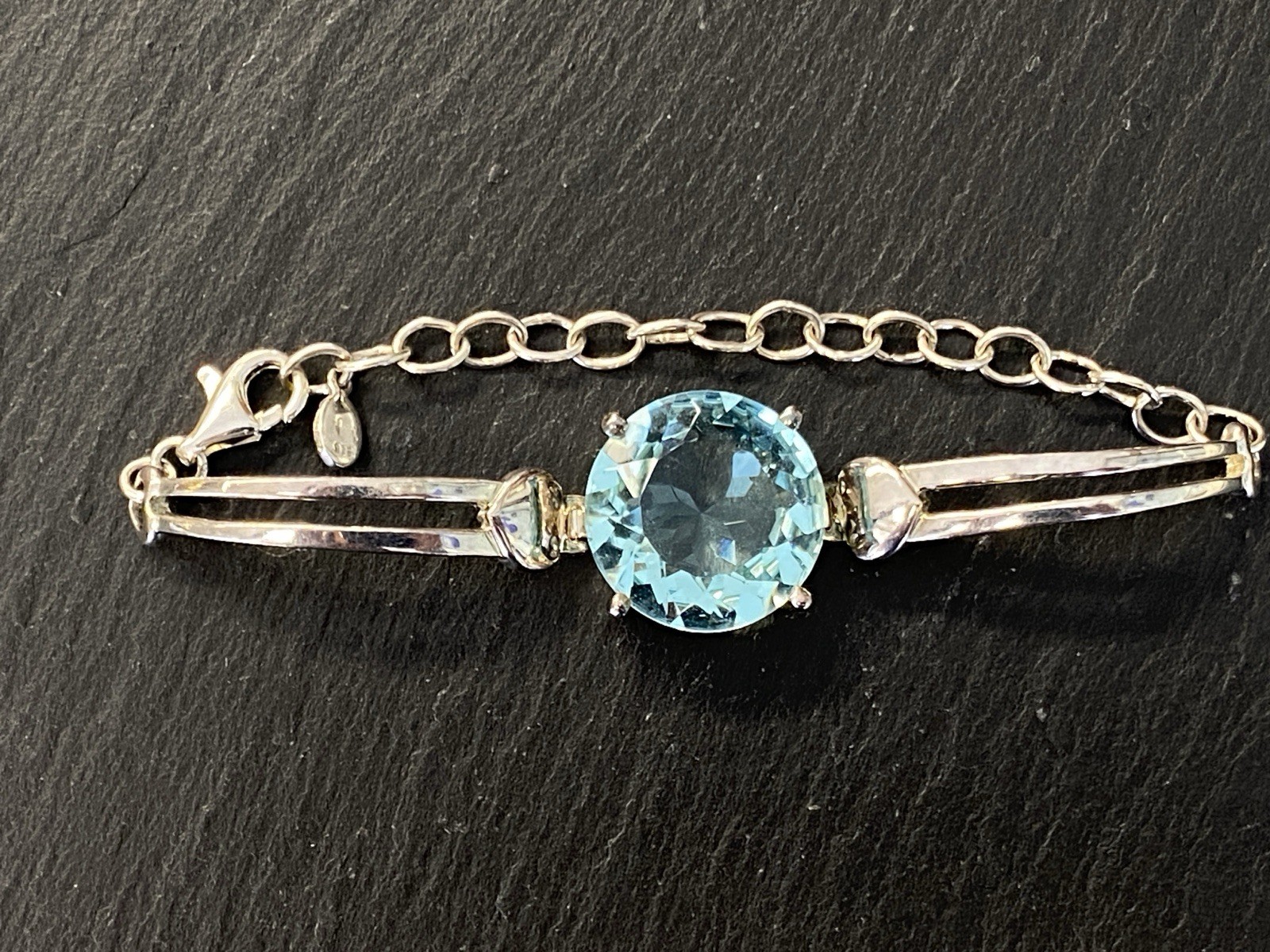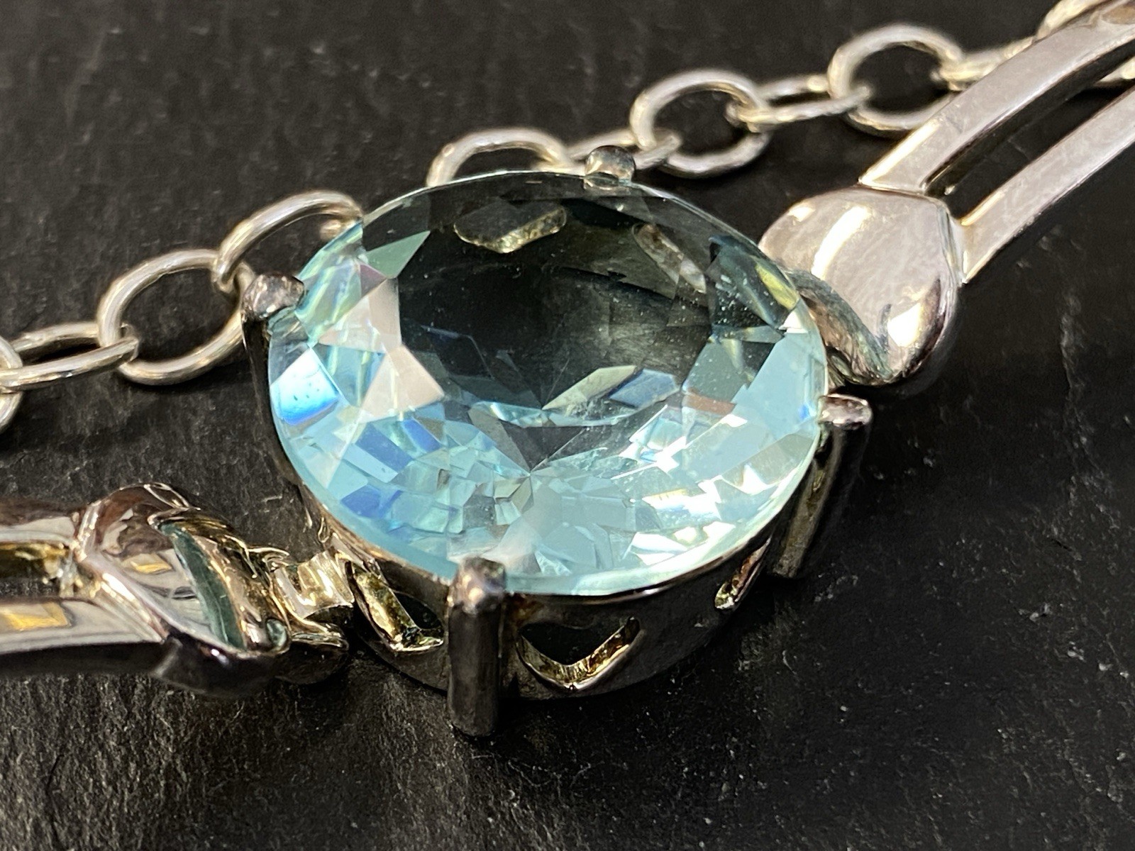 Modeschmuck Set bestehend aus einem Armband, einem Ring und einem Kettenanhänger mit Glassteinen in Aquamarinfarben, alle Teile sind mit 925 gestempelt. Die Glassteine sind bei allen 3 Teilen an den Kanten und besonders im Bereich der Grappen gebrochen, am Kettenanhänger ist es sichtbar, beim Ring und dem Armband erst bei genauerem hinschauen. BTH Anhänger 3/1,6/3,4cm, Gesamtgewicht ca. 26,00g. BTH des Mittelstücks am Ring 1,5/0,9/1,5cm, B/H der Ringschiene 0,4/0,1cm, Ringgröße 56, Gesamtgewicht ca. 6,96g. BTH des Mittelstücks am Armband 2/1,1/2cm, Durchmesser ca. 5cm, Länge der Verlängerungskette ca. 9,5cm, Gesamtgewicht ca. 20,00g.