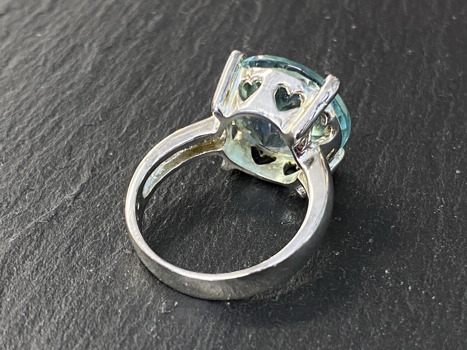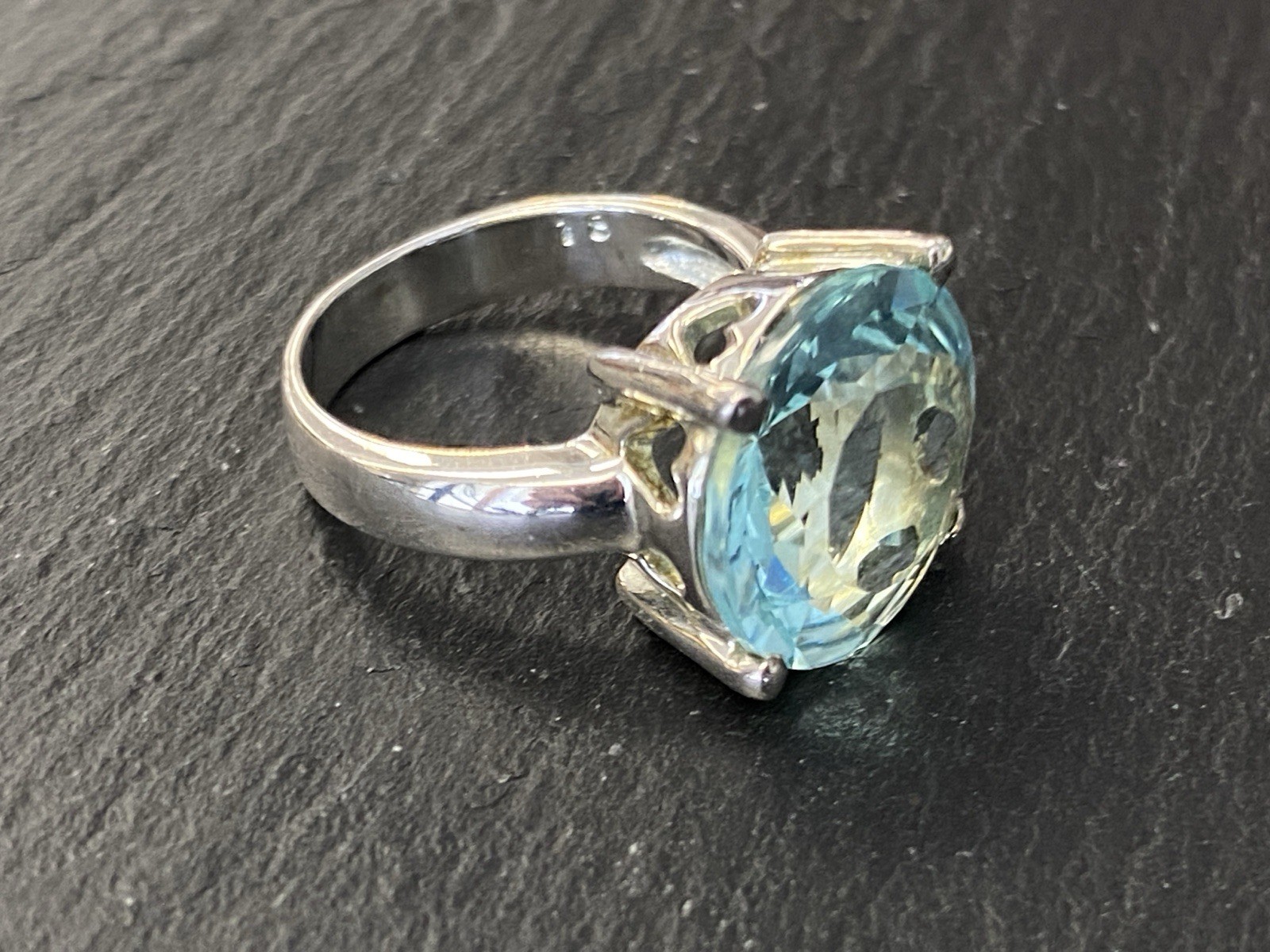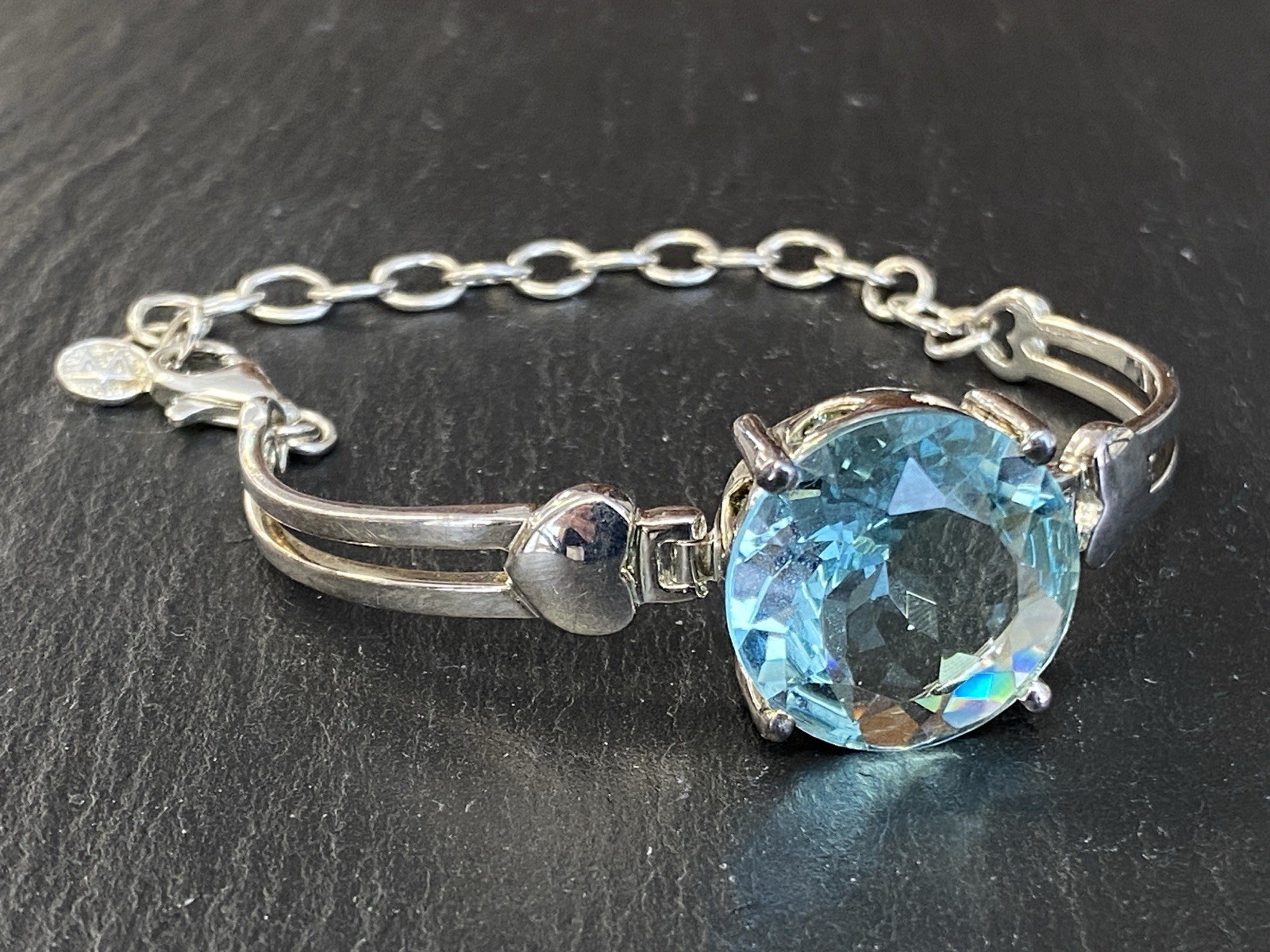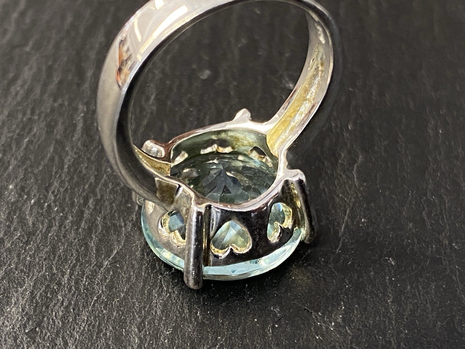 Modeschmuck Set bestehend aus einem Armband, einem Ring und einem Kettenanhänger mit Glassteinen in Aquamarinfarben, alle Teile sind mit 925 gestempelt. Die Glassteine sind bei allen 3 Teilen an den Kanten und besonders im Bereich der Grappen gebrochen, am Kettenanhänger ist es sichtbar, beim Ring und dem Armband erst bei genauerem hinschauen. BTH Anhänger 3/1,6/3,4cm, Gesamtgewicht ca. 26,00g. BTH des Mittelstücks am Ring 1,5/0,9/1,5cm, B/H der Ringschiene 0,4/0,1cm, Ringgröße 56, Gesamtgewicht ca. 6,96g. BTH des Mittelstücks am Armband 2/1,1/2cm, Durchmesser ca. 5cm, Länge der Verlängerungskette ca. 9,5cm, Gesamtgewicht ca. 20,00g.