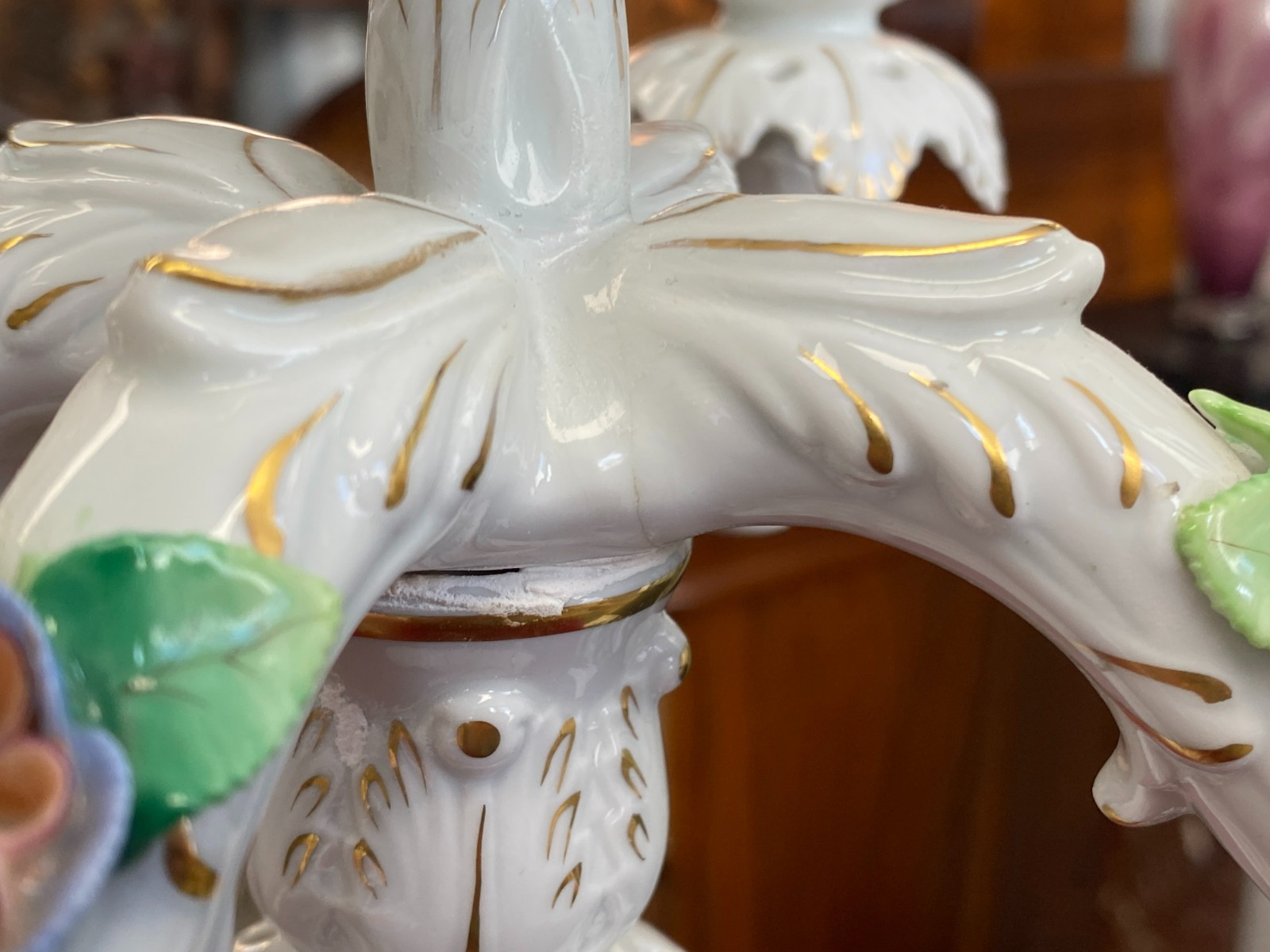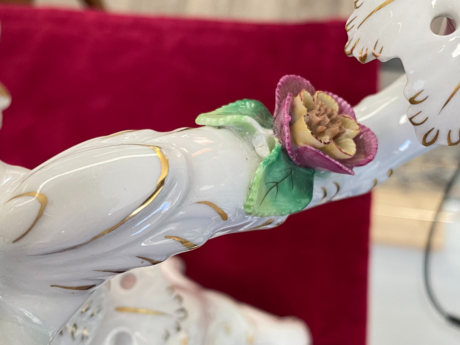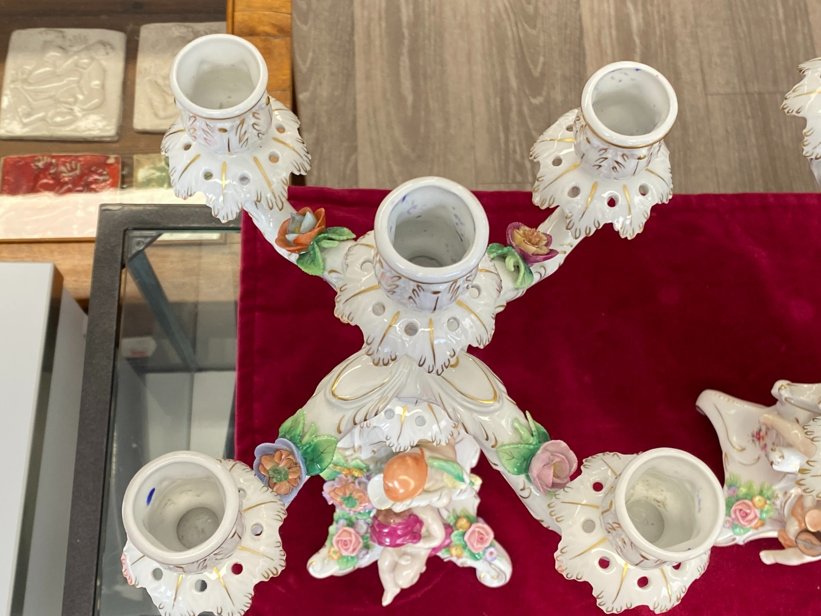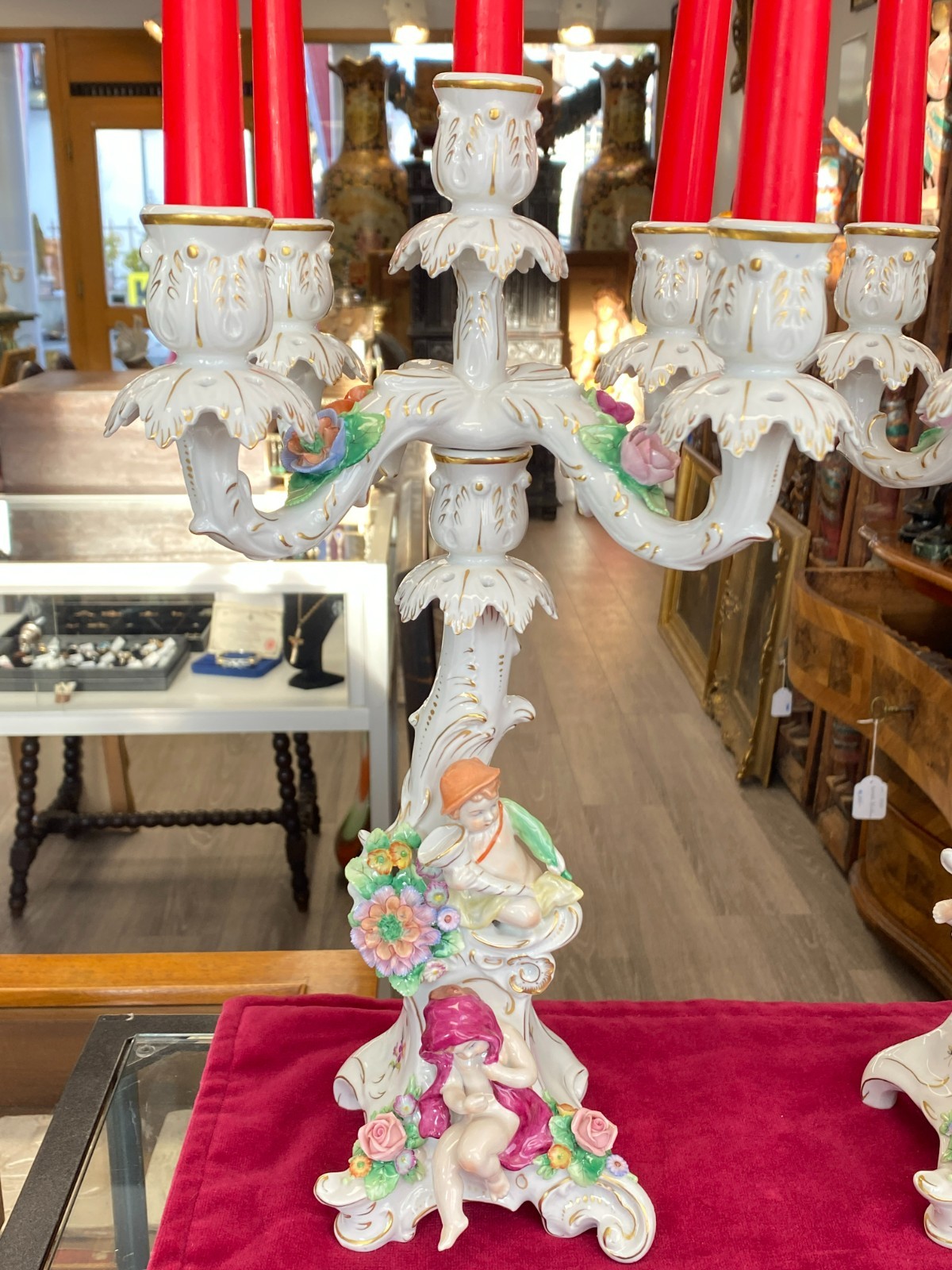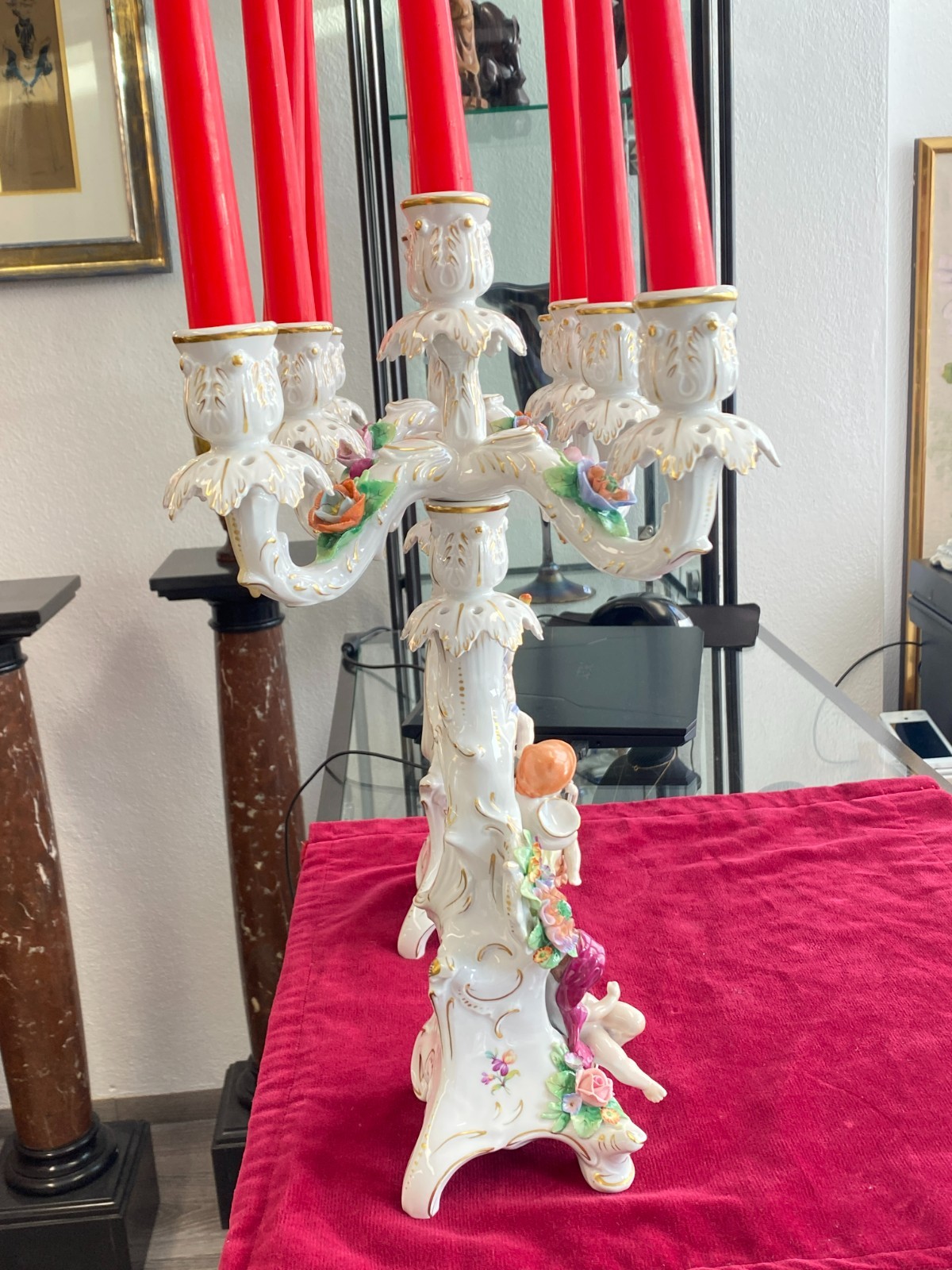 Sehr dekoratives Paar fünfarmige Kerzenleuchter mit floralem Dekor und kleinen Putten. Der Stempel auf der Unterseite zeigt Manufaktur Sitzendorf. Einer der Kerzenhalter mehrfach gebrochen und altgeklebt, teils sind die Kleberreste zu sehen. Wir haben wenige Abplatzer an den Kerzenleuchtern erkennen können, wir haben diese in den Produktbildern festgehalten. Oberfläche handbemalt. Die Arme wurden auf den Aufsatz geklebt, einer der Arme war wohl mal gebrochen und wurde professionell befestigt, hier sieht man nur noch einen feinen Riss in der Glasur. Die Vergoldung ist größtenteils intakt, den genauen Zustand entnehmen Sie bitte den Produktbildern. (Lieferung ohne Kerzen) Gesamthöhe ohne Kerzen ca. 41,8cm, Breite im oberen Bereich ca. 21cm. Gerne würden wir hier aus Sicherheitsgründen auf den Postversand verzichten und bieten die Möglichkeit einer Abholung oder der Lieferung per Spediteur an.