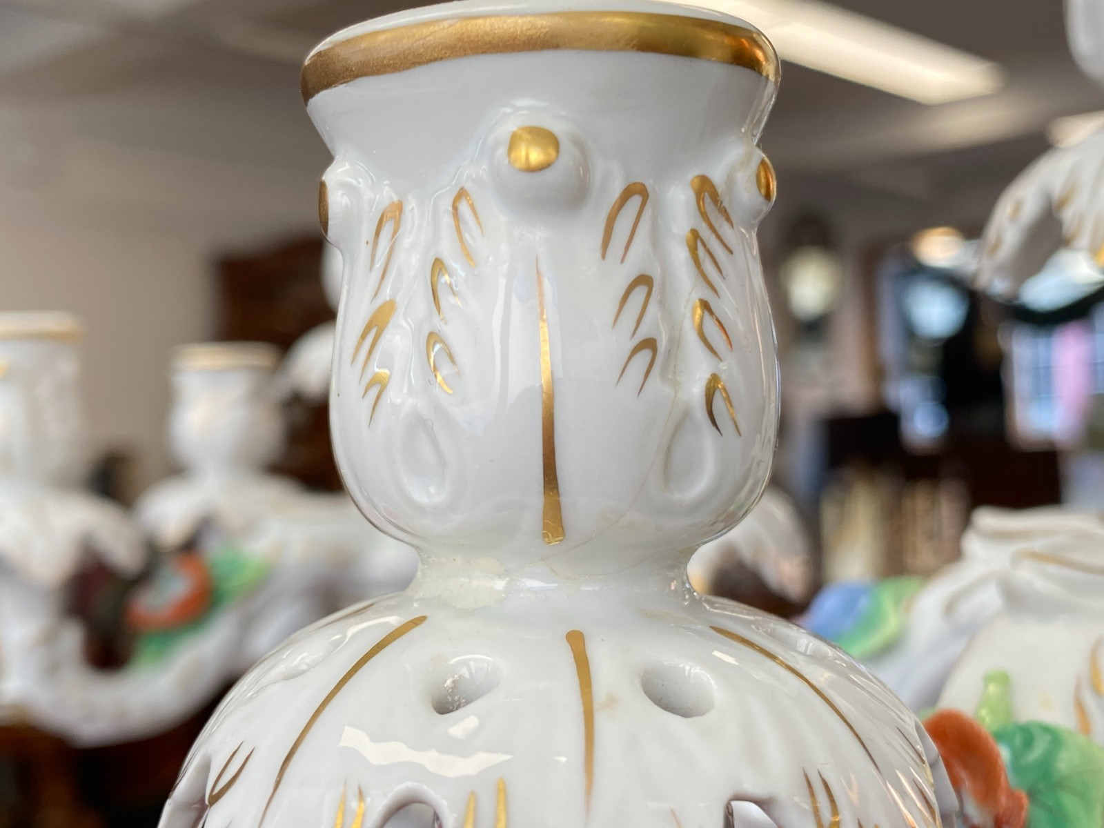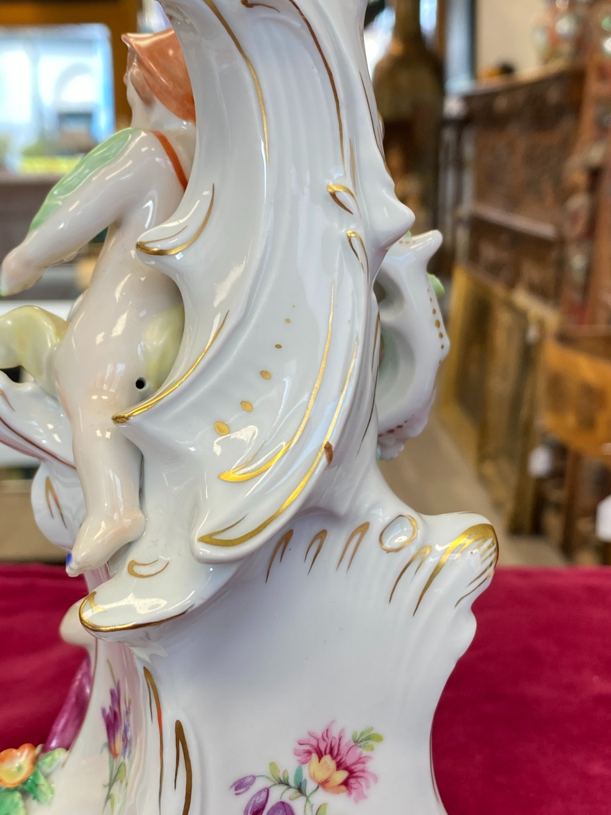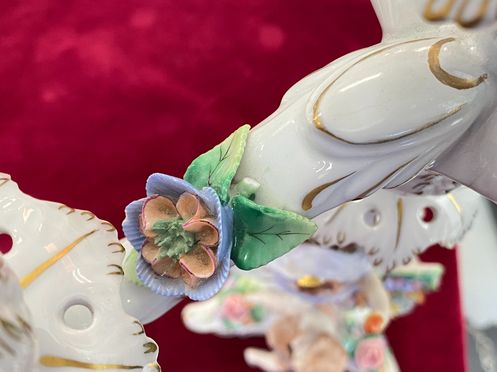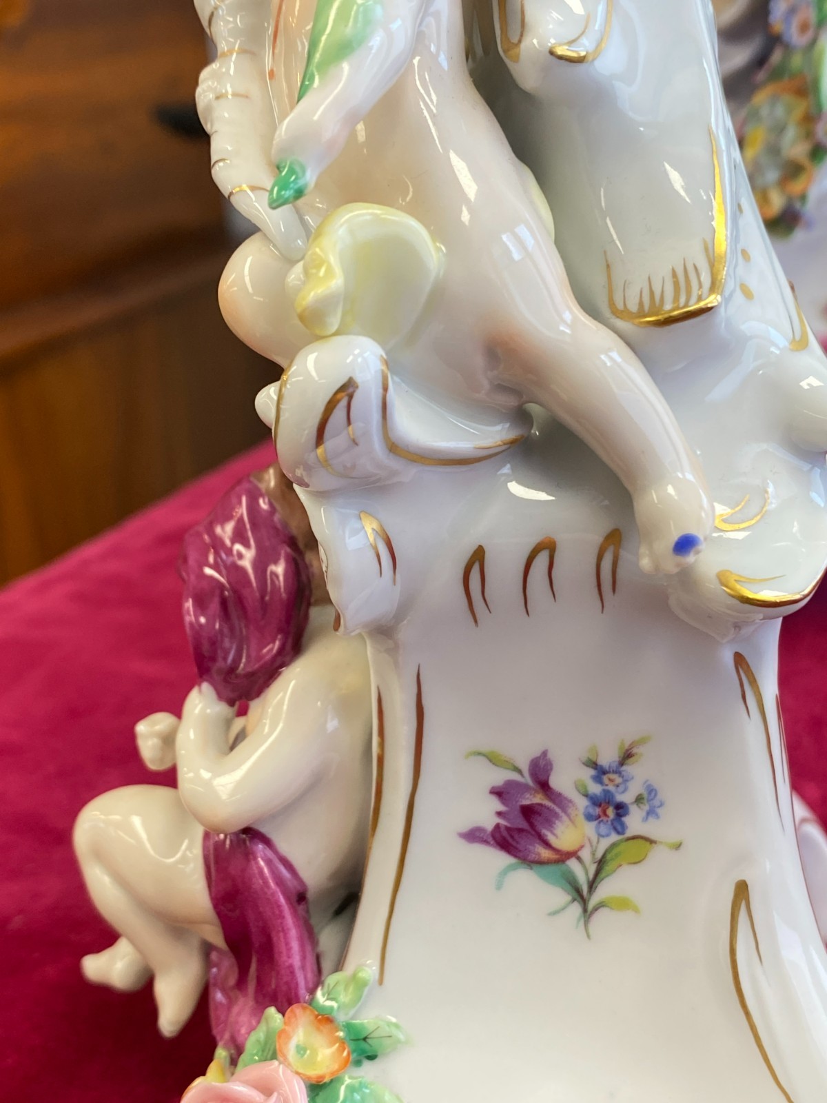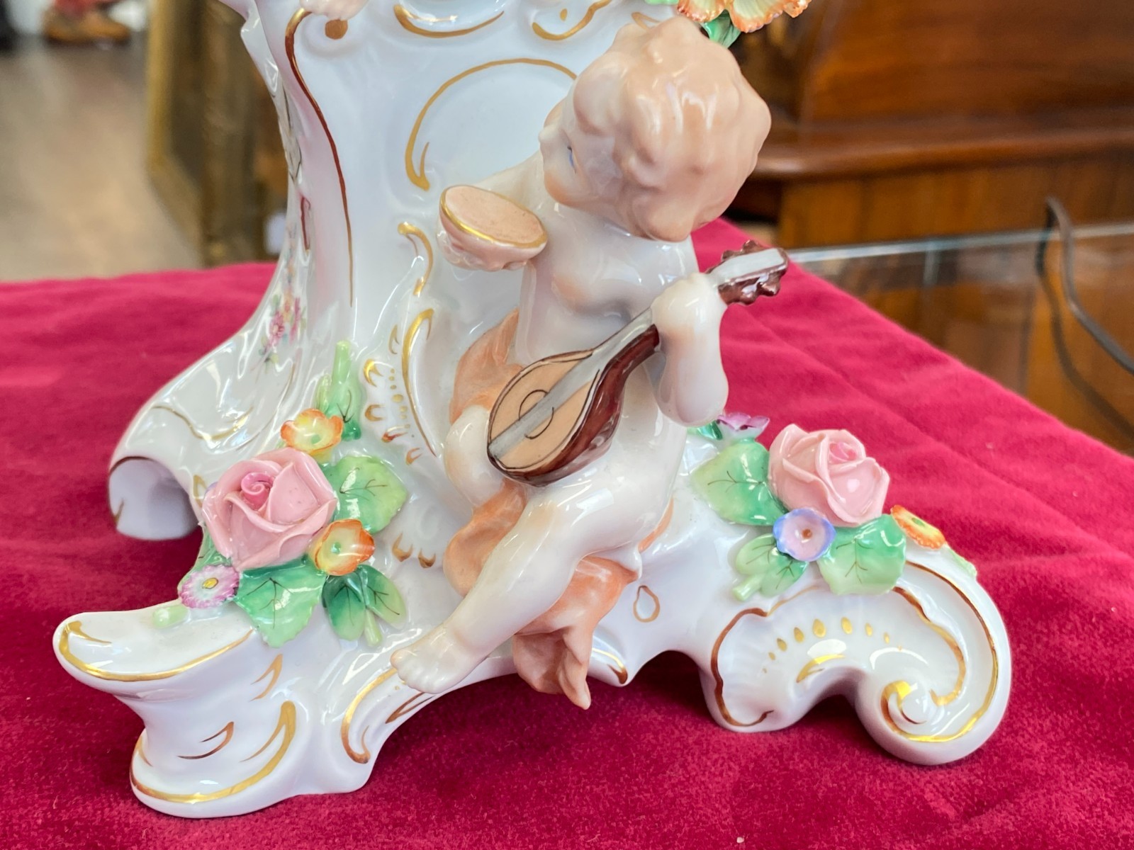 Sehr dekoratives Paar fünfarmige Kerzenleuchter mit floralem Dekor und kleinen Putten. Der Stempel auf der Unterseite zeigt Manufaktur Sitzendorf. Einer der Kerzenhalter mehrfach gebrochen und altgeklebt, teils sind die Kleberreste zu sehen. Wir haben wenige Abplatzer an den Kerzenleuchtern erkennen können, wir haben diese in den Produktbildern festgehalten. Oberfläche handbemalt. Die Arme wurden auf den Aufsatz geklebt, einer der Arme war wohl mal gebrochen und wurde professionell befestigt, hier sieht man nur noch einen feinen Riss in der Glasur. Die Vergoldung ist größtenteils intakt, den genauen Zustand entnehmen Sie bitte den Produktbildern. (Lieferung ohne Kerzen) Gesamthöhe ohne Kerzen ca. 41,8cm, Breite im oberen Bereich ca. 21cm. Gerne würden wir hier aus Sicherheitsgründen auf den Postversand verzichten und bieten die Möglichkeit einer Abholung oder der Lieferung per Spediteur an.