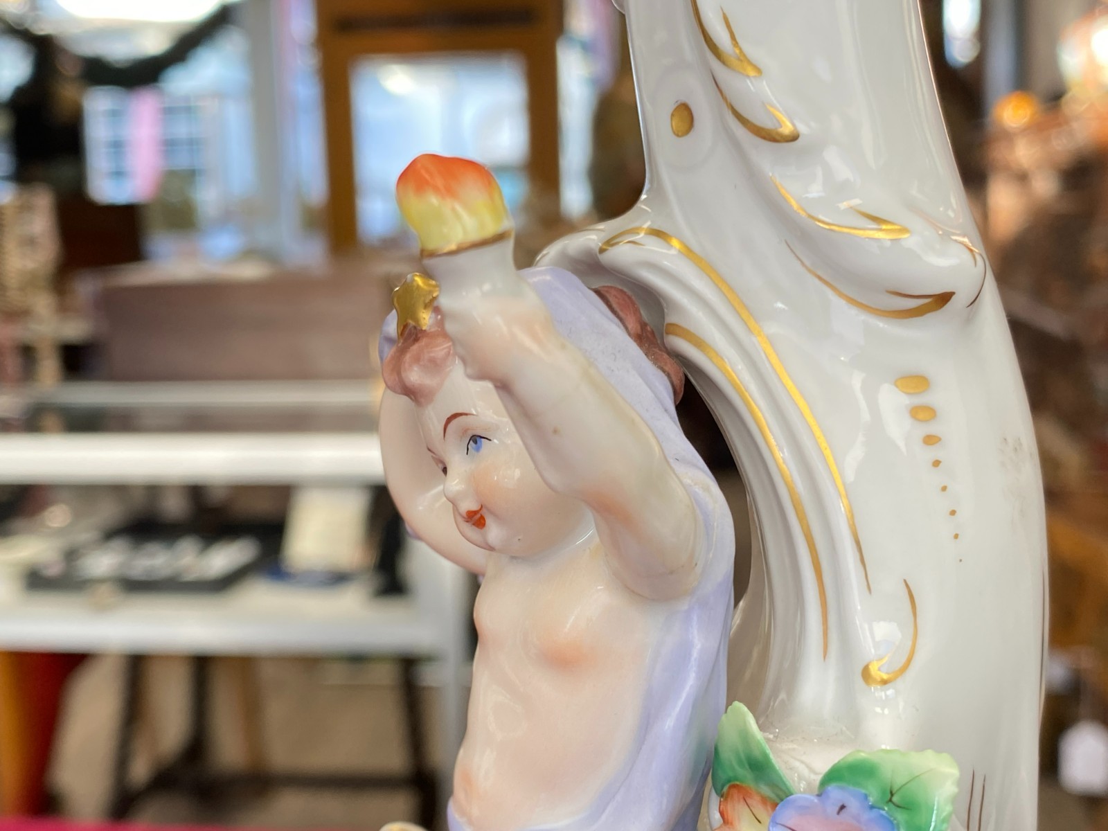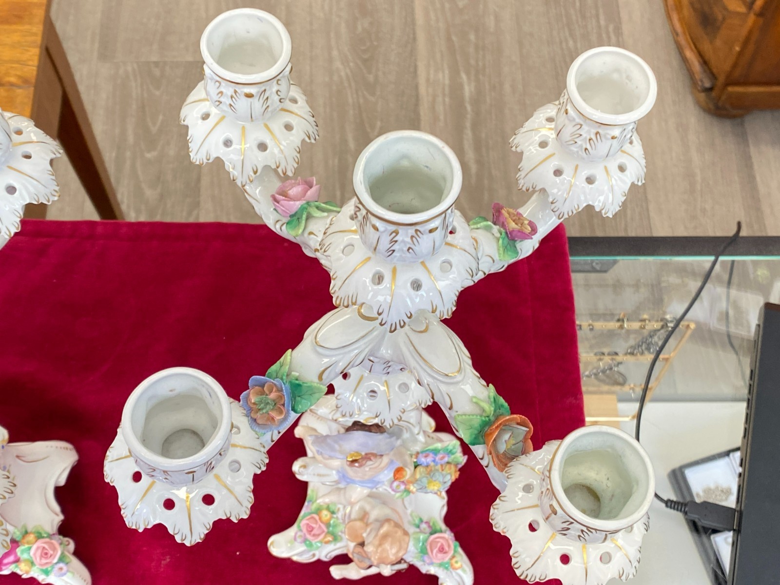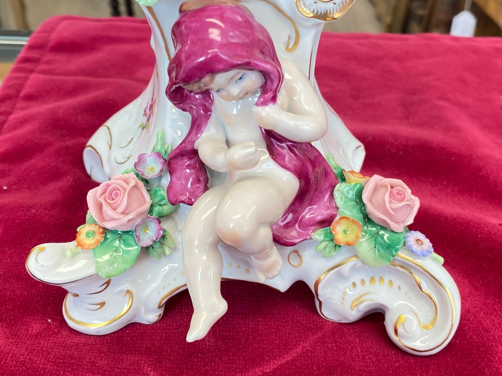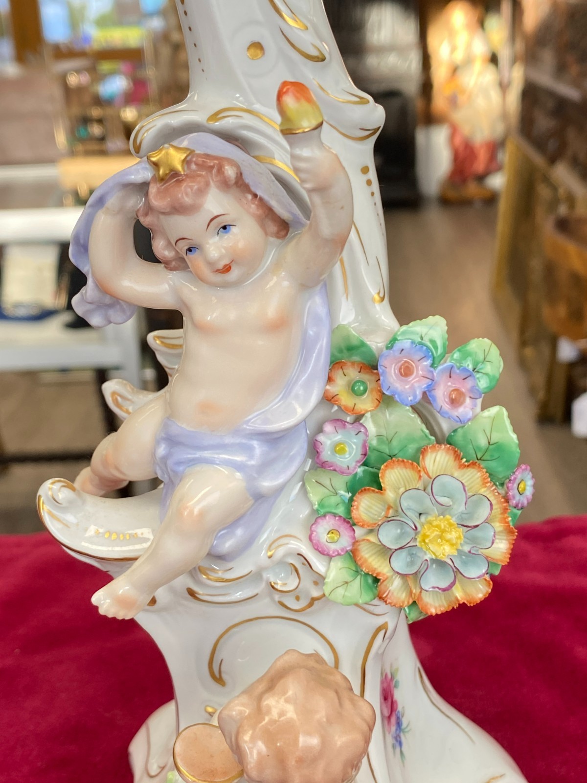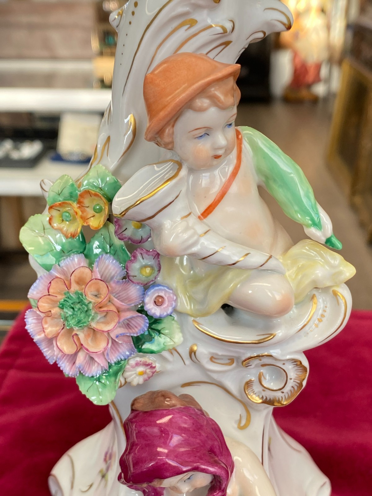 Sehr dekoratives Paar fünfarmige Kerzenleuchter mit floralem Dekor und kleinen Putten. Der Stempel auf der Unterseite zeigt Manufaktur Sitzendorf. Einer der Kerzenhalter mehrfach gebrochen und altgeklebt, teils sind die Kleberreste zu sehen. Wir haben wenige Abplatzer an den Kerzenleuchtern erkennen können, wir haben diese in den Produktbildern festgehalten. Oberfläche handbemalt. Die Arme wurden auf den Aufsatz geklebt, einer der Arme war wohl mal gebrochen und wurde professionell befestigt, hier sieht man nur noch einen feinen Riss in der Glasur. Die Vergoldung ist größtenteils intakt, den genauen Zustand entnehmen Sie bitte den Produktbildern. (Lieferung ohne Kerzen) Gesamthöhe ohne Kerzen ca. 41,8cm, Breite im oberen Bereich ca. 21cm. Gerne würden wir hier aus Sicherheitsgründen auf den Postversand verzichten und bieten die Möglichkeit einer Abholung oder der Lieferung per Spediteur an.