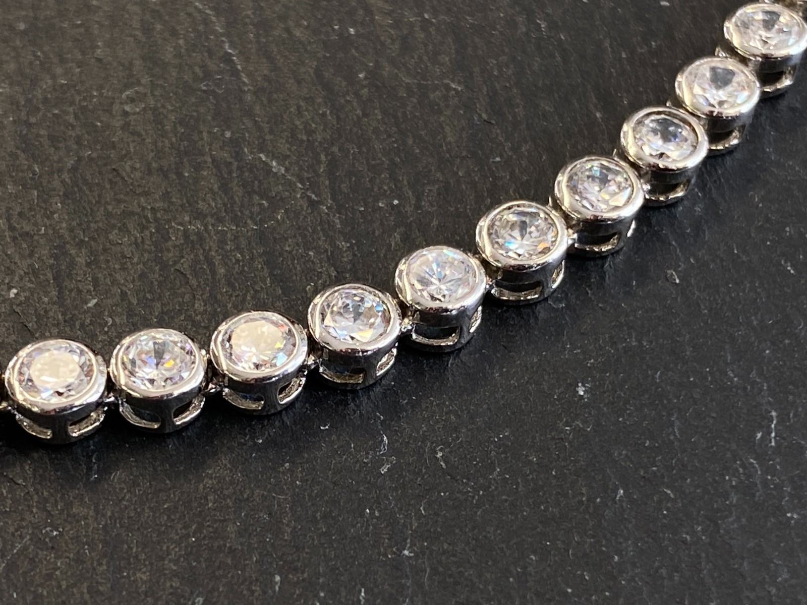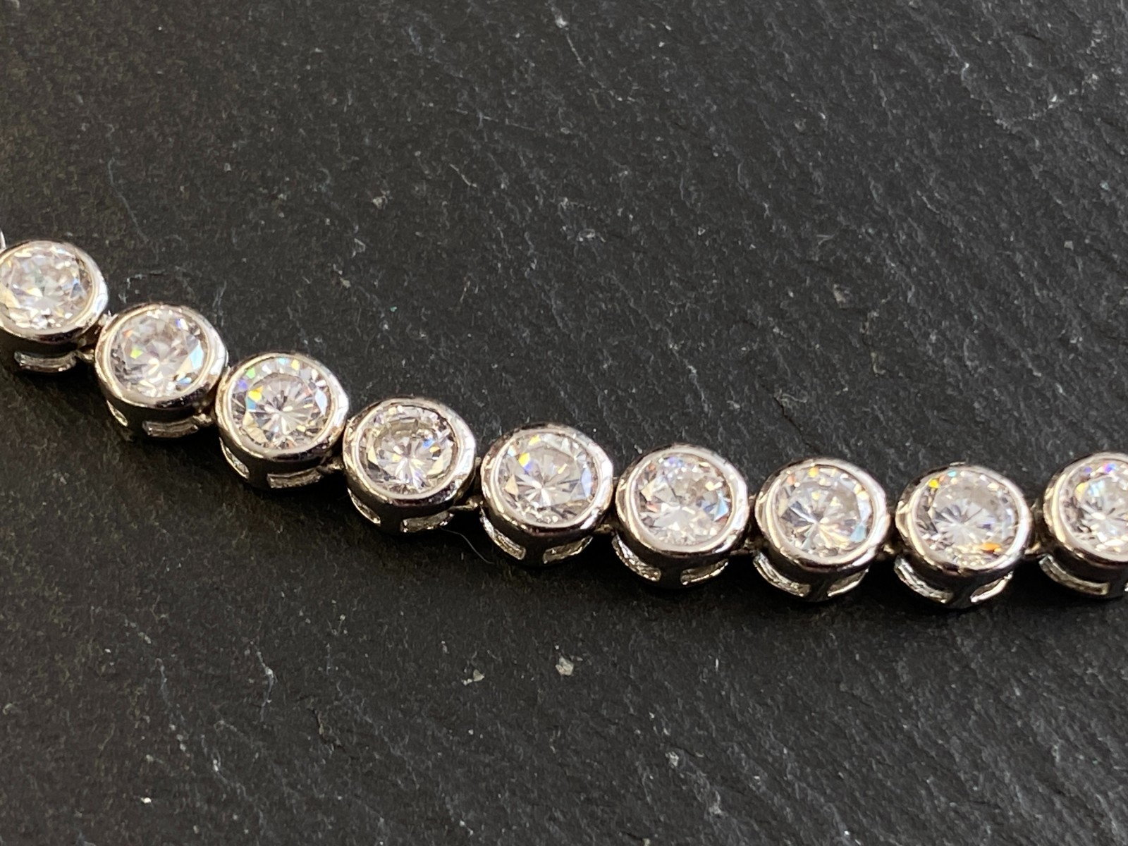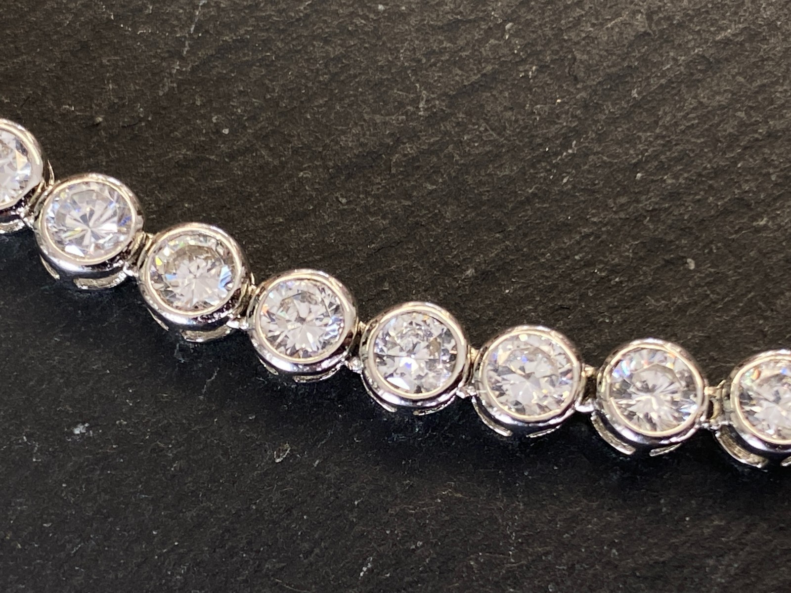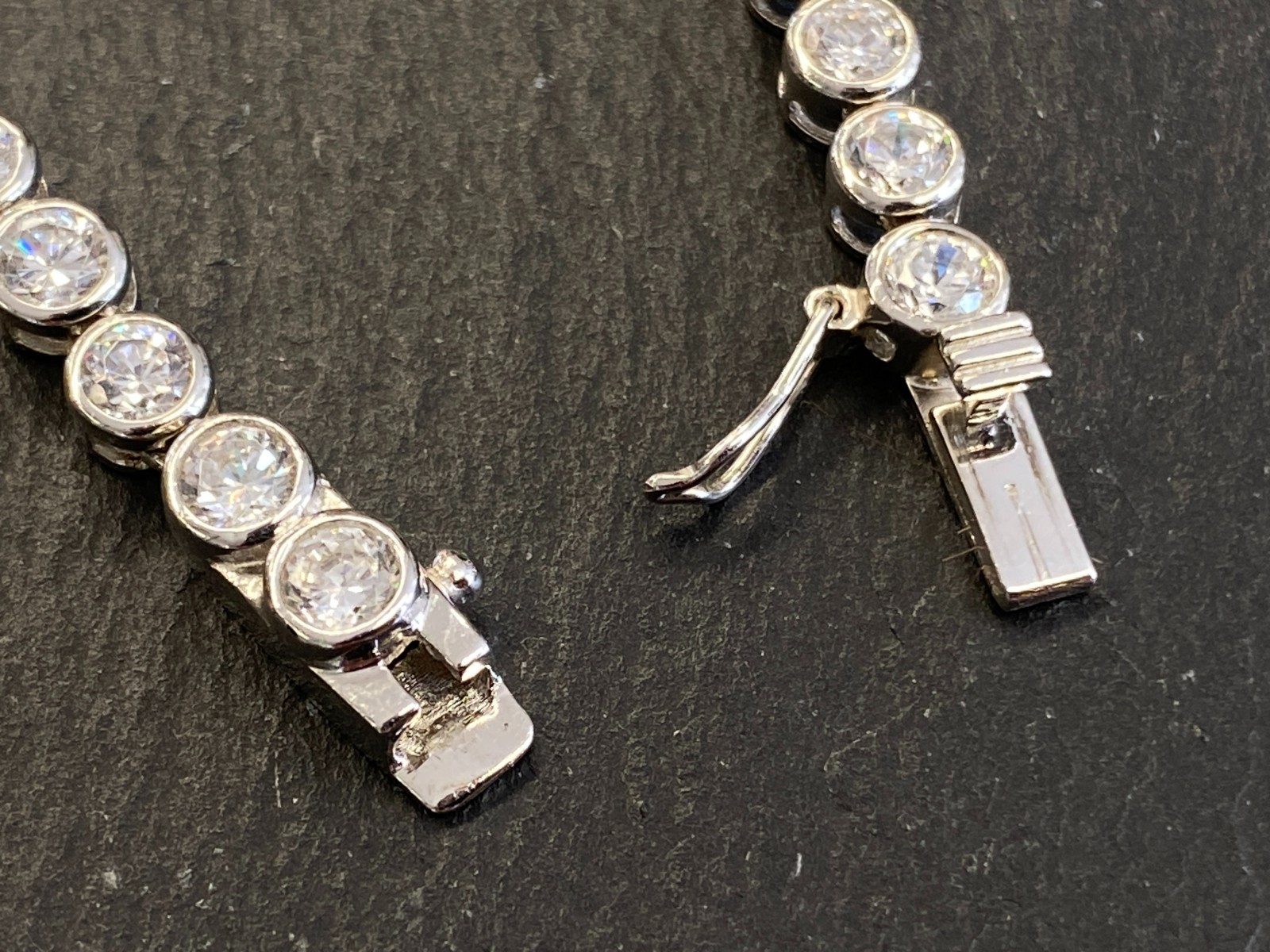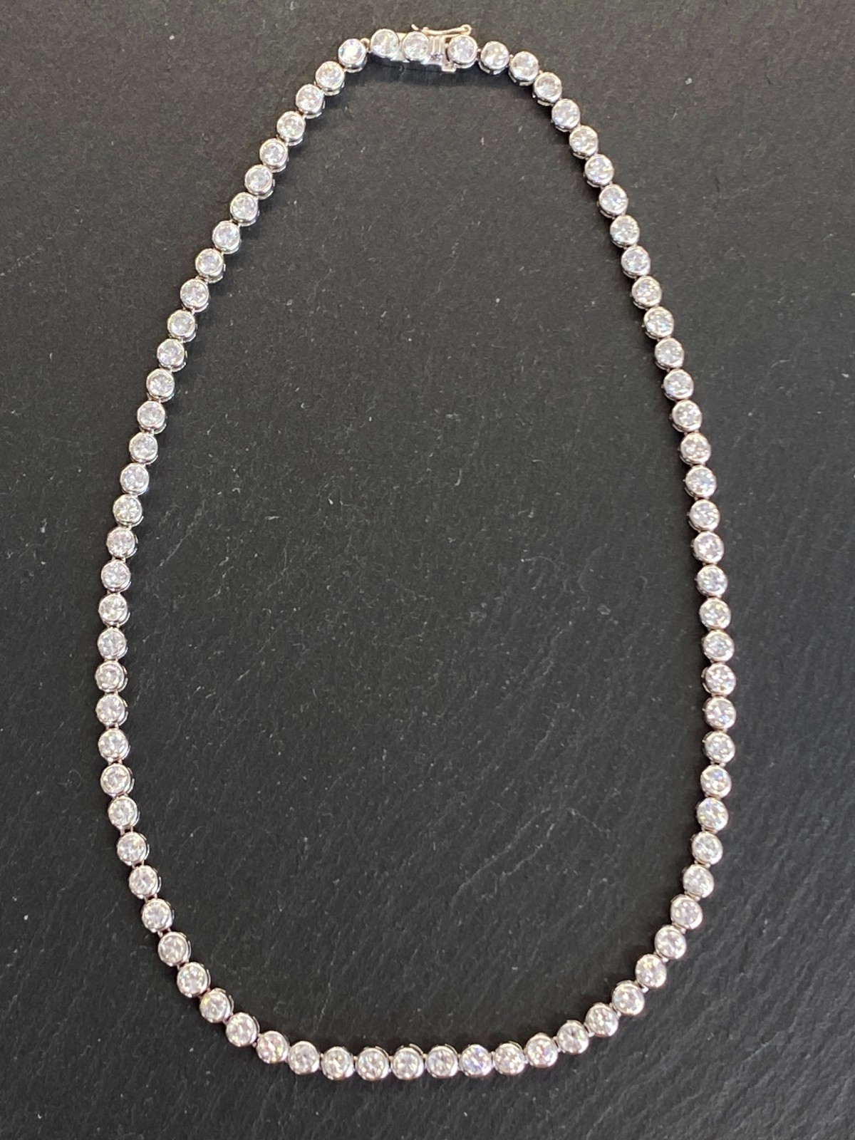 Elegante Tenniskette aus 925 Sterling Silber, punziert, mit mehreren Brillanten aus Glas. Die Halskette ist in sehr gutem Zustand, minimaler Abrieb an der Fassung – die Steine sind oberflächlich minimal berieben, aber kein größerer Abplatzer ersichtlich. Bei Betrachtung mit der Lupe erkennt man einige Unebenheiten bei der Fassung um die Steine herum, mit bloßem Auge merkt man aber nichts davon. Der Verschluss schließt, B/H der Halskette ca. 0,5/0,38cm, Gesamtlänge ca. 44,5cm, Gesamtgewicht ca. 26,72g. Die Begutachtung der Stücke wird vorgenommen von einem Fachmitglied der deutschen gemmologischen Gesellschaft E.V.
