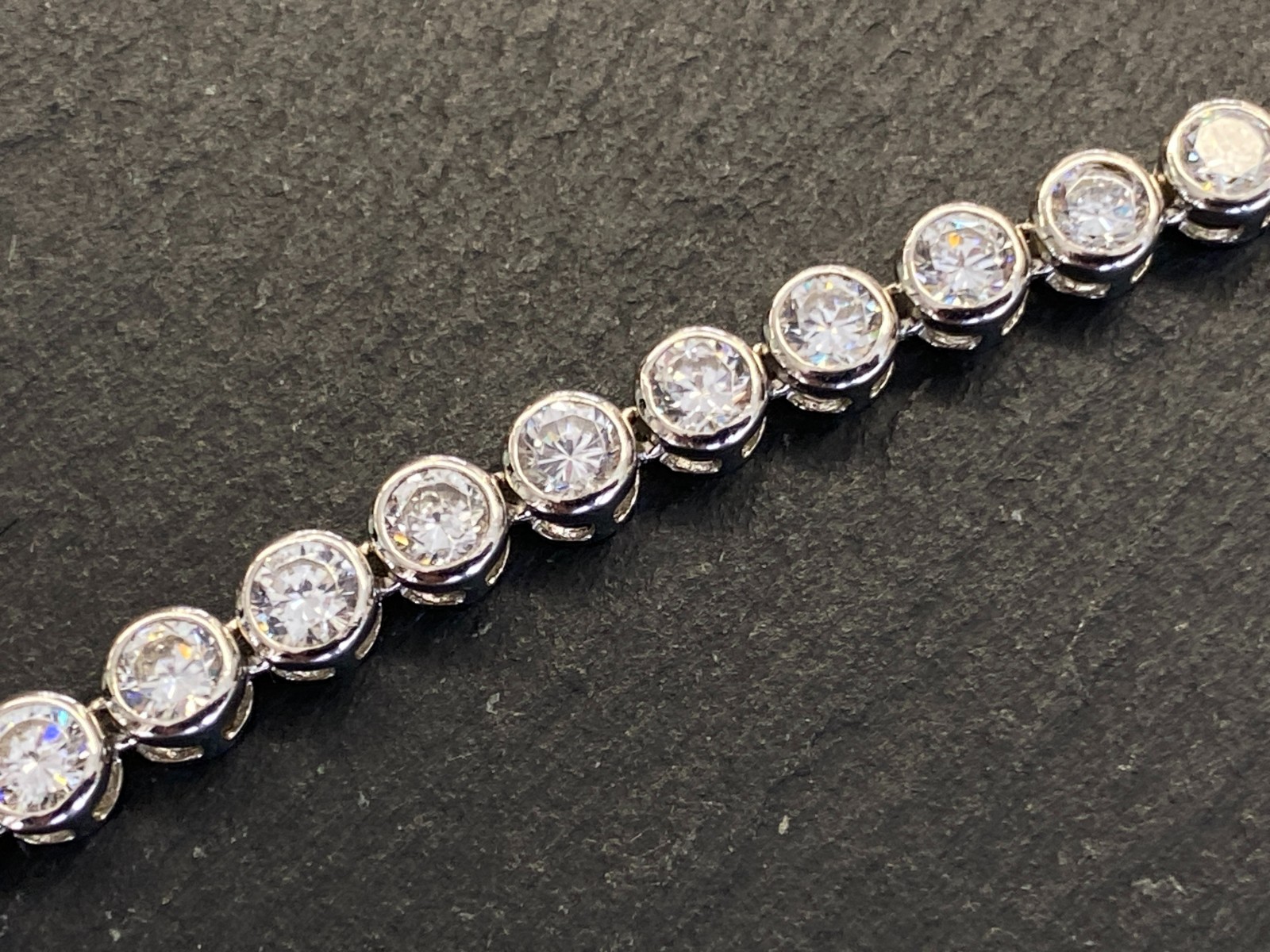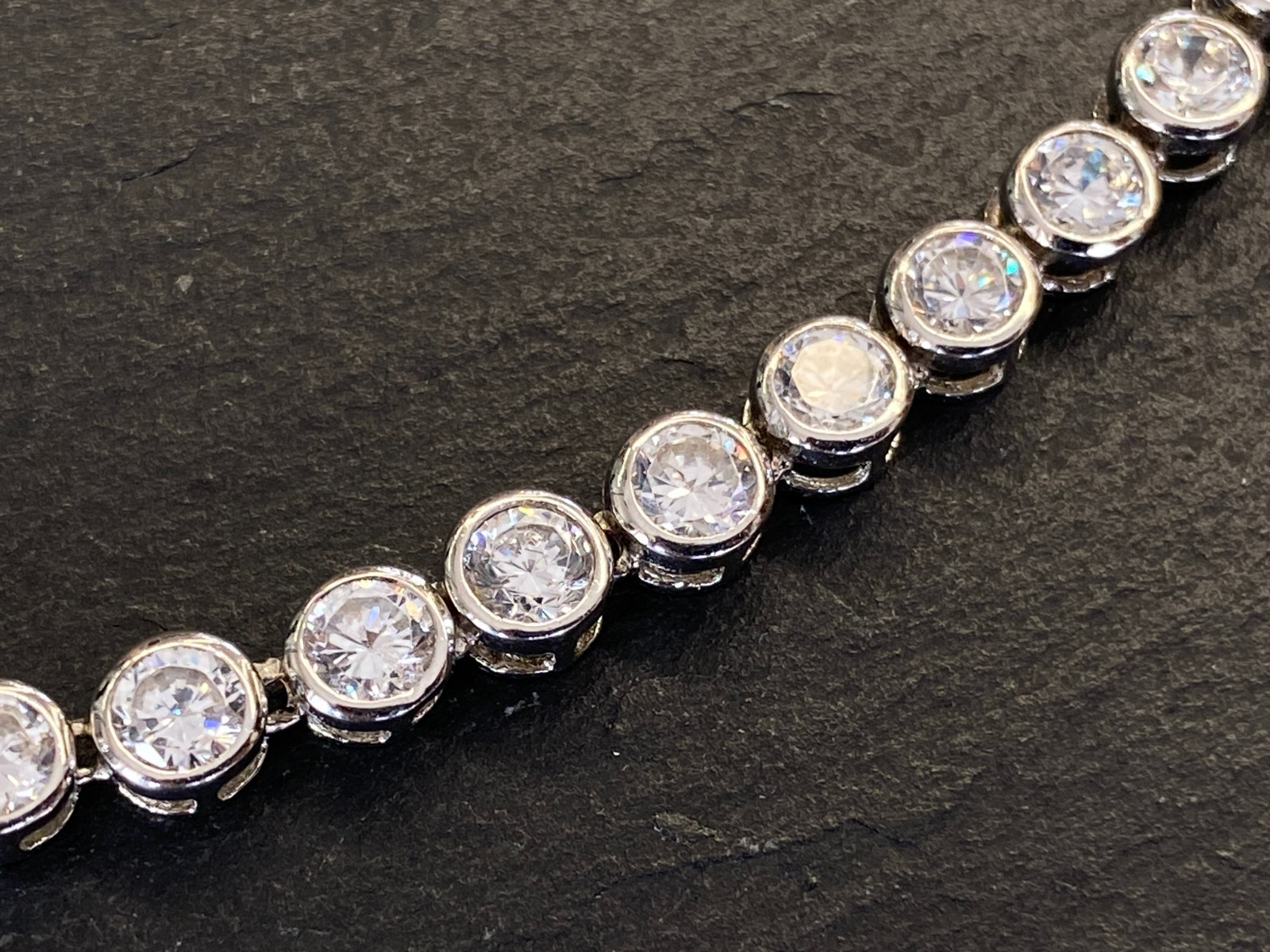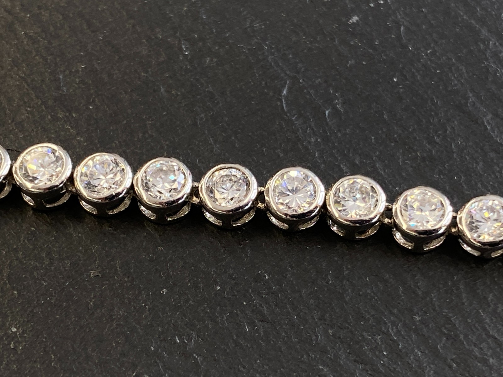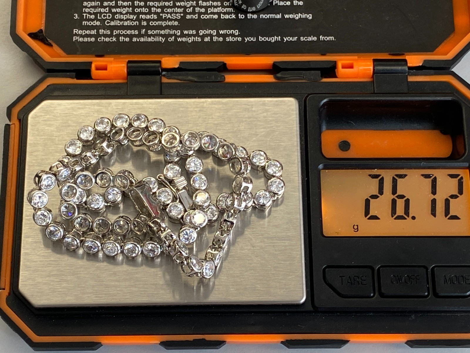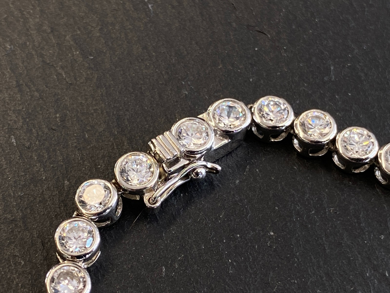 Elegante Tenniskette aus 925 Sterling Silber, punziert, mit mehreren Brillanten aus Glas. Die Halskette ist in sehr gutem Zustand, minimaler Abrieb an der Fassung – die Steine sind oberflächlich minimal berieben, aber kein größerer Abplatzer ersichtlich. Bei Betrachtung mit der Lupe erkennt man einige Unebenheiten bei der Fassung um die Steine herum, mit bloßem Auge merkt man aber nichts davon. Der Verschluss schließt, B/H der Halskette ca. 0,5/0,38cm, Gesamtlänge ca. 44,5cm, Gesamtgewicht ca. 26,72g. Die Begutachtung der Stücke wird vorgenommen von einem Fachmitglied der deutschen gemmologischen Gesellschaft E.V.
