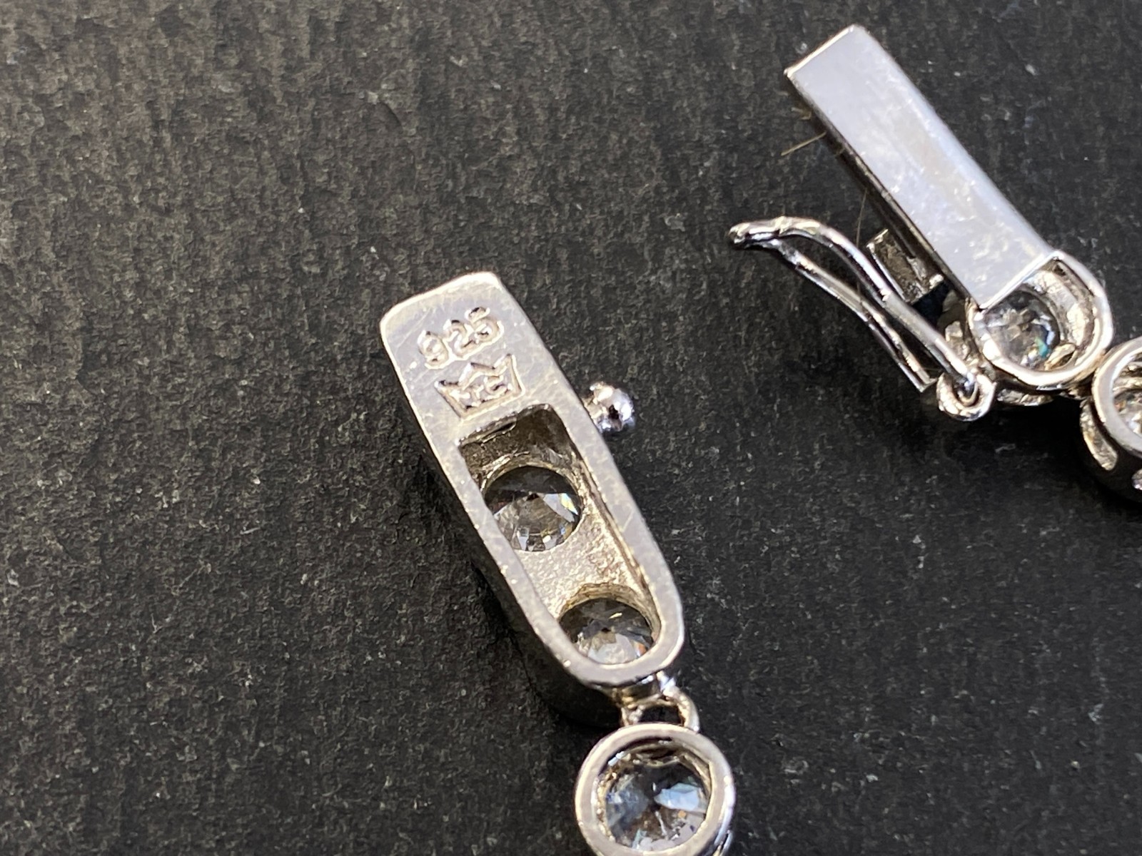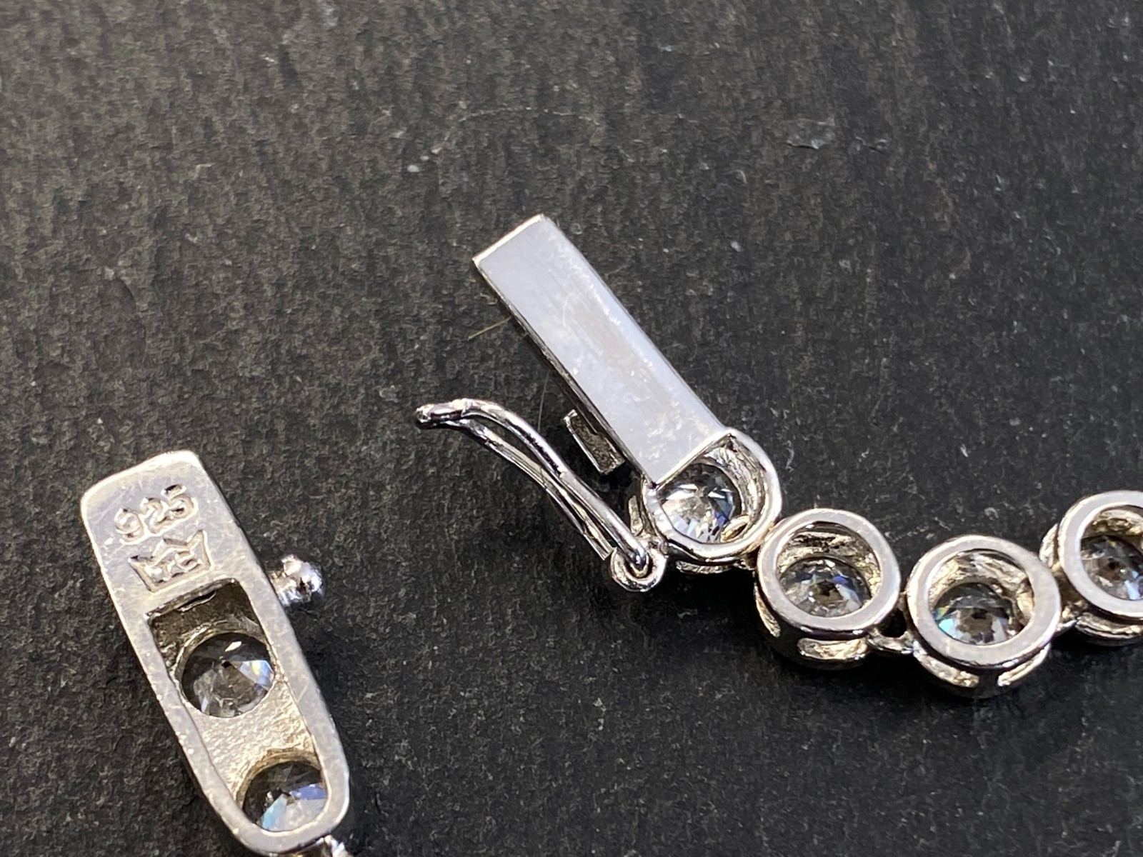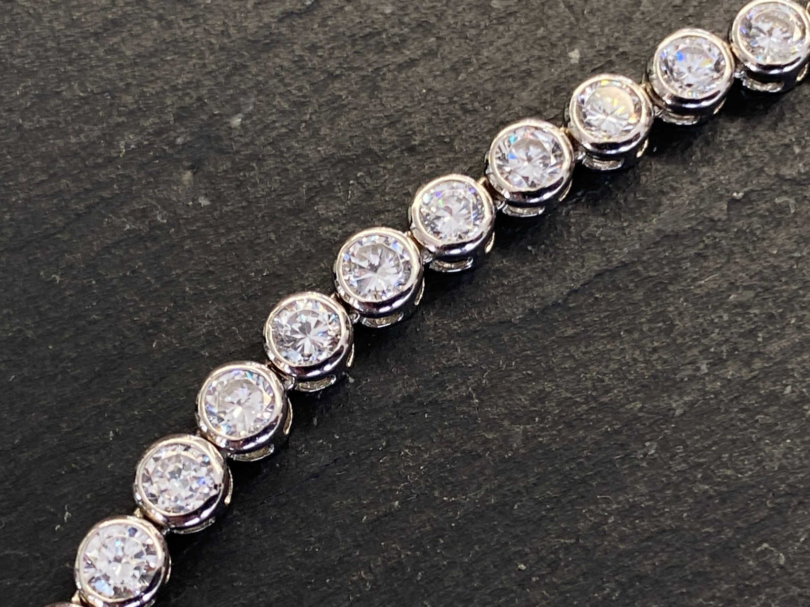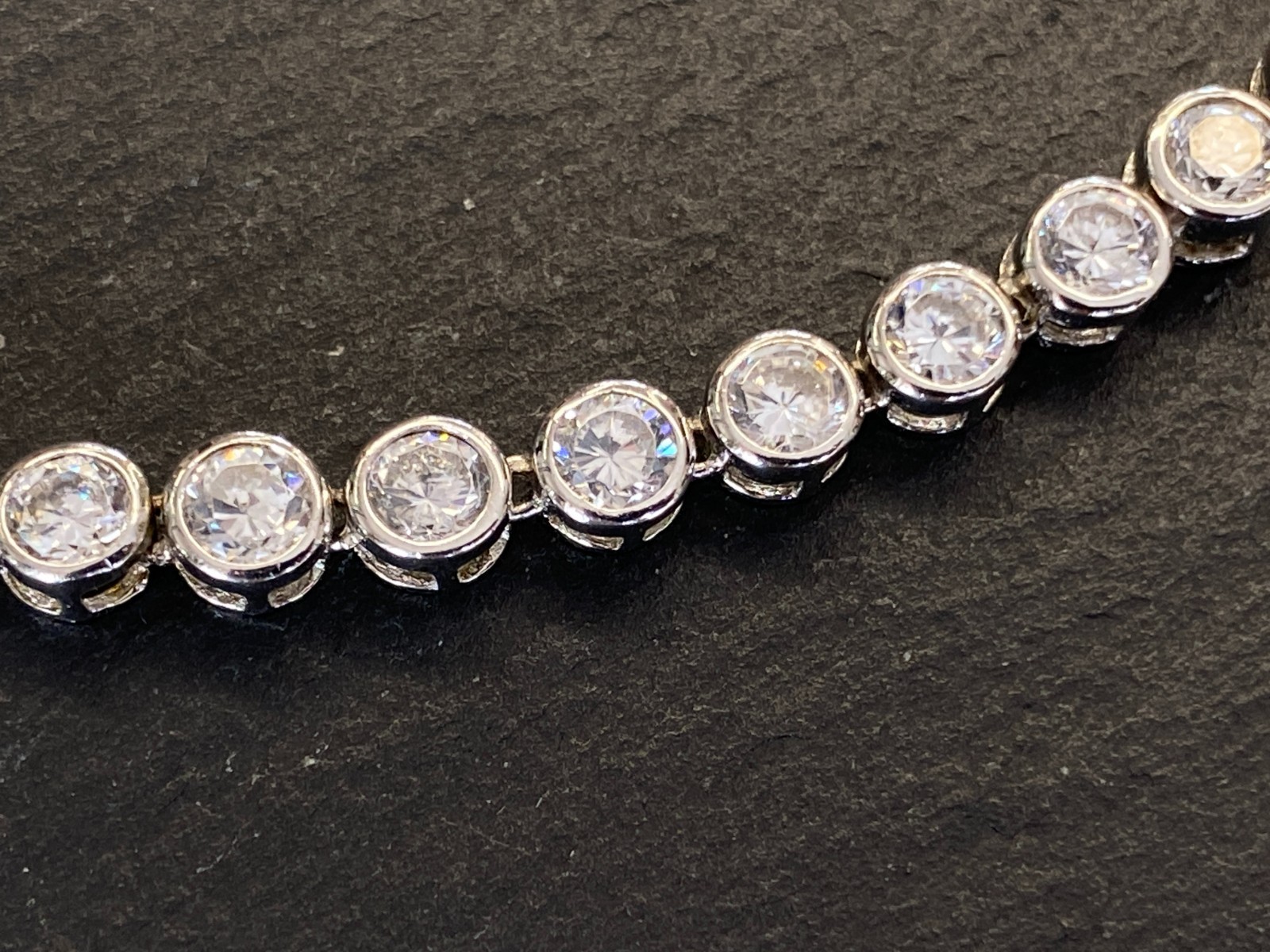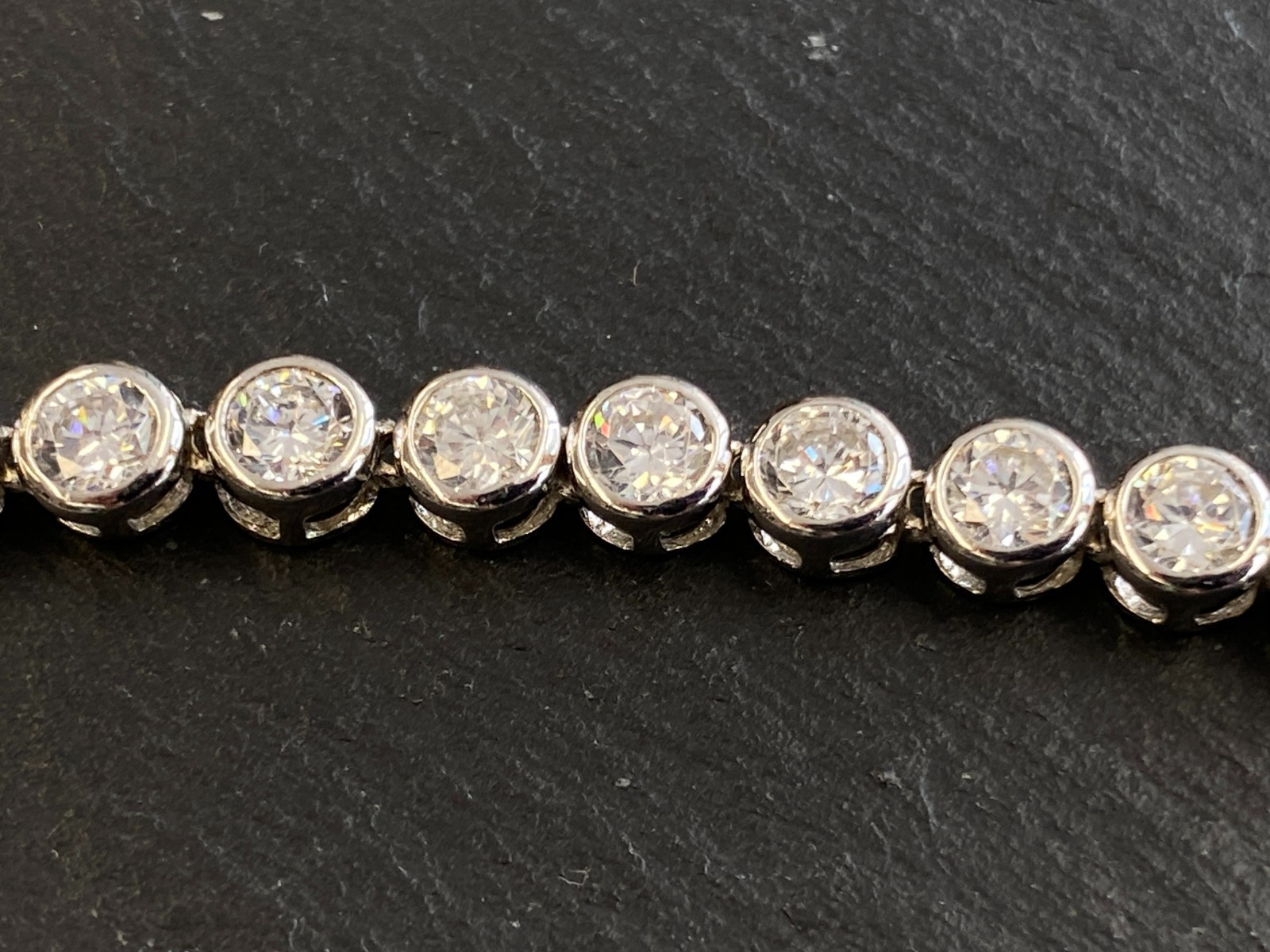 Elegante Tenniskette aus 925 Sterling Silber, punziert, mit mehreren Brillanten aus Glas. Die Halskette ist in sehr gutem Zustand, minimaler Abrieb an der Fassung – die Steine sind oberflächlich minimal berieben, aber kein größerer Abplatzer ersichtlich. Bei Betrachtung mit der Lupe erkennt man einige Unebenheiten bei der Fassung um die Steine herum, mit bloßem Auge merkt man aber nichts davon. Der Verschluss schließt, B/H der Halskette ca. 0,5/0,38cm, Gesamtlänge ca. 44,5cm, Gesamtgewicht ca. 26,72g. Die Begutachtung der Stücke wird vorgenommen von einem Fachmitglied der deutschen gemmologischen Gesellschaft E.V.