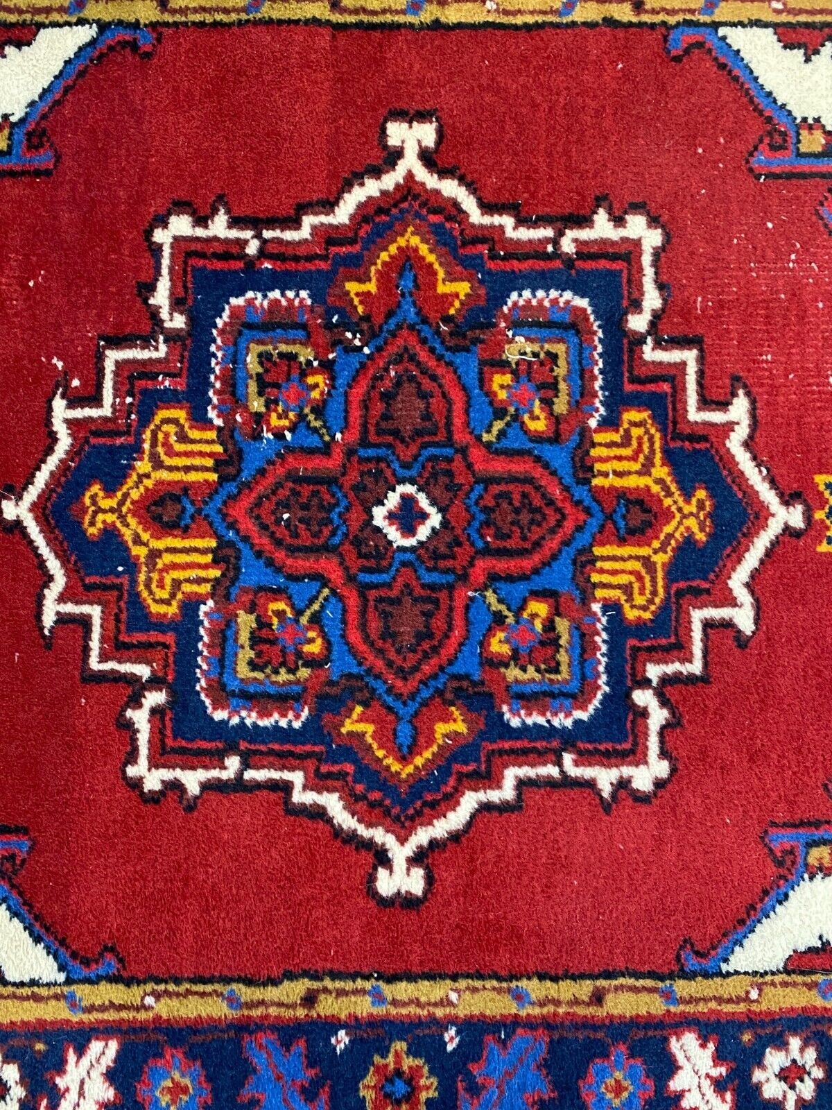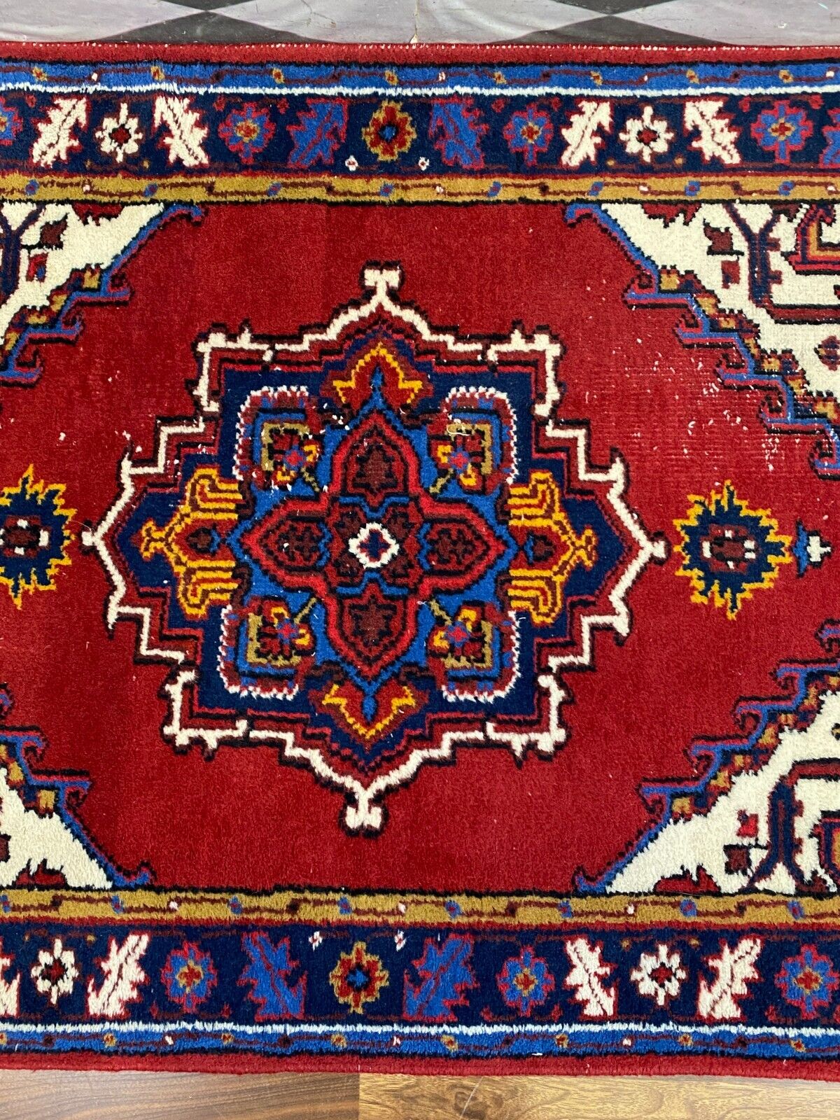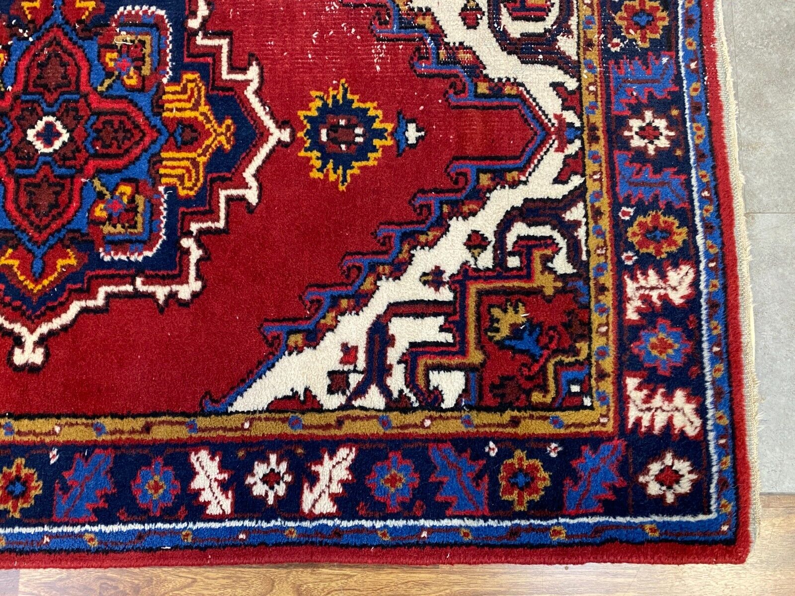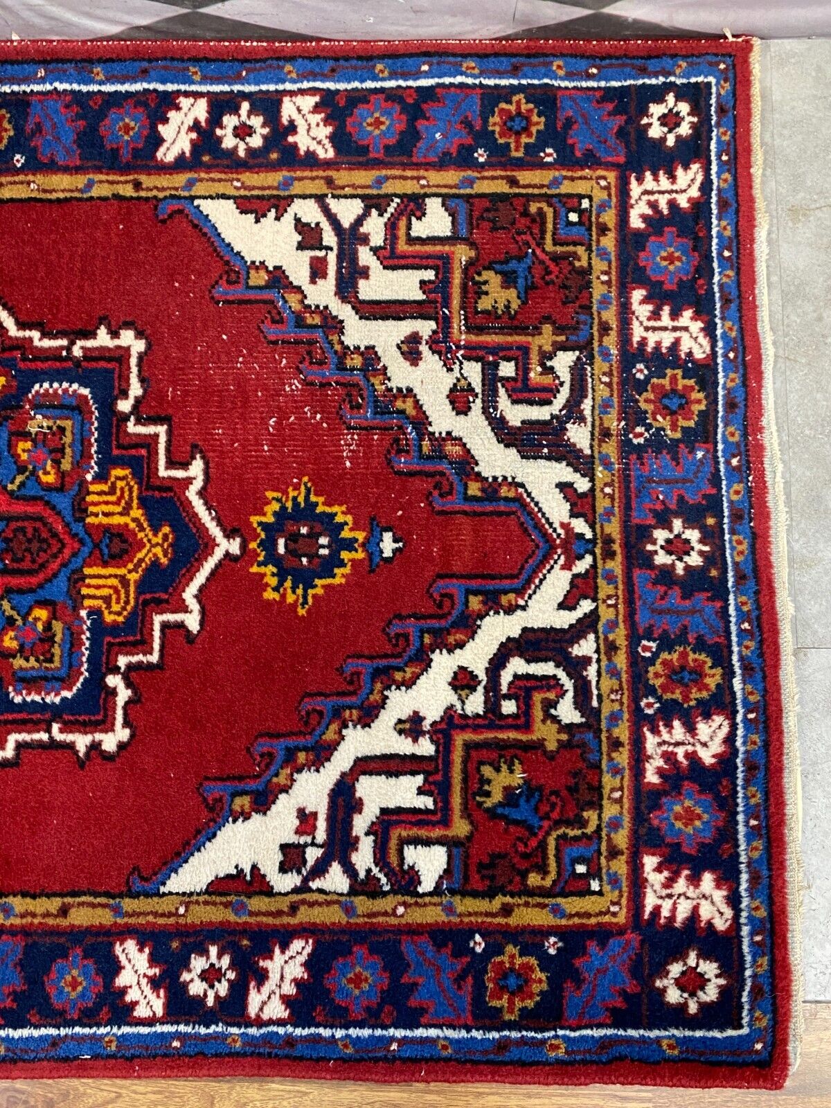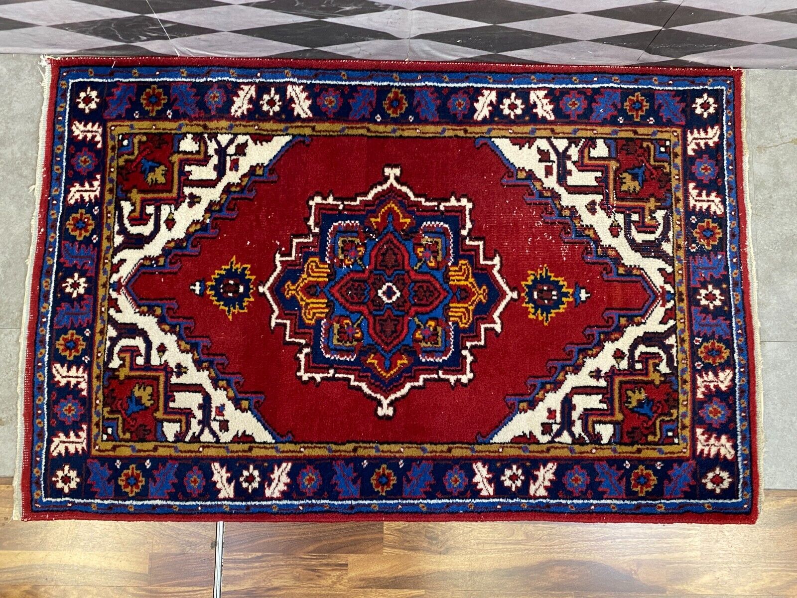 Handgeknüpfter Wollteppich. Ränder insgesamt verschlissen. Im Mittelbild teils dunklere Stellen, Abnutzung und viele Knoten zu sehen. LxB: 155x98cm Der Teppich ist nicht gewaschen, riecht weder nach Haustieren, noch nach Rauch.