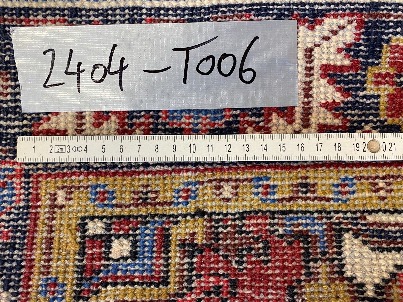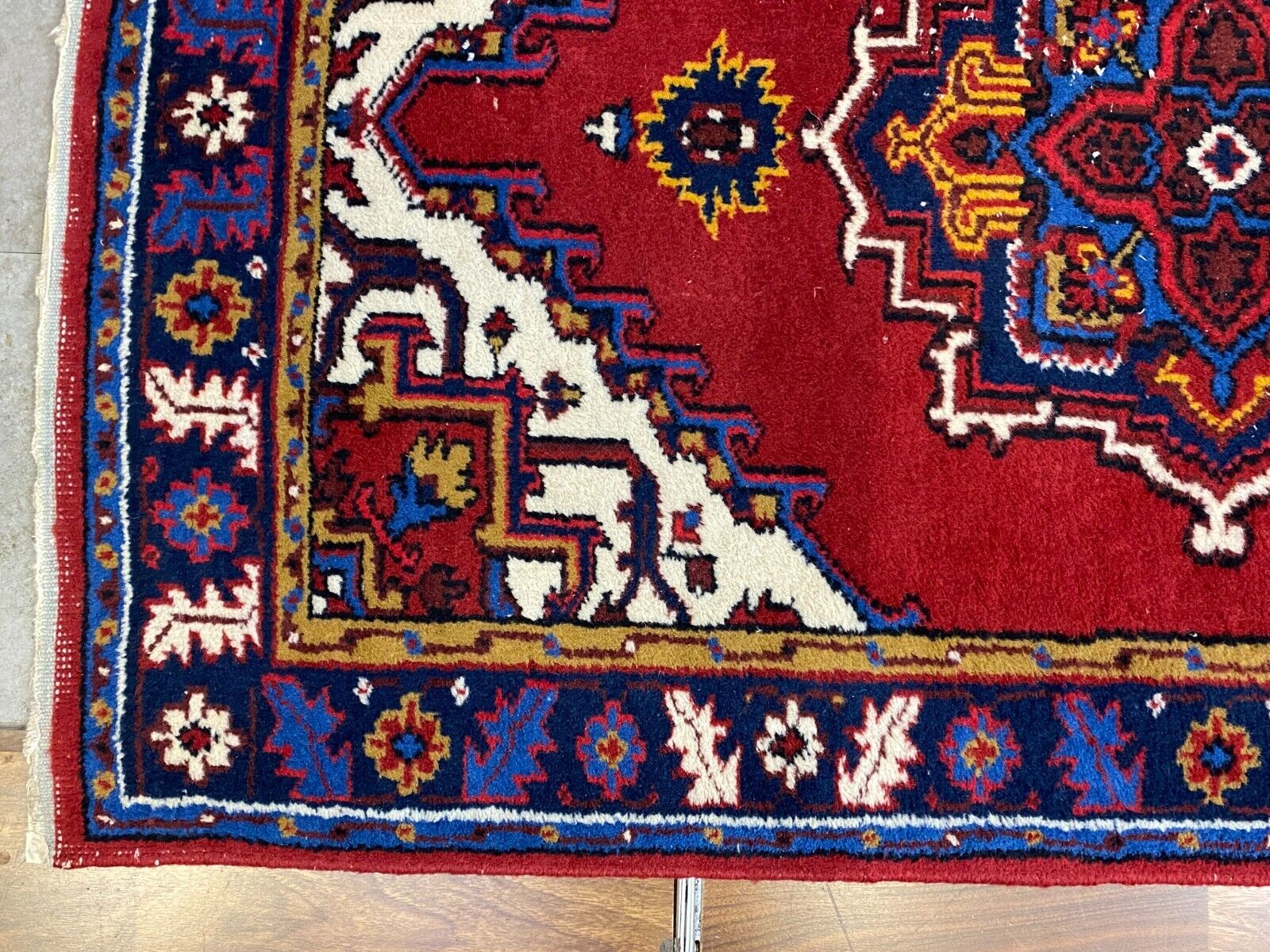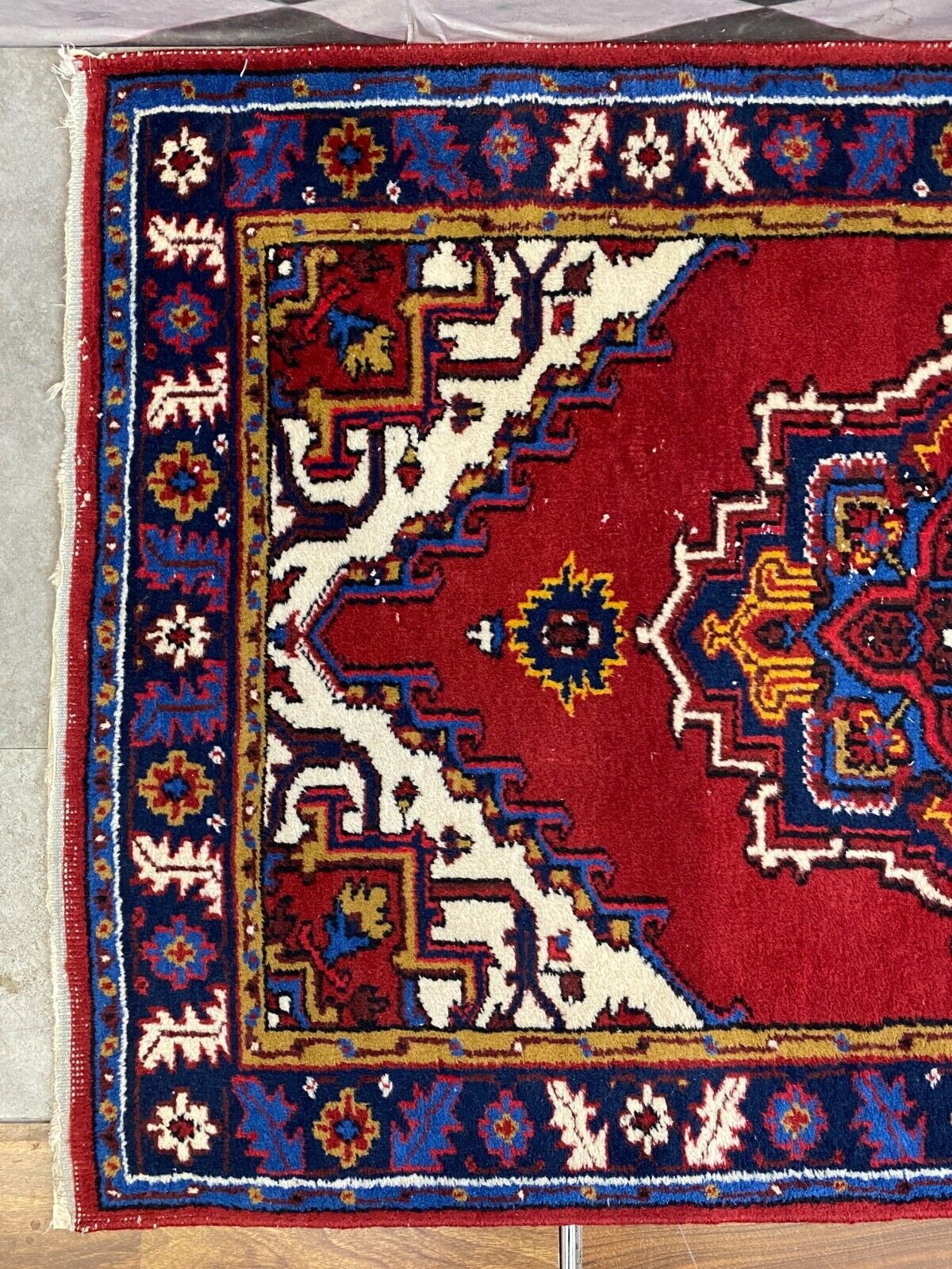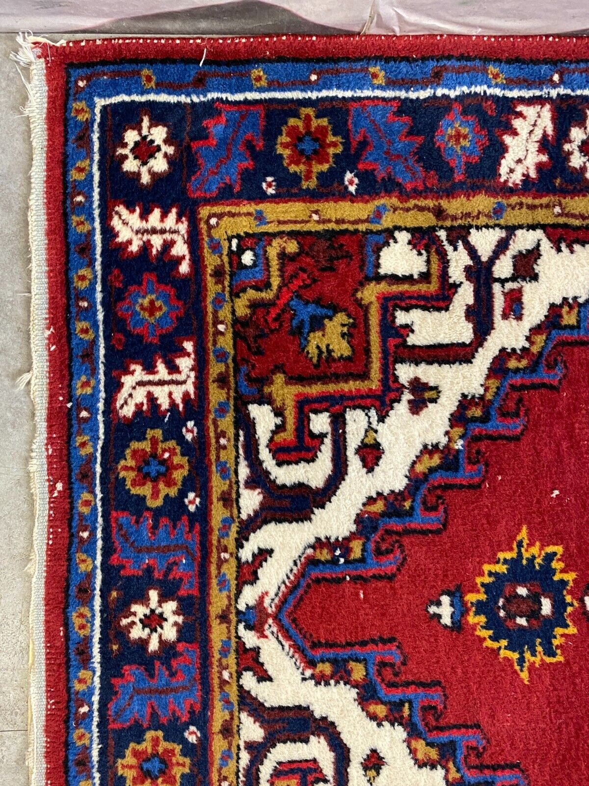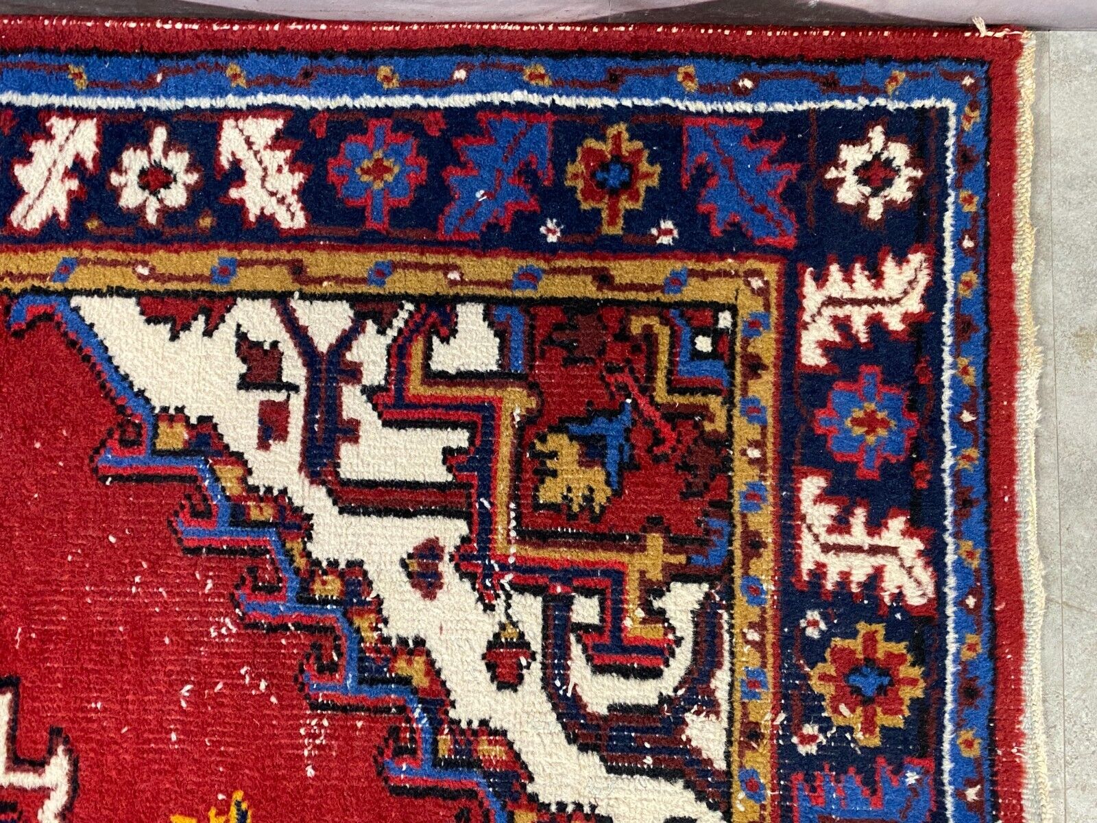 Handgeknüpfter Wollteppich. Ränder insgesamt verschlissen. Im Mittelbild teils dunklere Stellen, Abnutzung und viele Knoten zu sehen. LxB: 155x98cm Der Teppich ist nicht gewaschen, riecht weder nach Haustieren, noch nach Rauch.