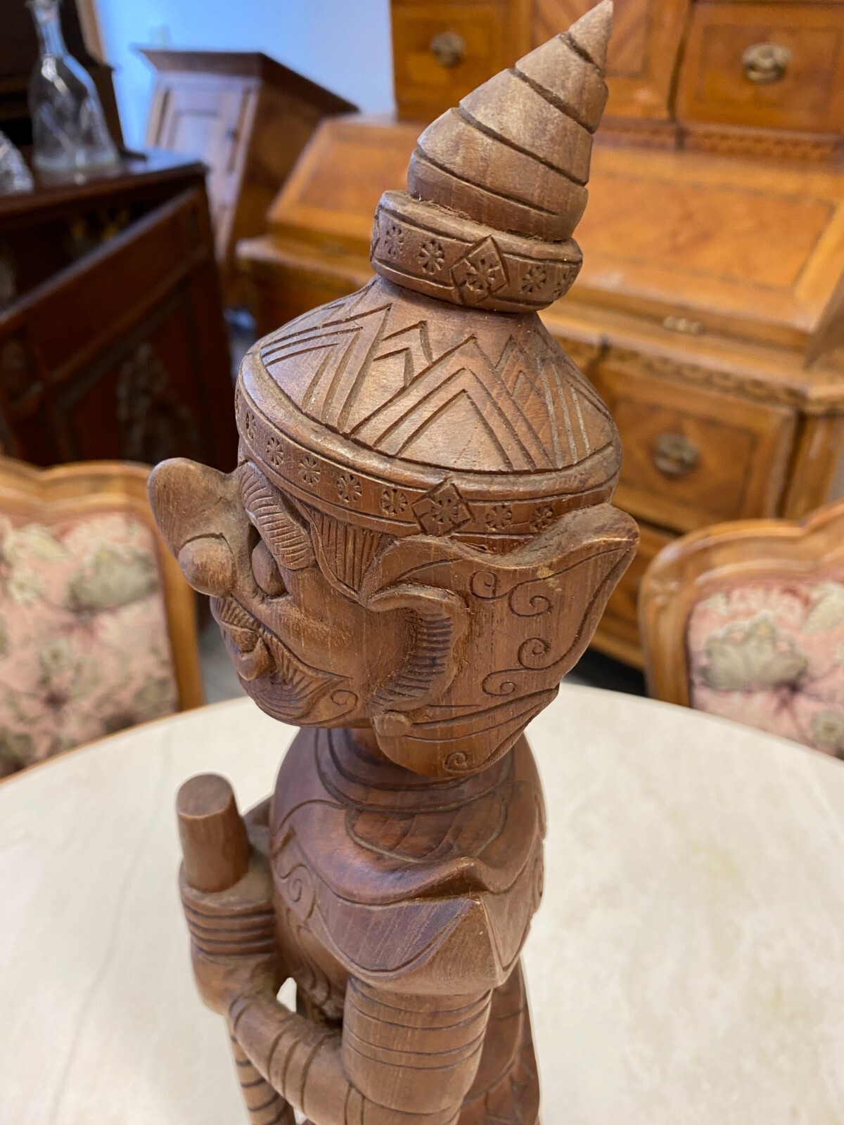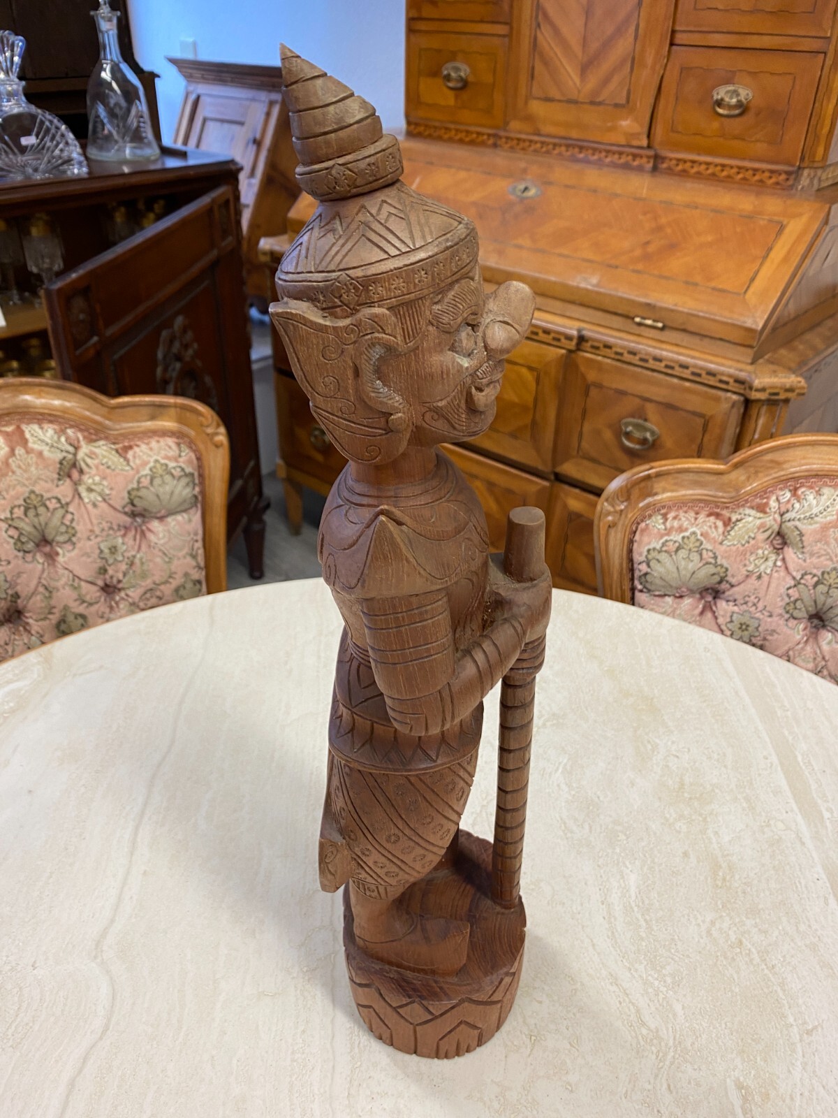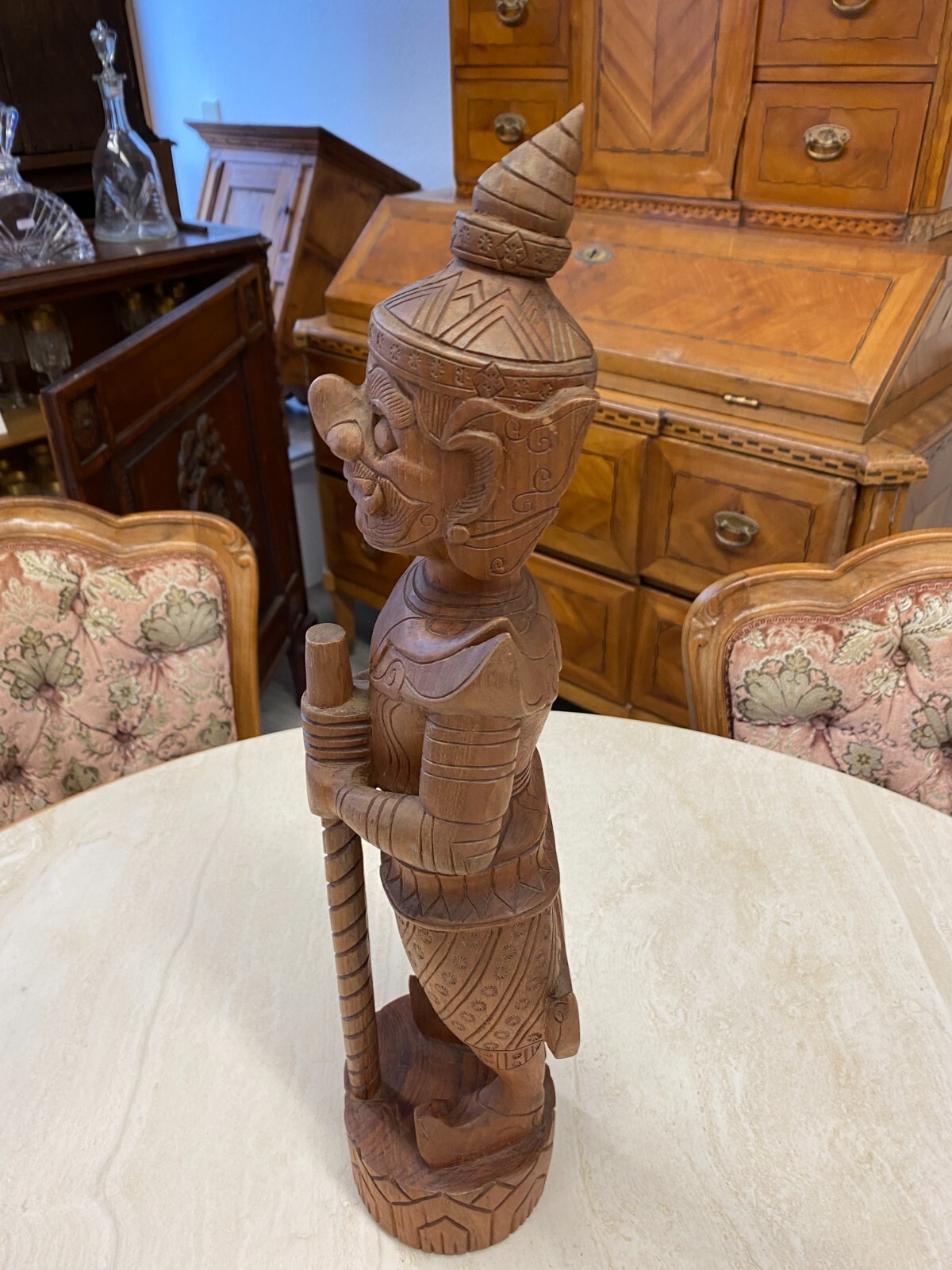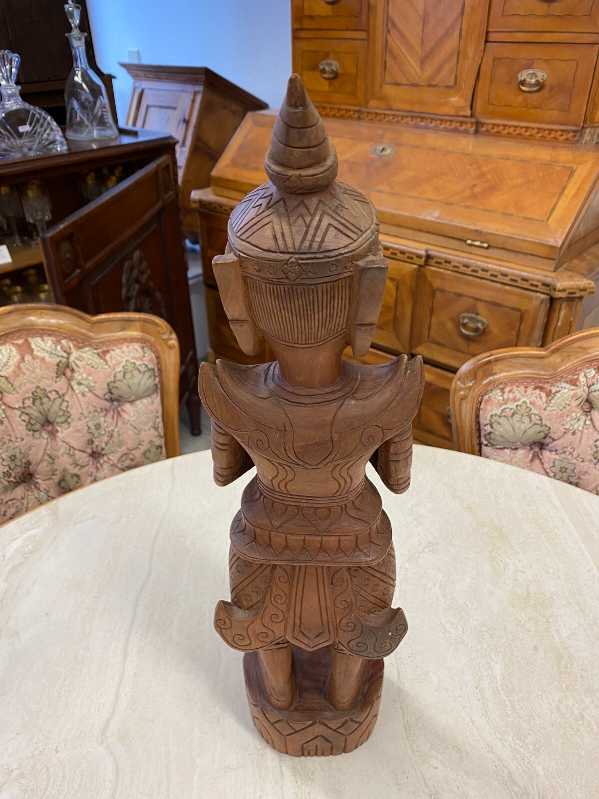 Asiatische Figur aus Holz, handgeschnitzt, 2-te Hälfte 20-tes Jhdt. Die Oberfläche ist leicht berieben. Abmessungen BTH 13x11x50cm.