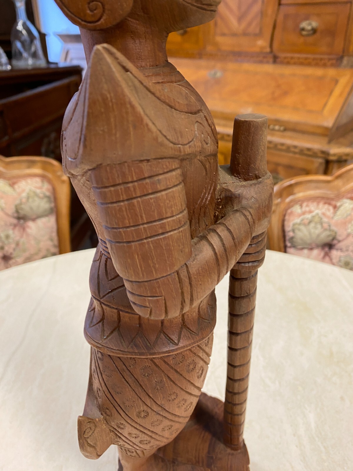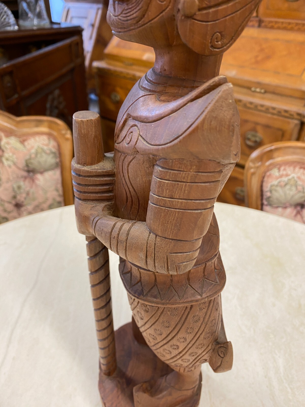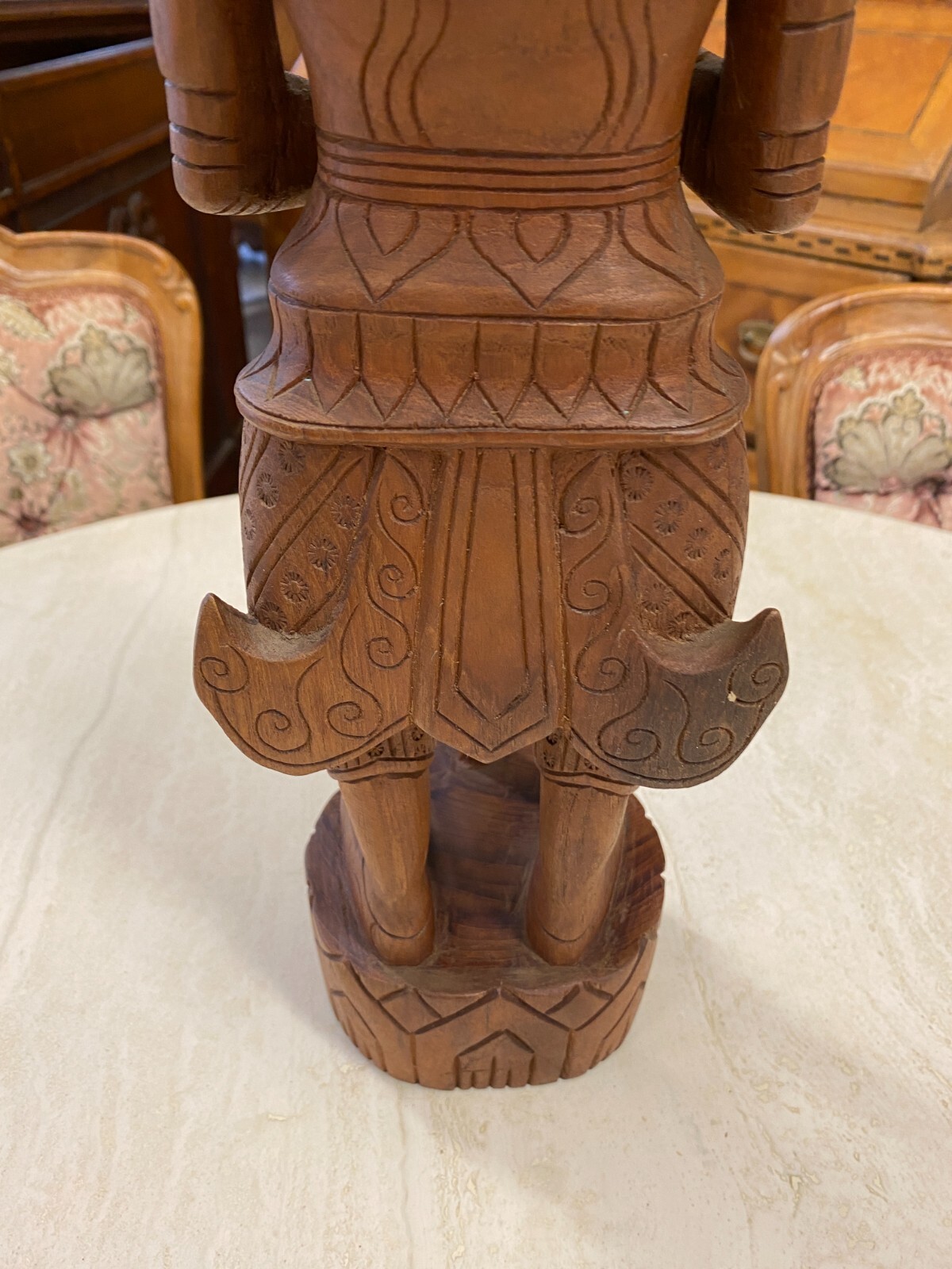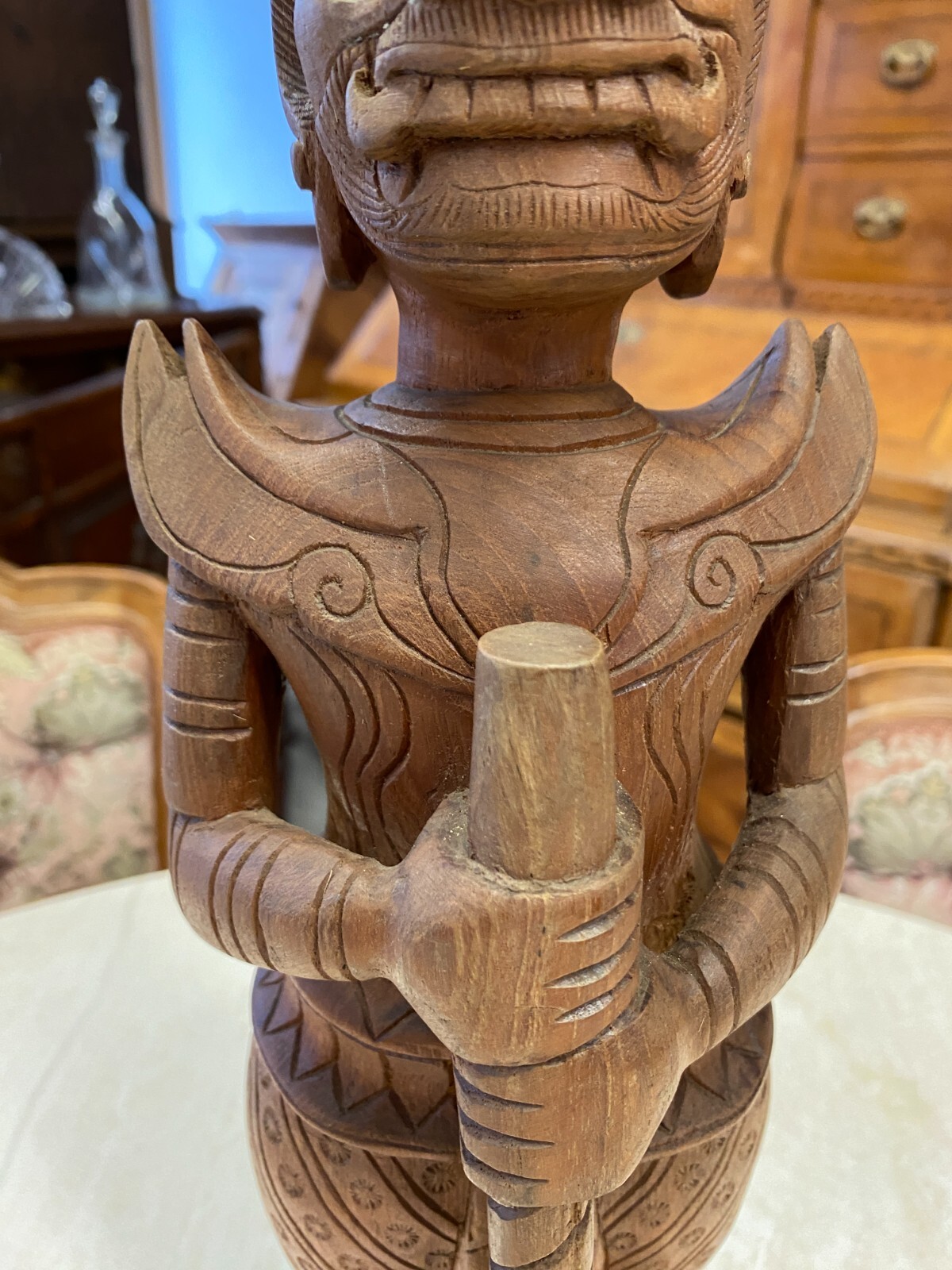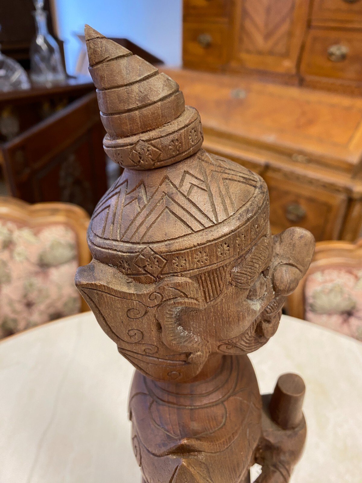 Asiatische Figur aus Holz, handgeschnitzt, 2-te Hälfte 20-tes Jhdt. Die Oberfläche ist leicht berieben. Abmessungen BTH 13x11x50cm.