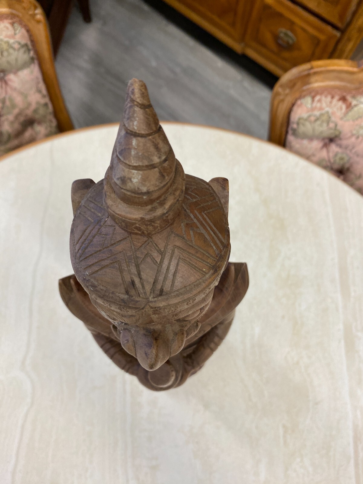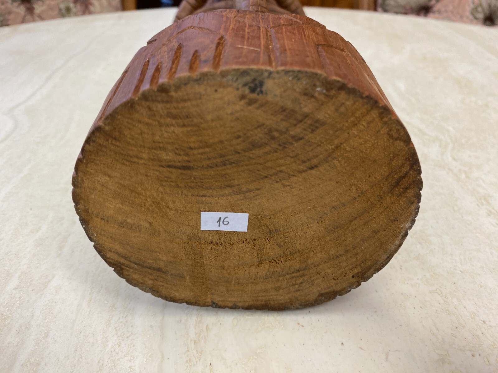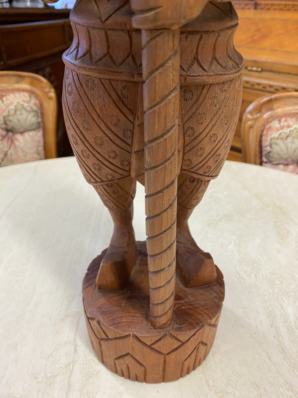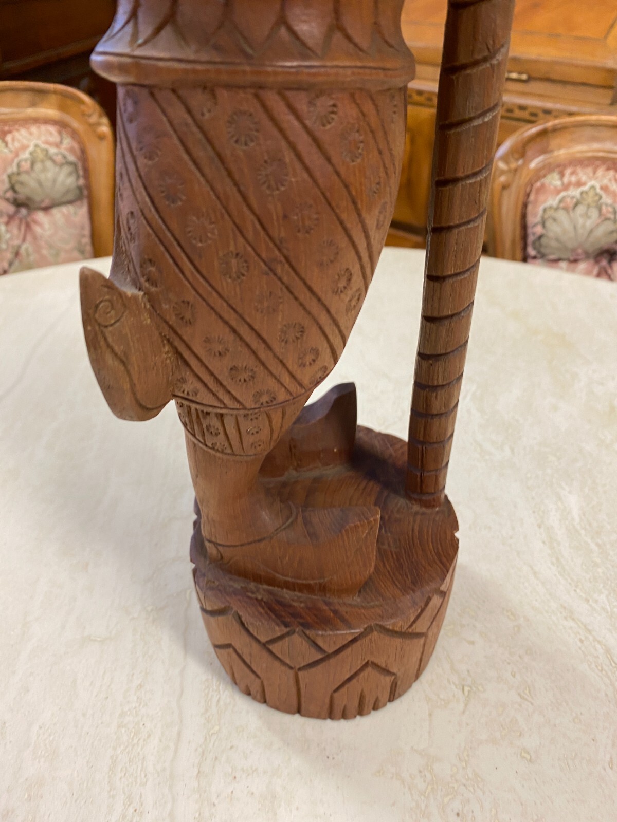 Asiatische Figur aus Holz, handgeschnitzt, 2-te Hälfte 20-tes Jhdt. Die Oberfläche ist leicht berieben. Abmessungen BTH 13x11x50cm.