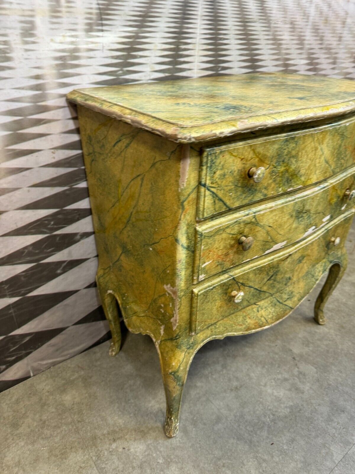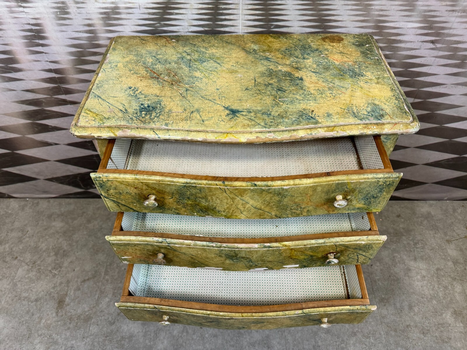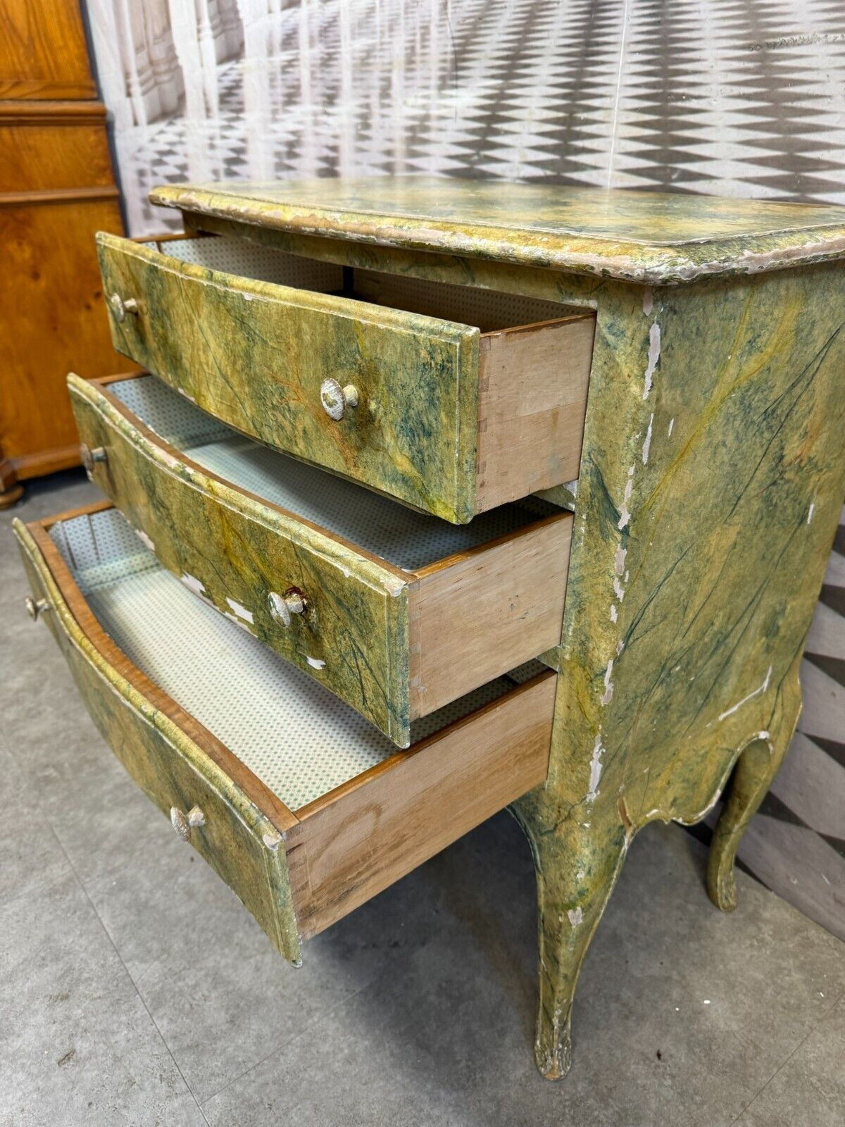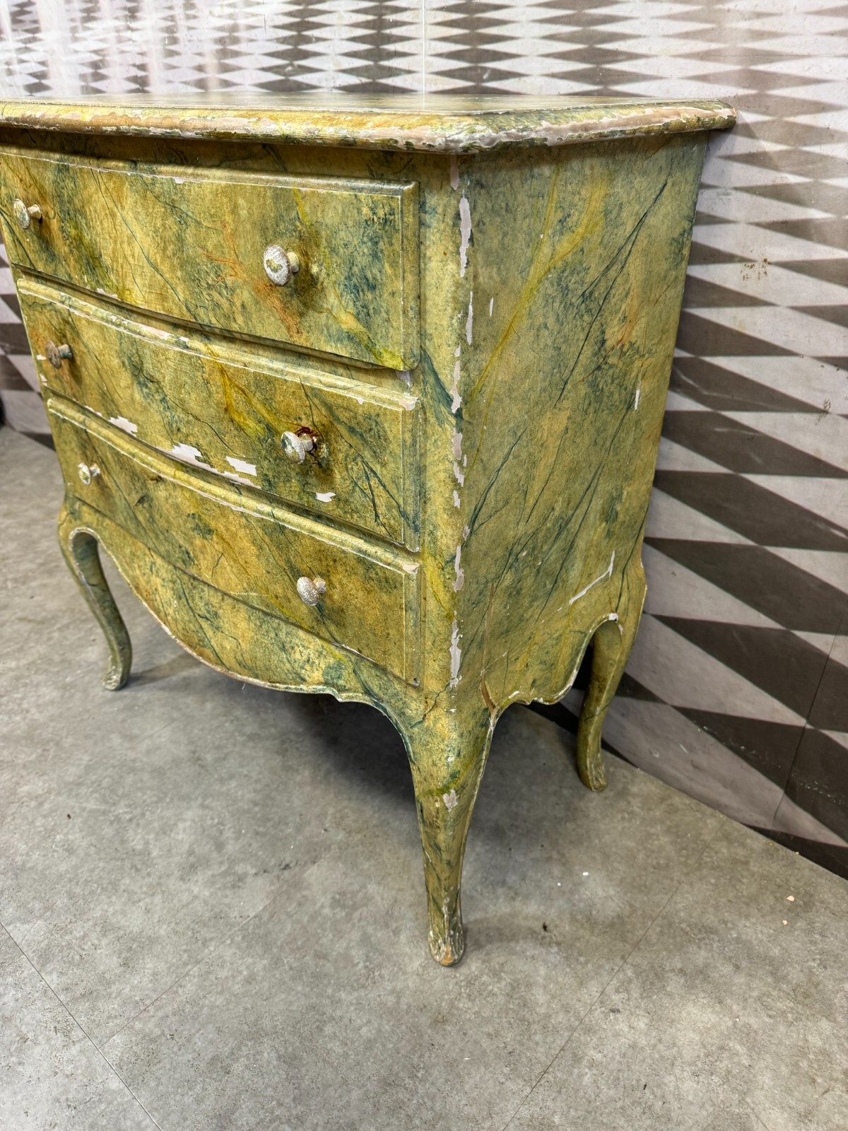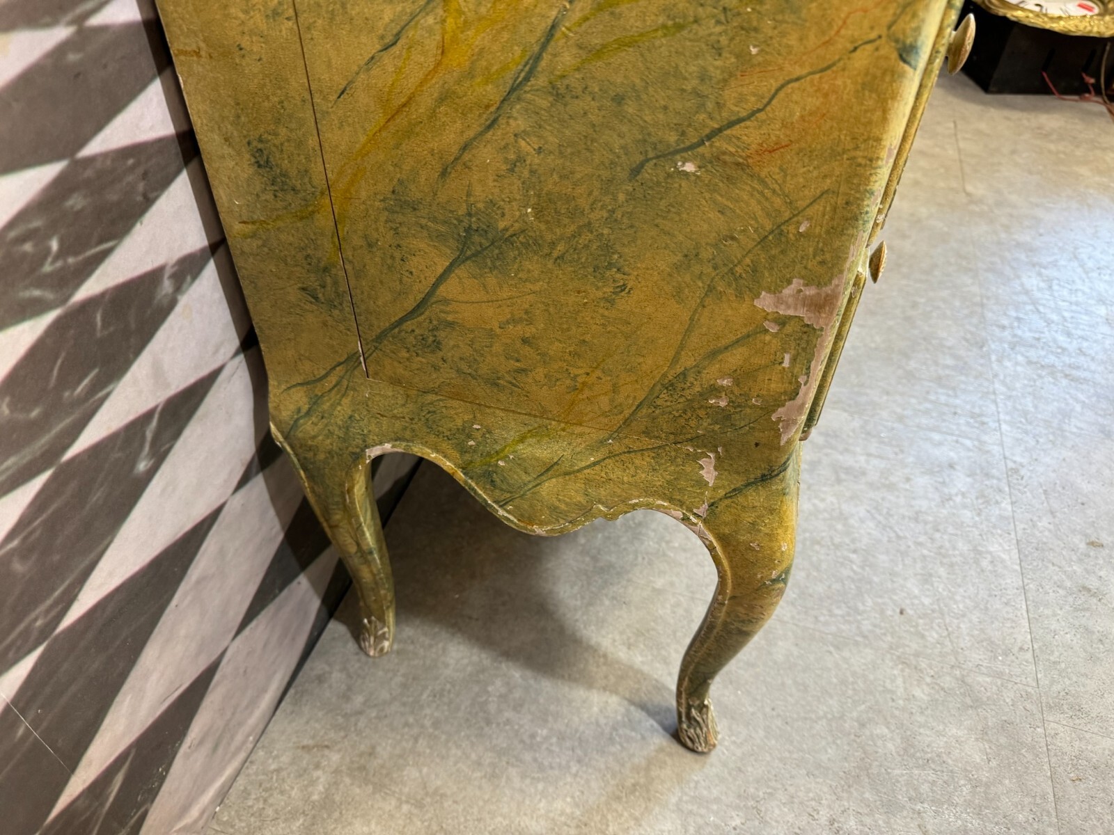 Vintage Kommode in barockem Stil, Oberfläche berieben und zum Teil fleckig. Die Schubladeninneräume sind beklebt und stark fleckig. Die Kommode hat an der gesamten Oberfläche stärkere Fassungsabplatzer. Stabiler Zustand, Abmessungen BTH 65/36/71cm.