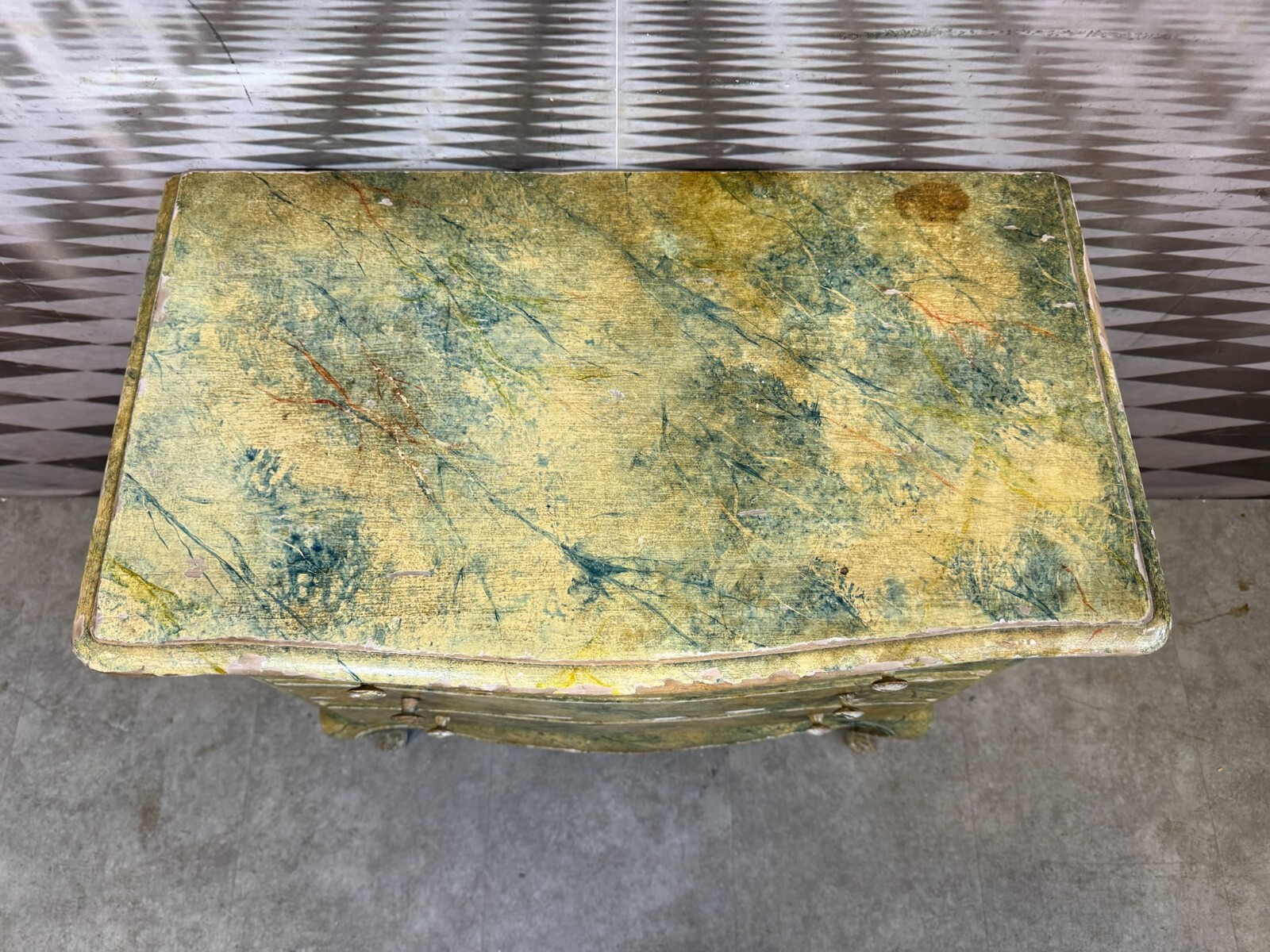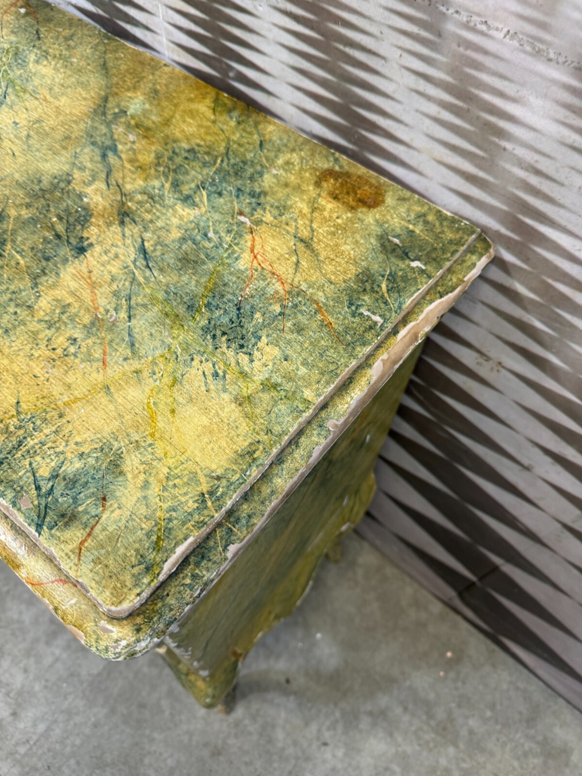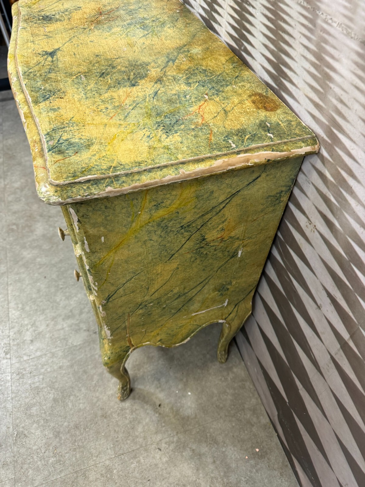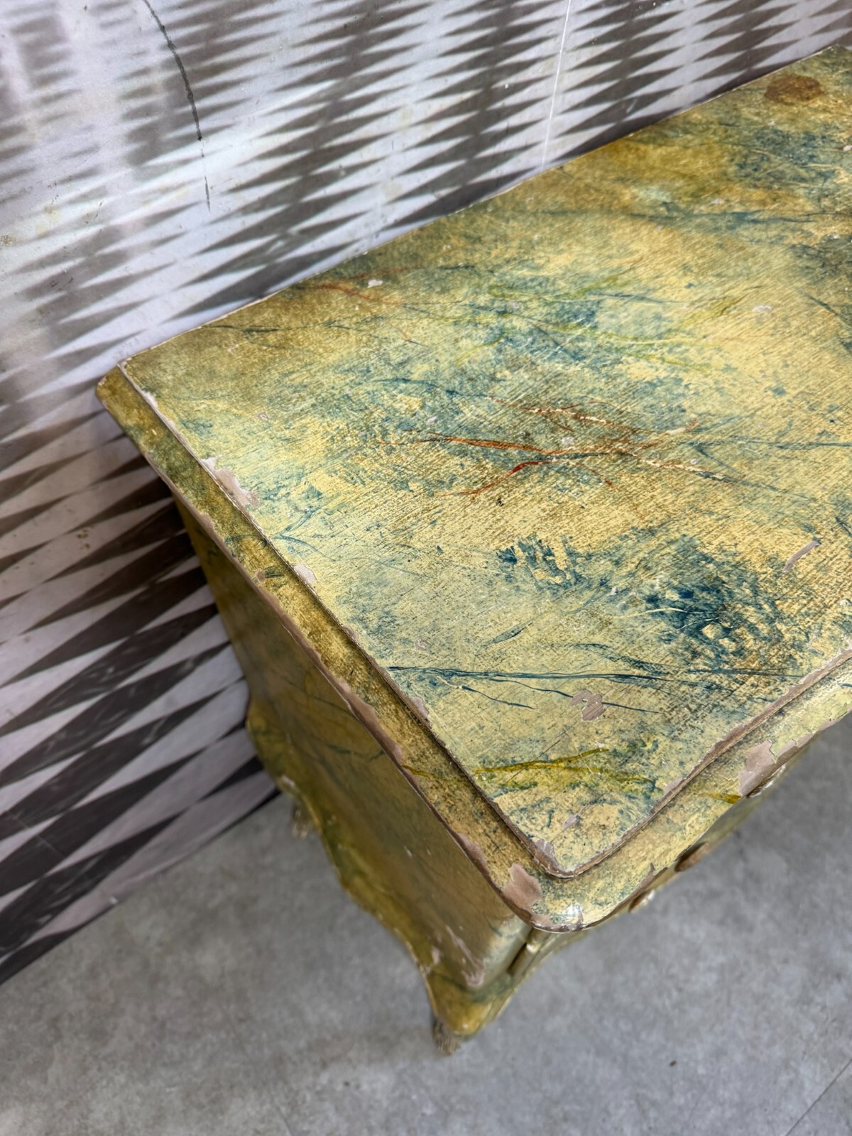 Vintage Kommode in barockem Stil, Oberfläche berieben und zum Teil fleckig. Die Schubladeninneräume sind beklebt und stark fleckig. Die Kommode hat an der gesamten Oberfläche stärkere Fassungsabplatzer. Stabiler Zustand, Abmessungen BTH 65/36/71cm.
