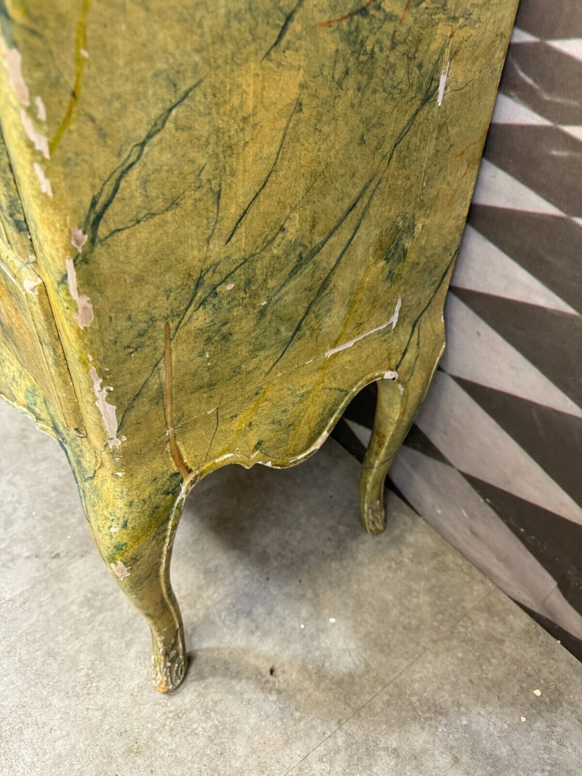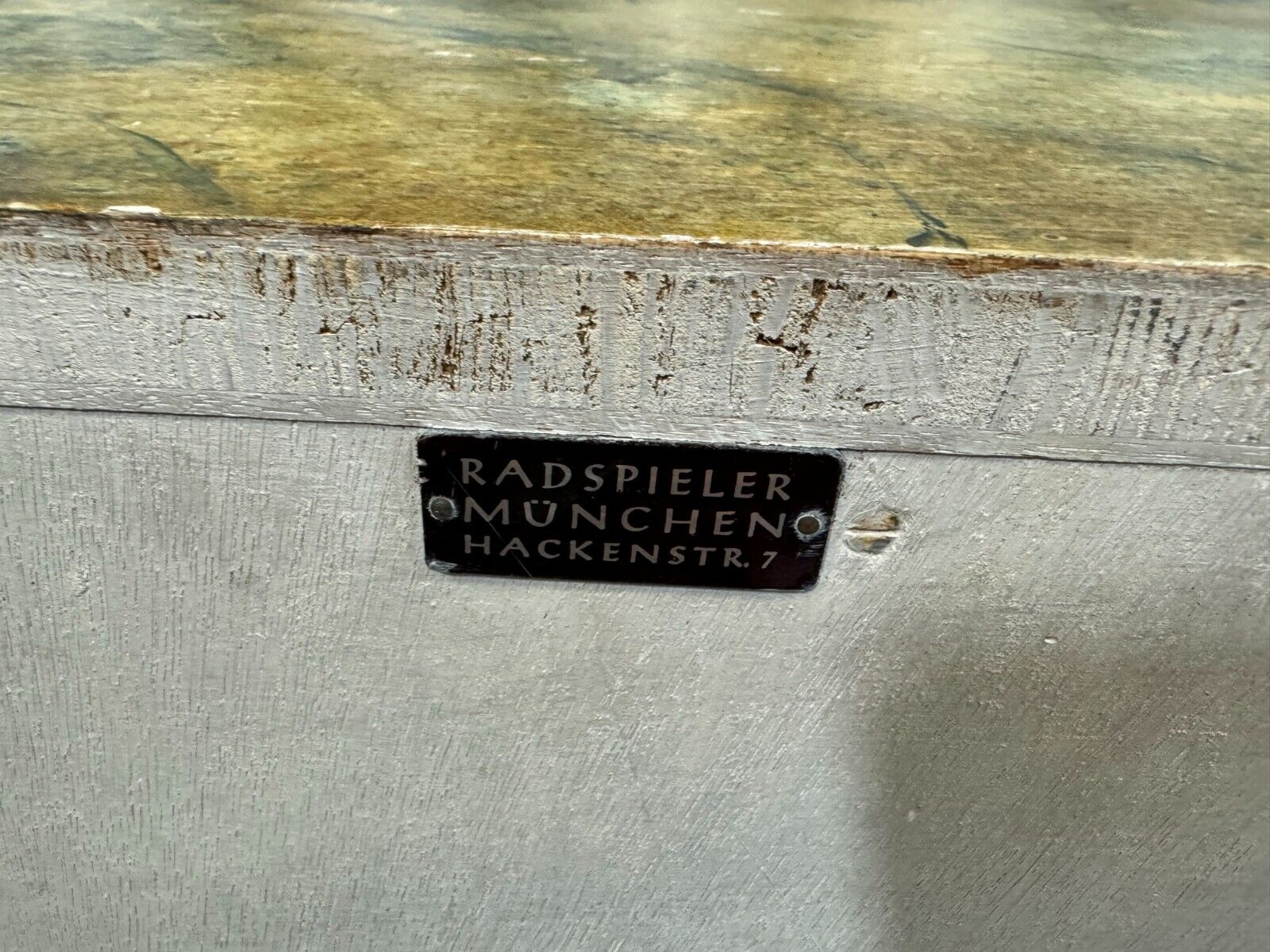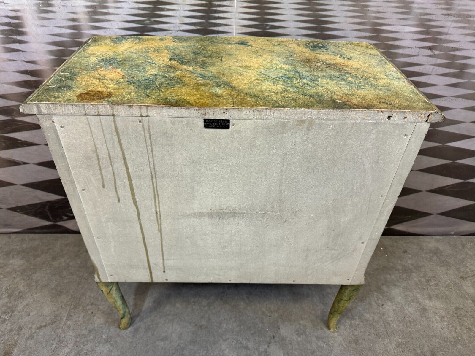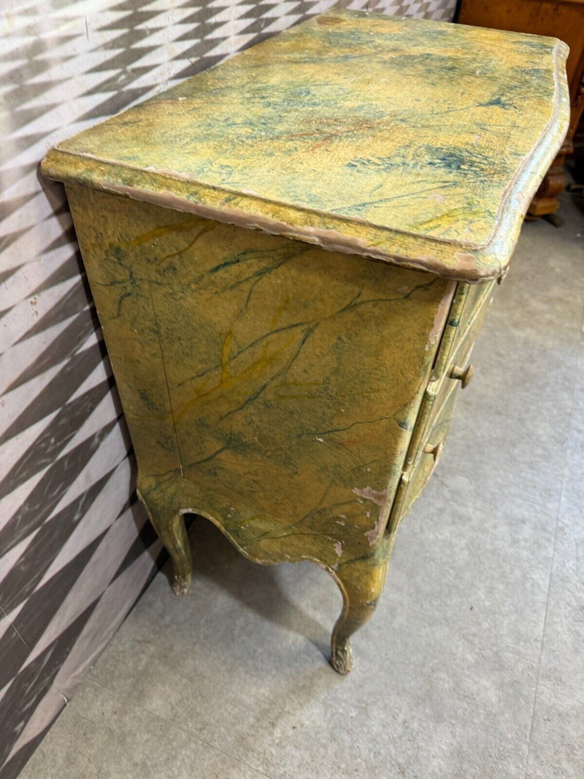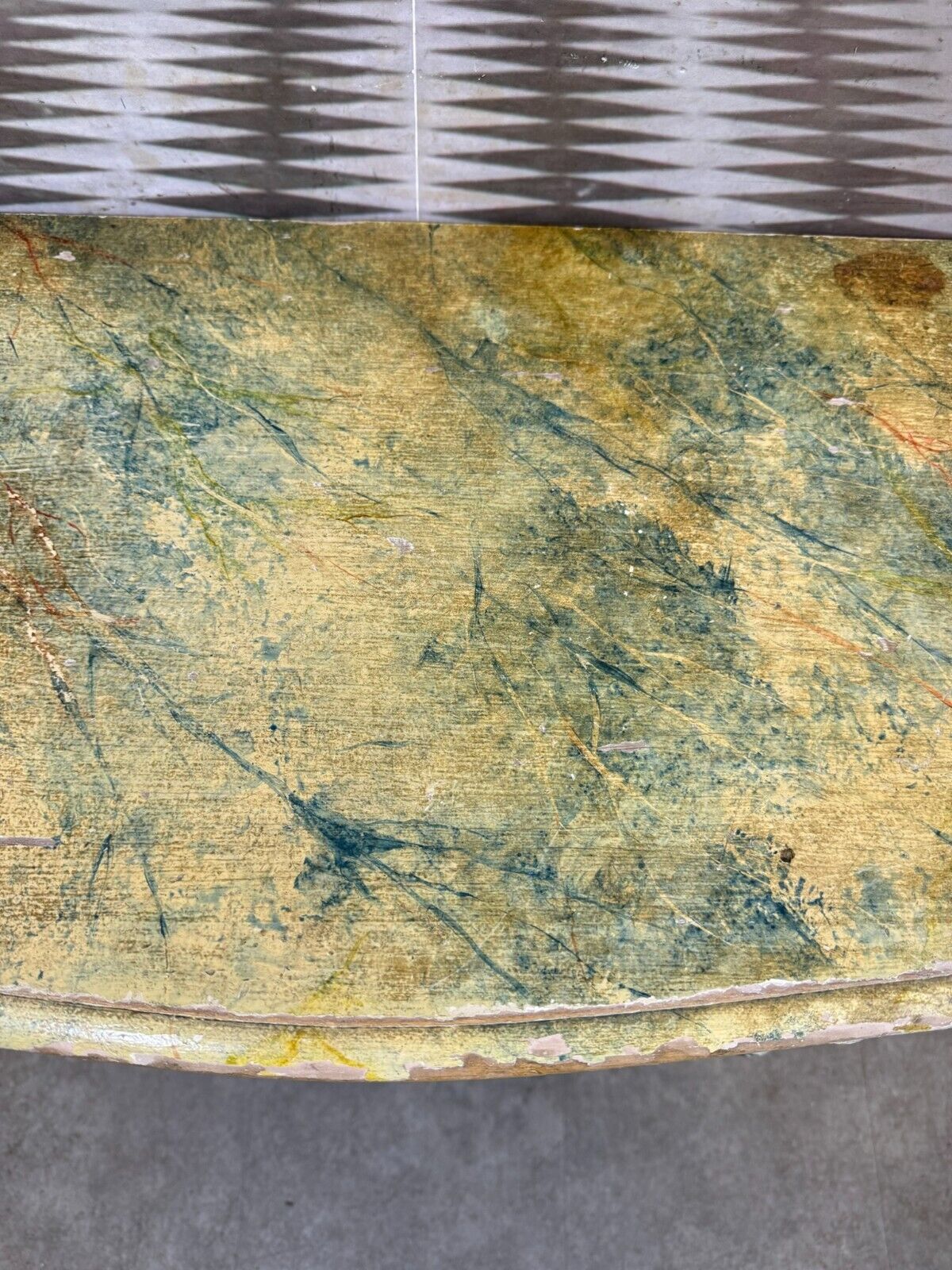 Vintage Kommode in barockem Stil, Oberfläche berieben und zum Teil fleckig. Die Schubladeninneräume sind beklebt und stark fleckig. Die Kommode hat an der gesamten Oberfläche stärkere Fassungsabplatzer. Stabiler Zustand, Abmessungen BTH 65/36/71cm.