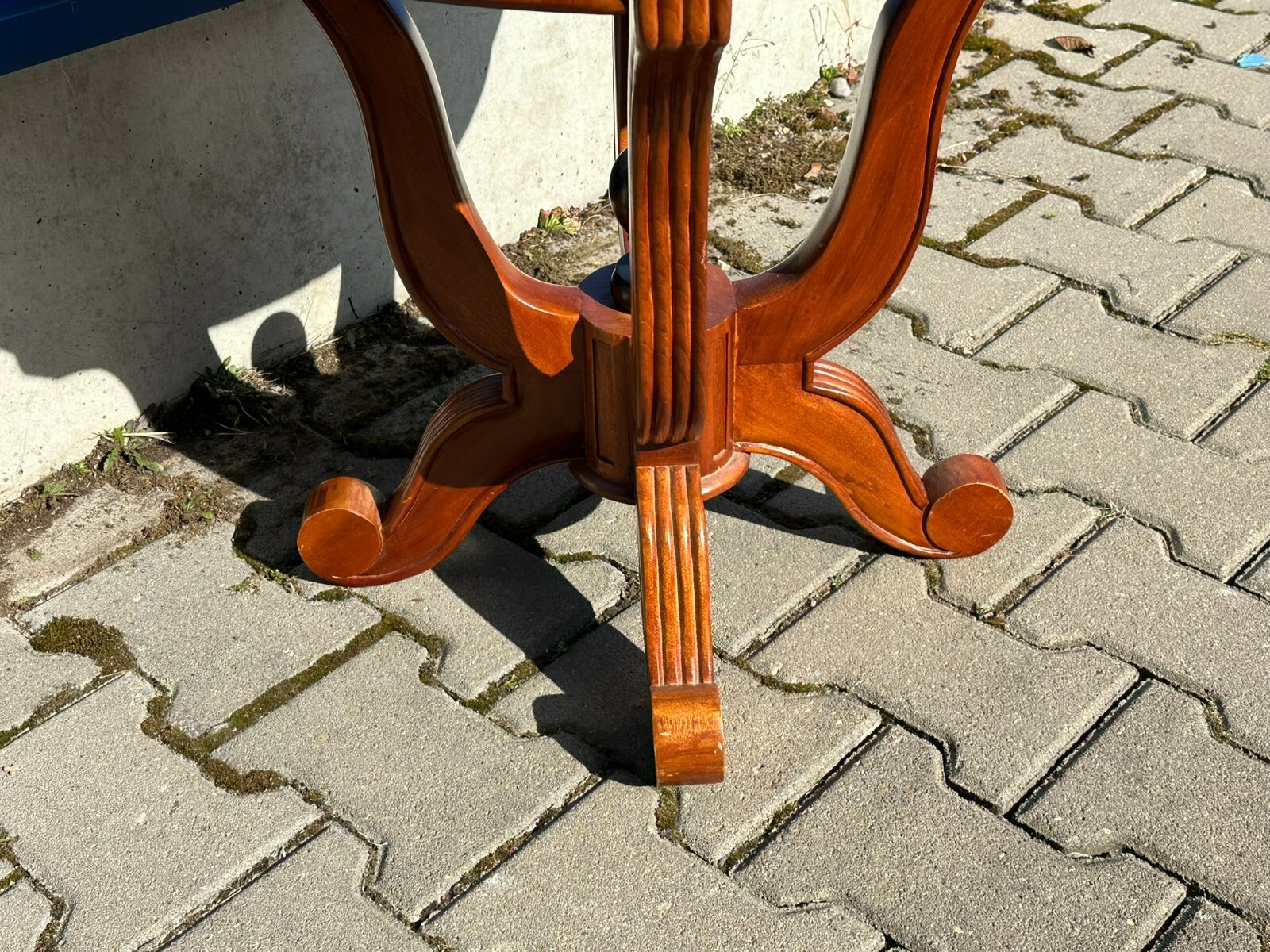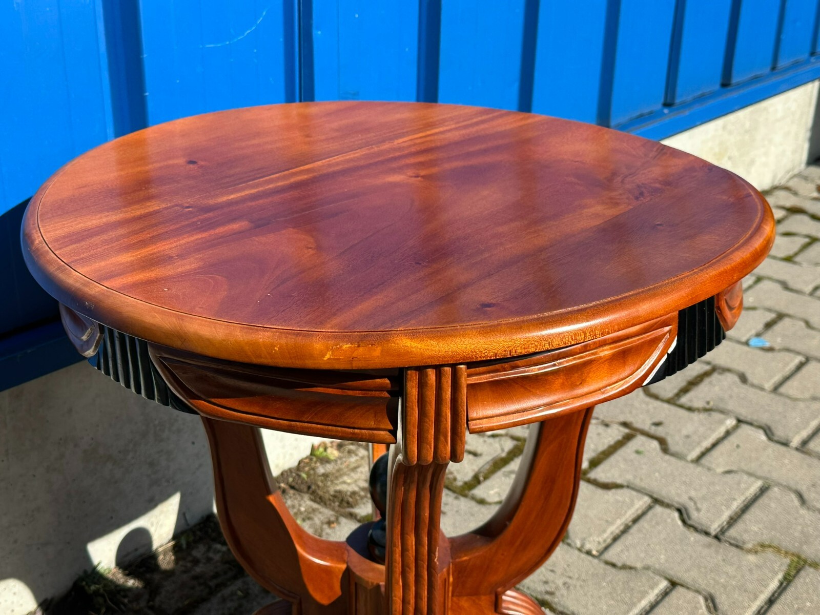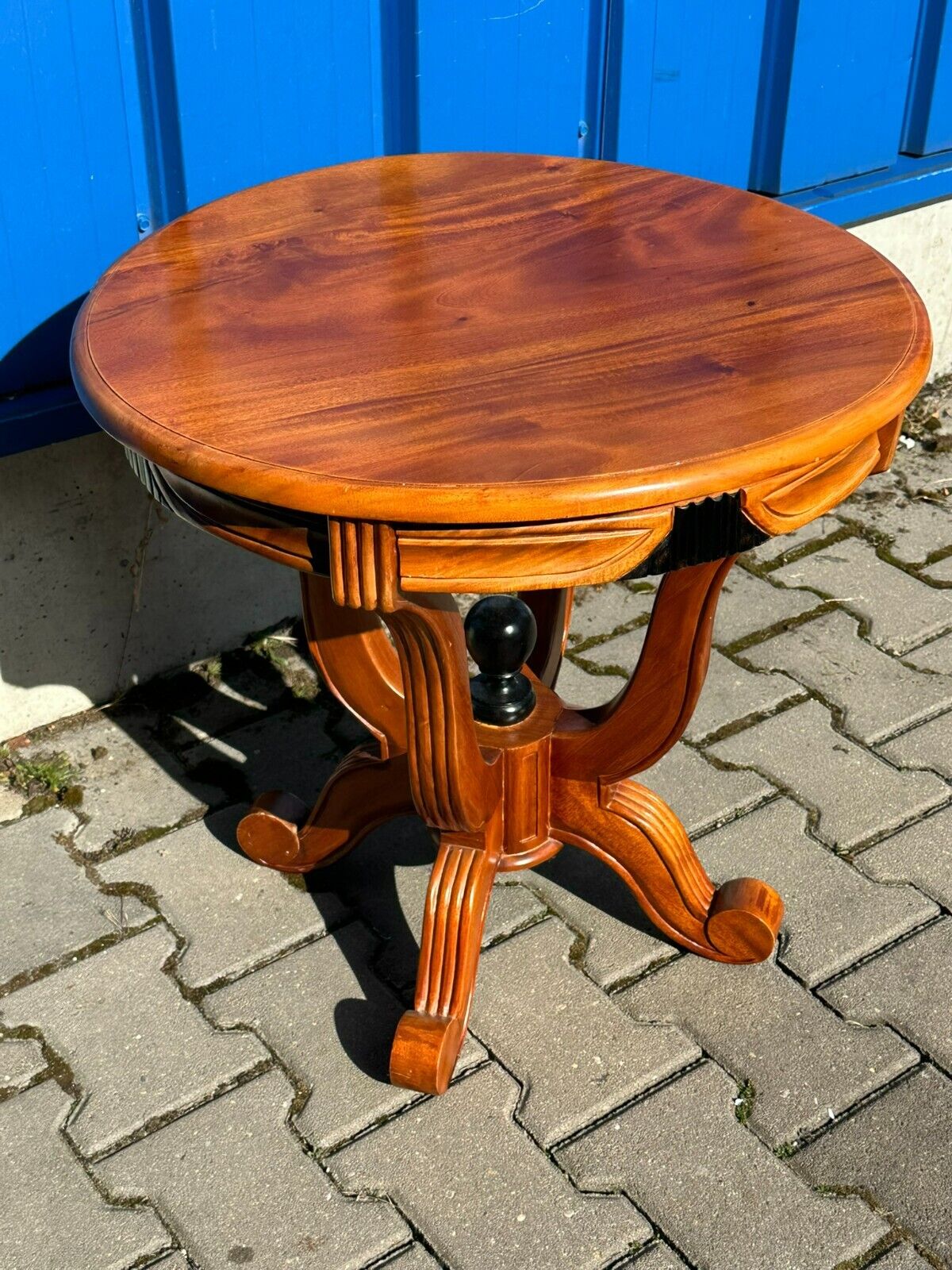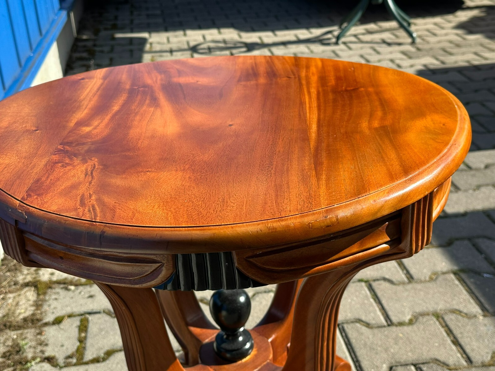 Vintage Beistelltisch nach antikem Vorbild, Holz massiv, zum Teil ebonisiert. Füsse leicht berieben, an der oberen Platte minimale Dehnungsrisse und feinster Abrieb, Platte leicht insich verzogen. Höhe / Durchmesser 58/58cm.