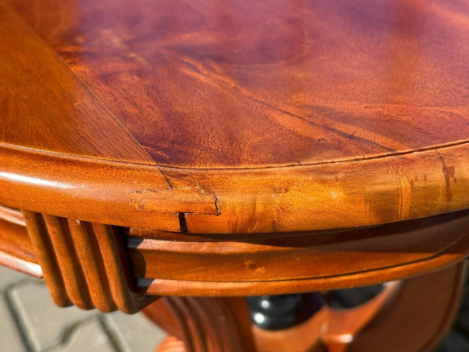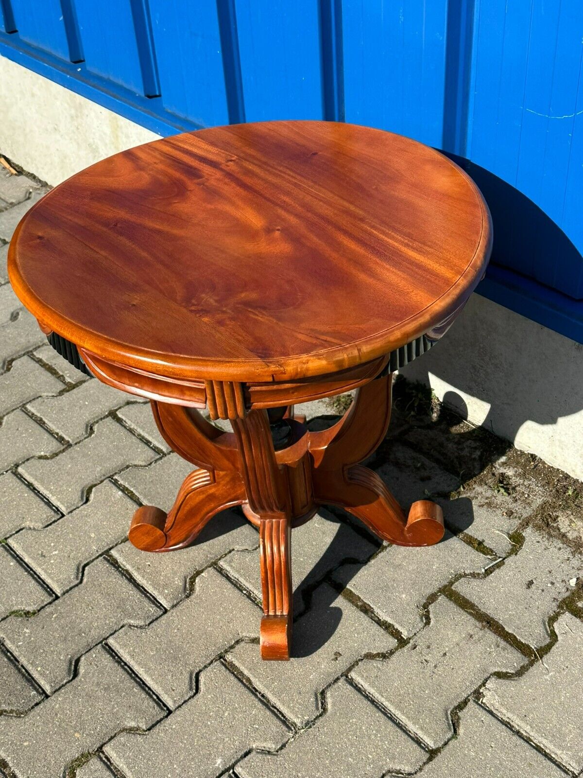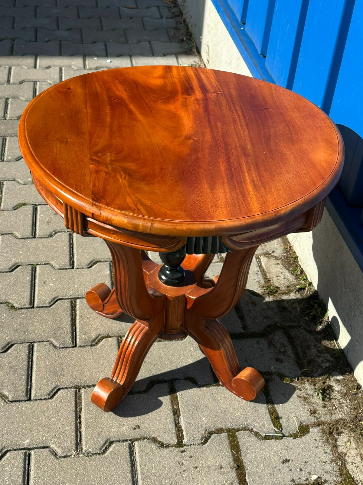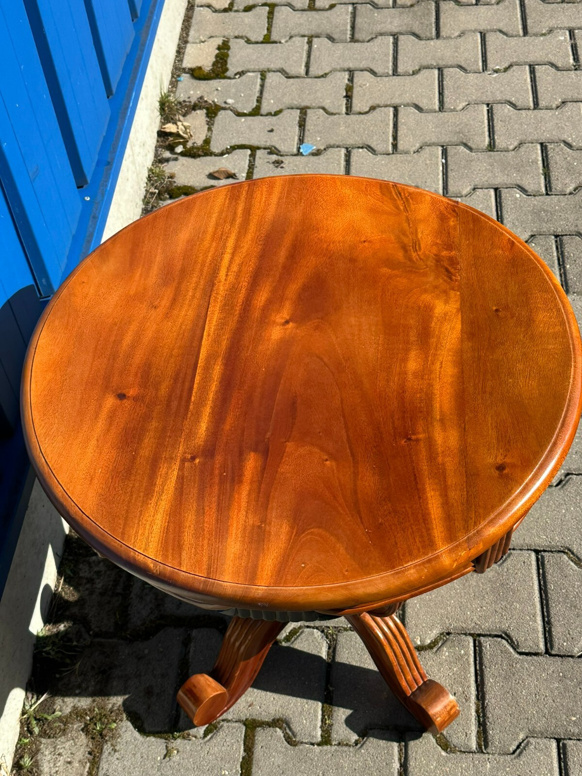 Vintage Beistelltisch nach antikem Vorbild, Holz massiv, zum Teil ebonisiert. Füsse leicht berieben, an der oberen Platte minimale Dehnungsrisse und feinster Abrieb, Platte leicht insich verzogen. Höhe / Durchmesser 58/58cm.