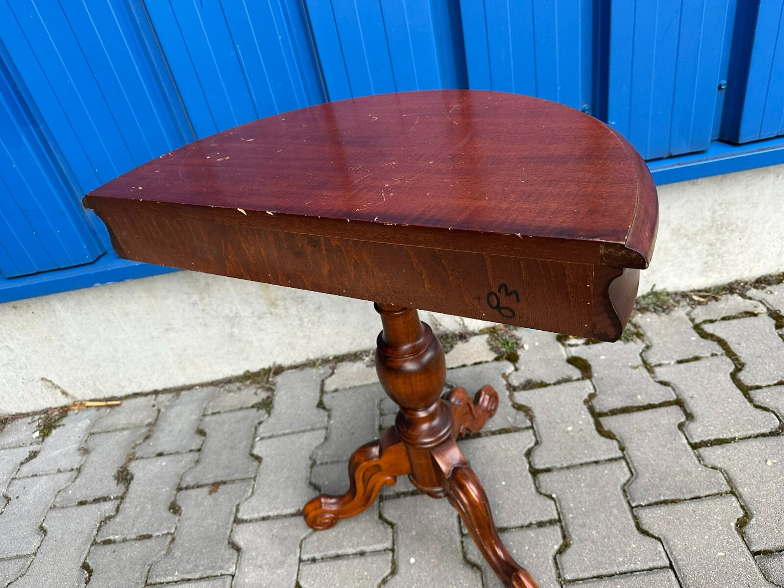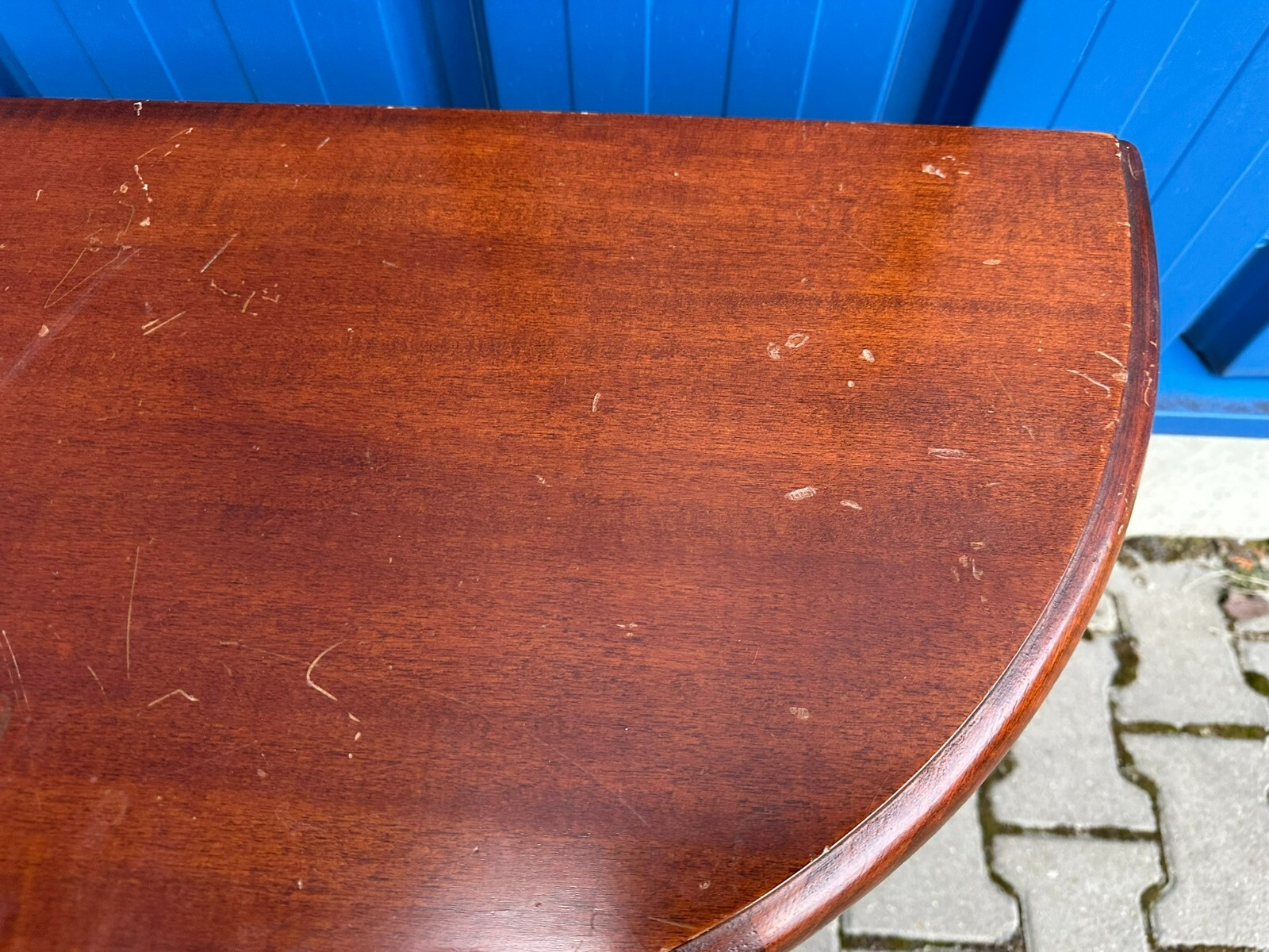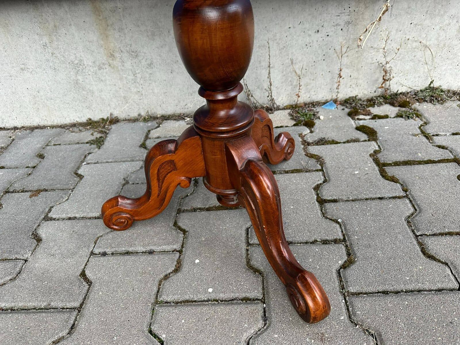 Alter Beistelltisch nach antikem Vorbild. Holz, Mahagoni gebeizt, an der oberen Platte viele Kratzer und Druckstellen, Abmessungen BTH: 63x35x67cm.