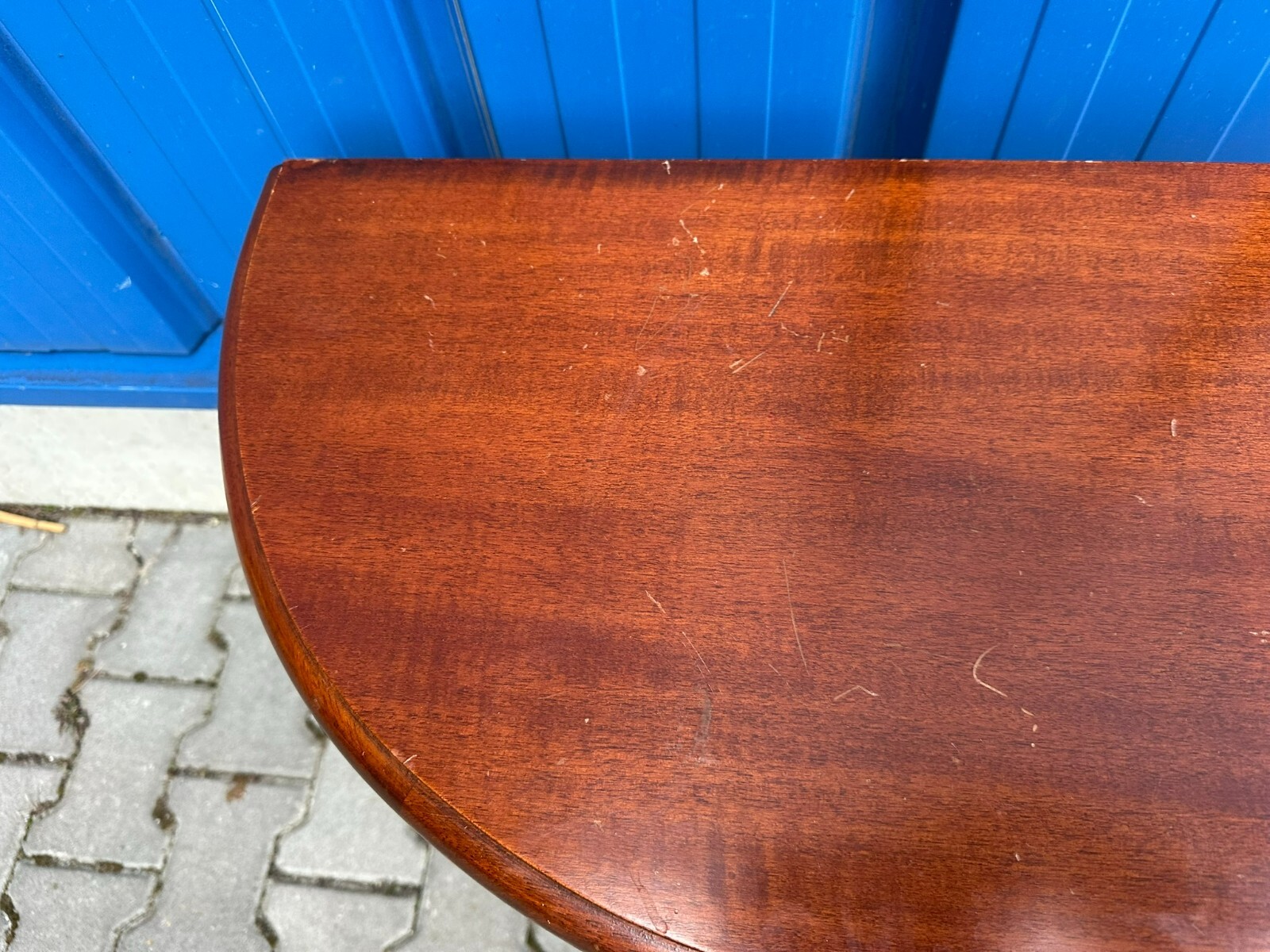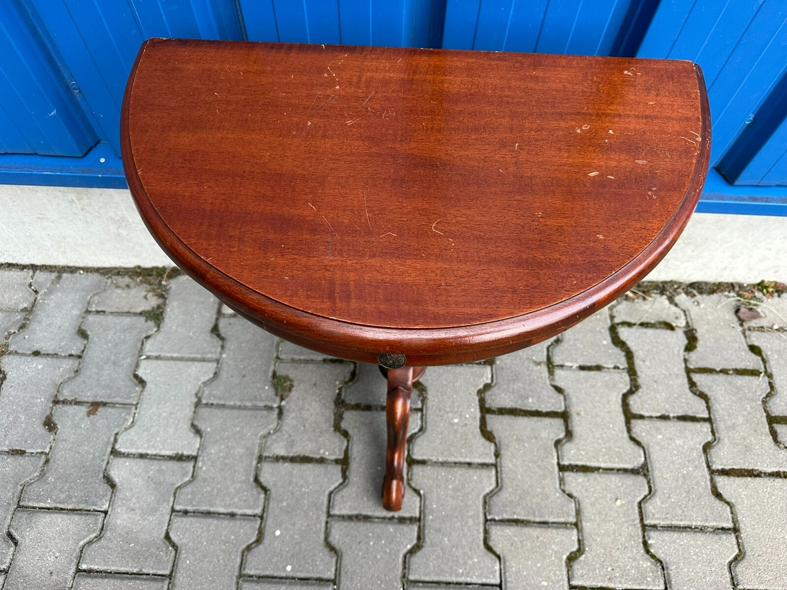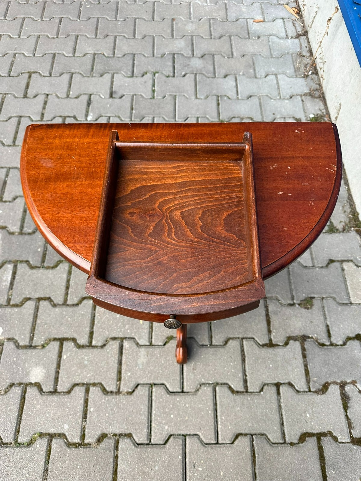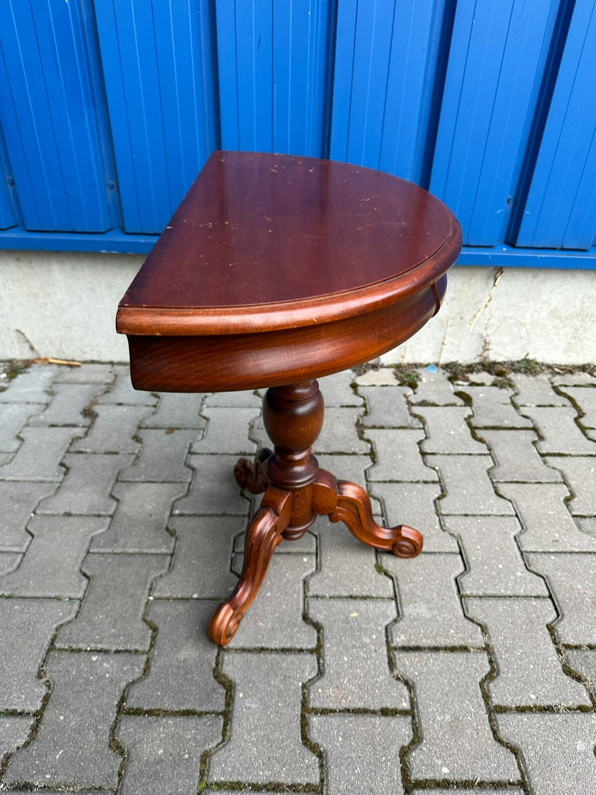 Alter Beistelltisch nach antikem Vorbild. Holz, Mahagoni gebeizt, an der oberen Platte viele Kratzer und Druckstellen, Abmessungen BTH: 63x35x67cm.