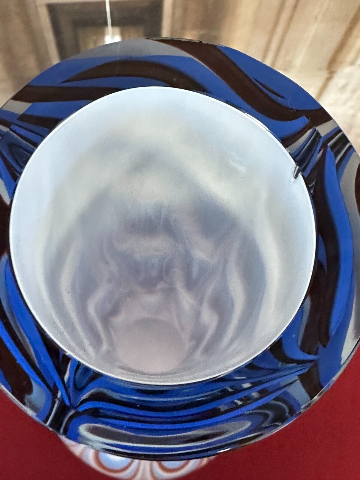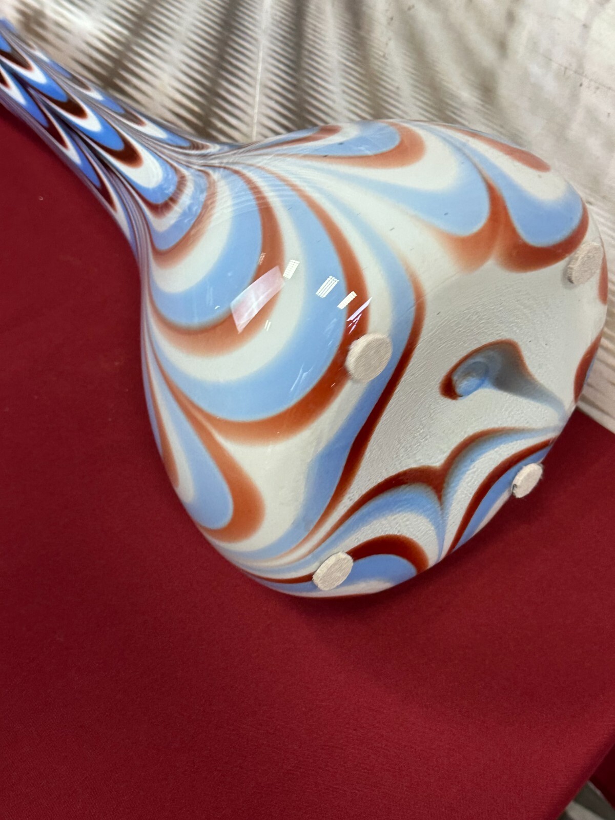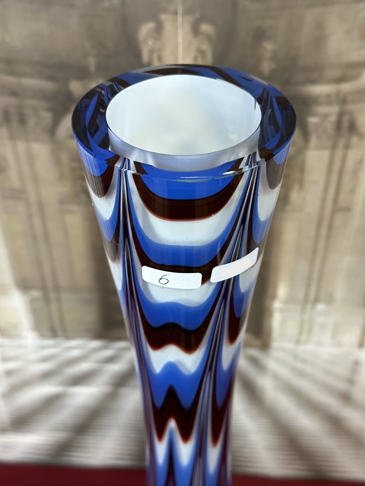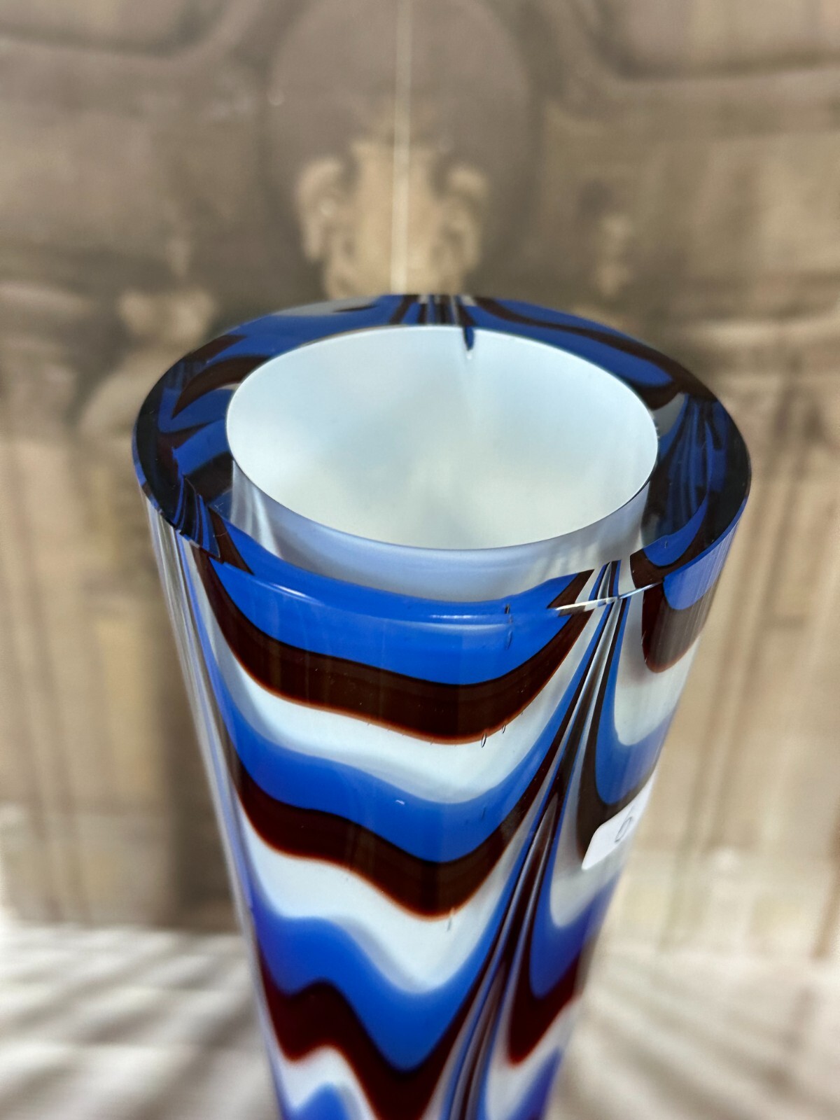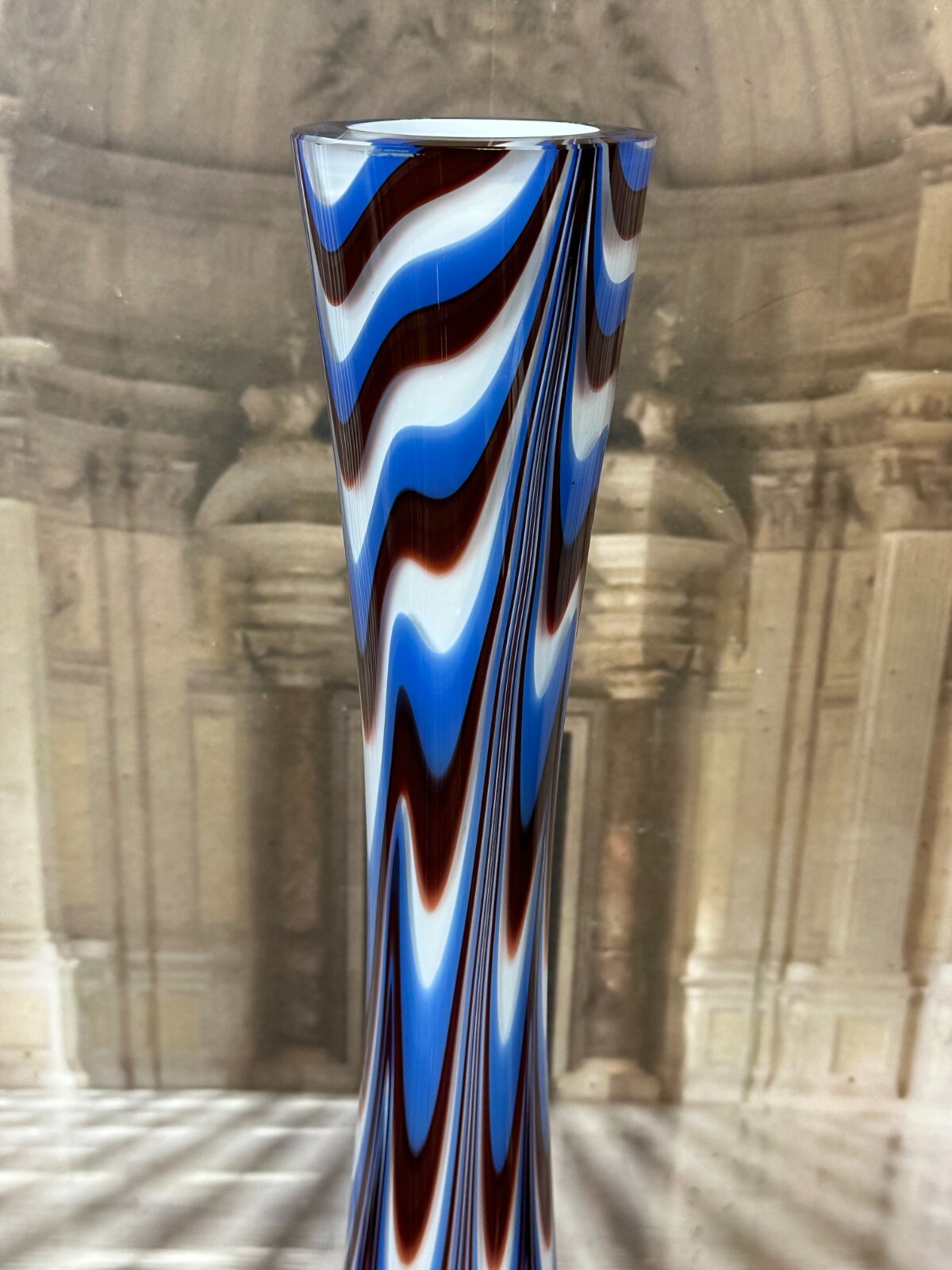 Sehr schöne, Vintage Lollipop Space Age Bodenvase aus Glas, Schott-Zwiesel, nicht signiert, 1970-80-er Jahre. Mundgeblasen, Halsinnenseite kleiner Chip, kleine Kratzer, am Bodenrand leicht berieben. Im Glas kleinere Bläschen, innen sauber. Abmessungen Höhe/ Durchmesser: 72x25cm.