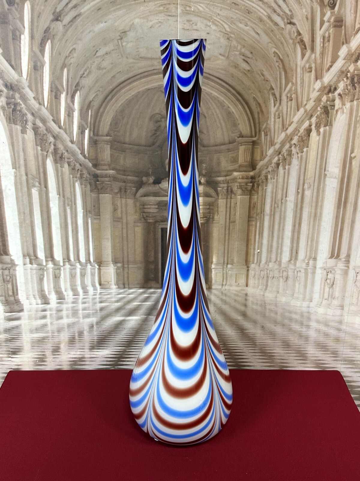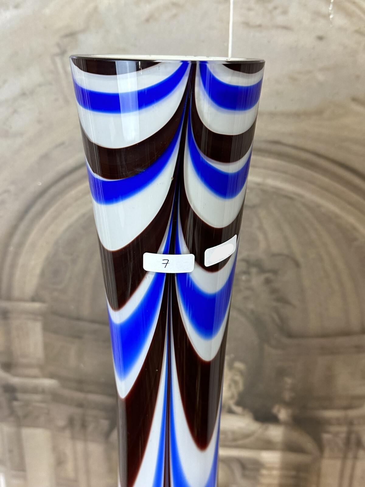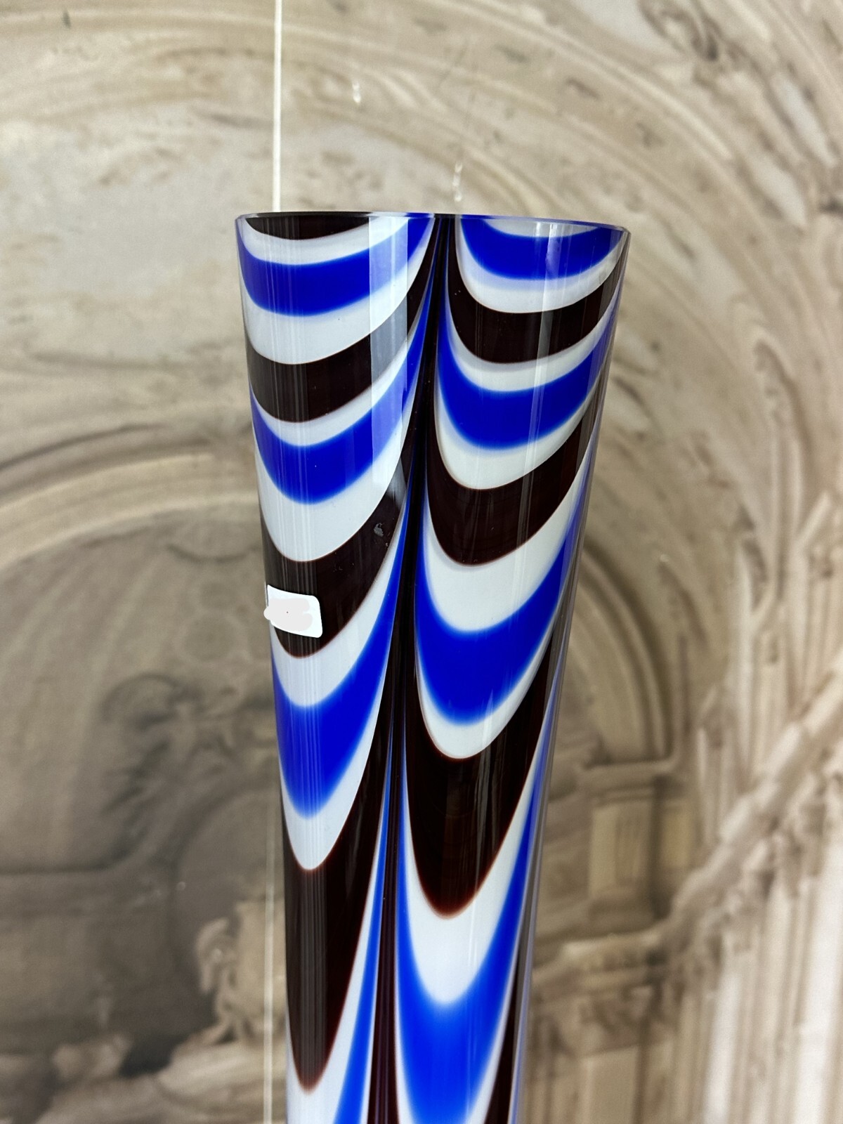Sehr schöne, Vintage Lollipop Space Age Bodenvase aus Glas, Schott-Zwiesel, nicht signiert, 1970-80-er Jahre. Mundgeblasen, Halsinnenseite mit großem Chip in der weißen Schicht, an der Wandung kleinere Brandfehler, am Bodenring leicht berieben. Im Glas kleinere Bläschen, innen sauber. Abmessungen Höhe/ Durchmesser: 94x27cm.
