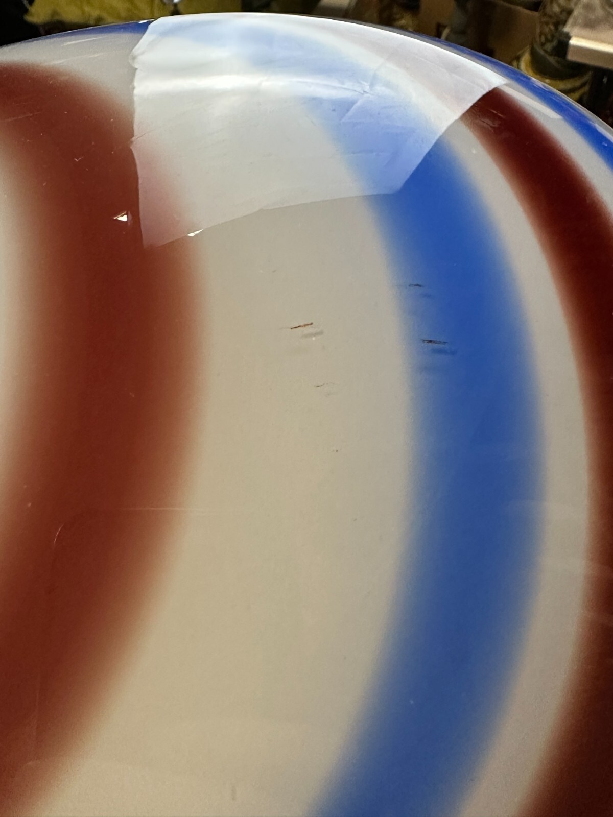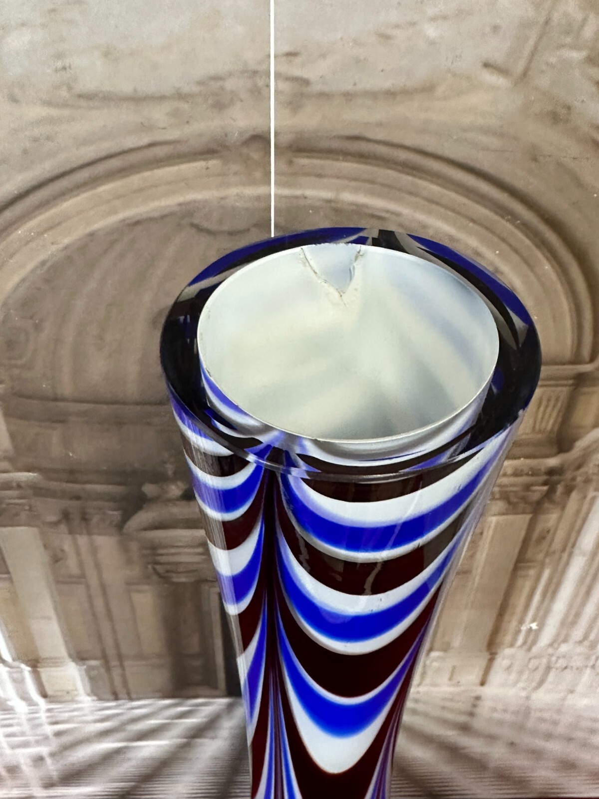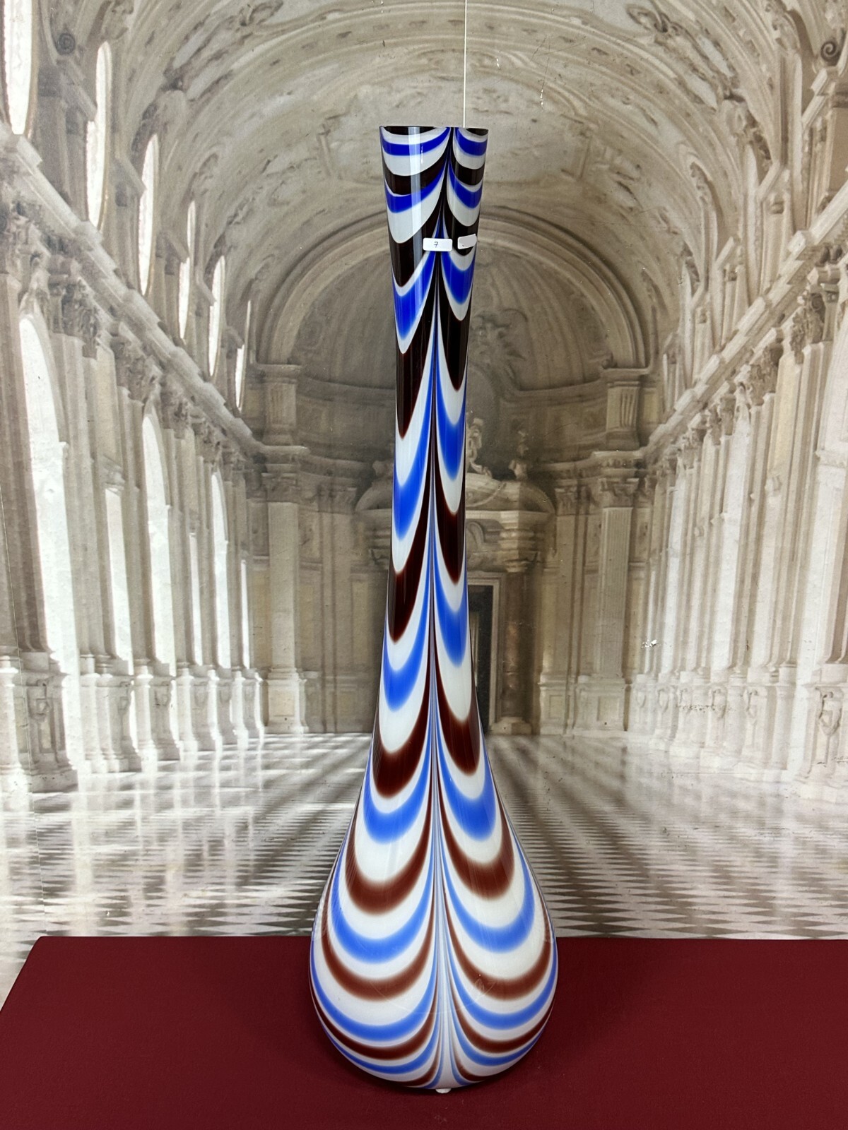 Sehr schöne, Vintage Lollipop Space Age Bodenvase aus Glas, Schott-Zwiesel, nicht signiert, 1970-80-er Jahre. Mundgeblasen, Halsinnenseite mit großem Chip in der weißen Schicht, an der Wandung kleinere Brandfehler, am Bodenring leicht berieben. Im Glas kleinere Bläschen, innen sauber. Abmessungen Höhe/ Durchmesser: 94x27cm.