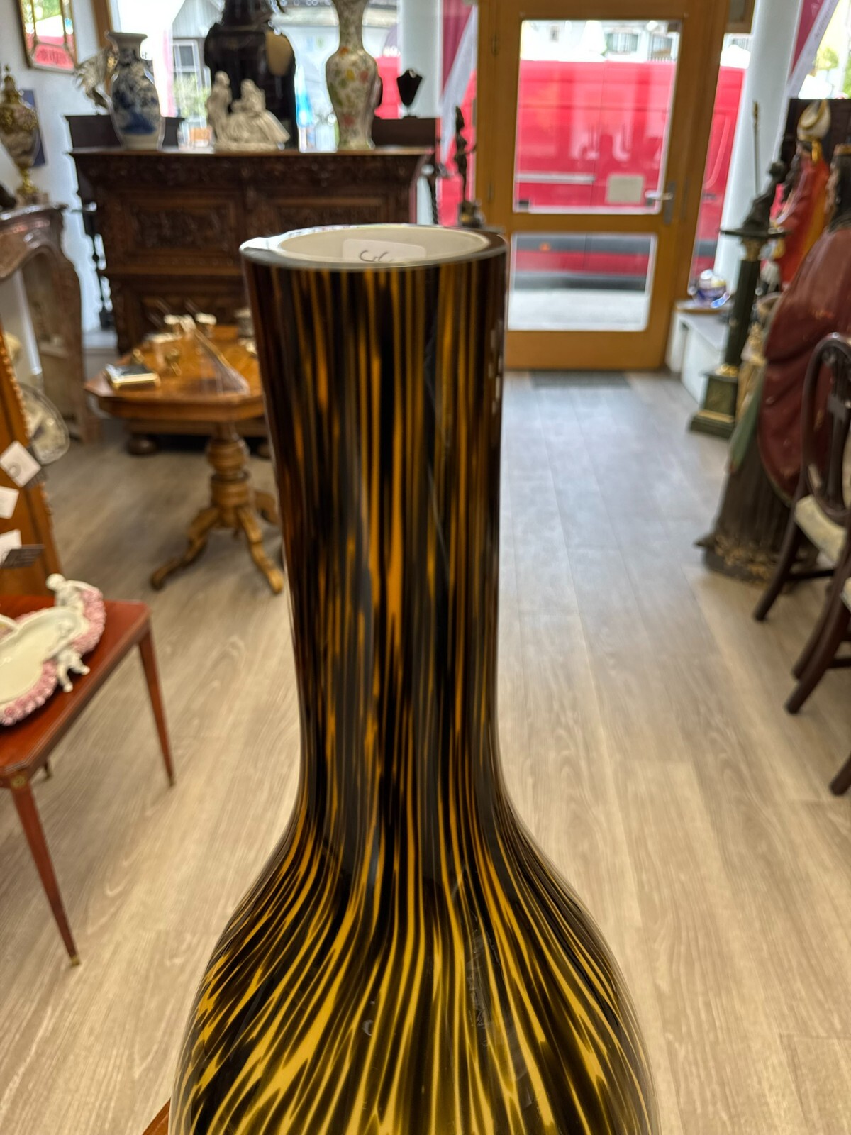 Sehr schöne Bodenvase aus Glas, nicht signiert, 1970-80-er Jahre. Mundgeblasen, ohne Chips. Im Glas kleinere Bläschen, innen sauber. Abmessungen Höhe/ Durchmesser: 72x27cm.