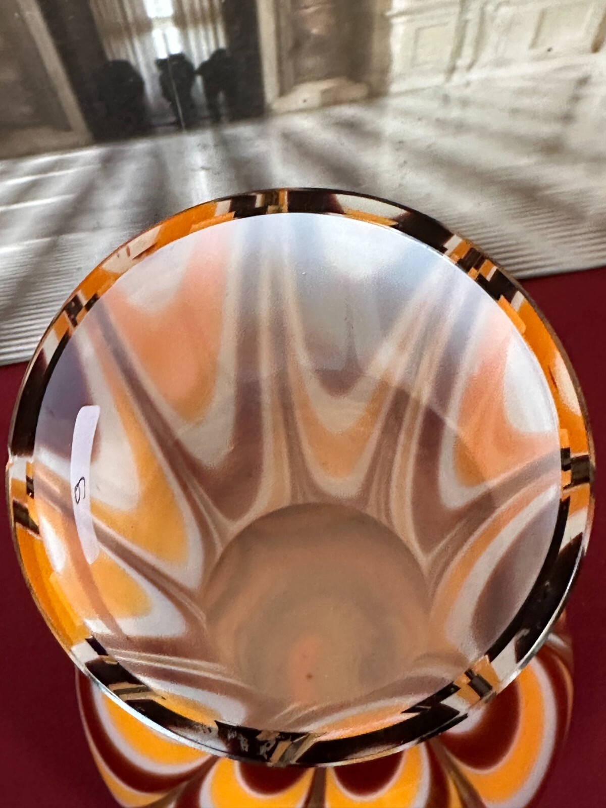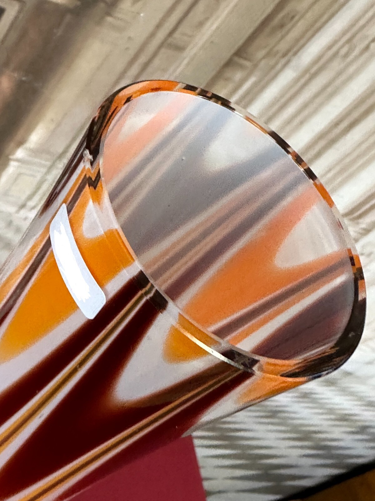 Sehr schöne, Vintage Lollipop Space Age Bodenvase aus Glas, Schott-Zwiesel, nicht signiert, 1970-80-er Jahre. Mundgeblasen, Halsaußenseite mit kleinem Chip, an der Wandung zum Teil leicht berieben, am Bodenring leichter Abrieb. Im Glas kleinere Bläschen, innen sauber. Abmessungen Höhe/ Durchmesser: 62x28cm.
