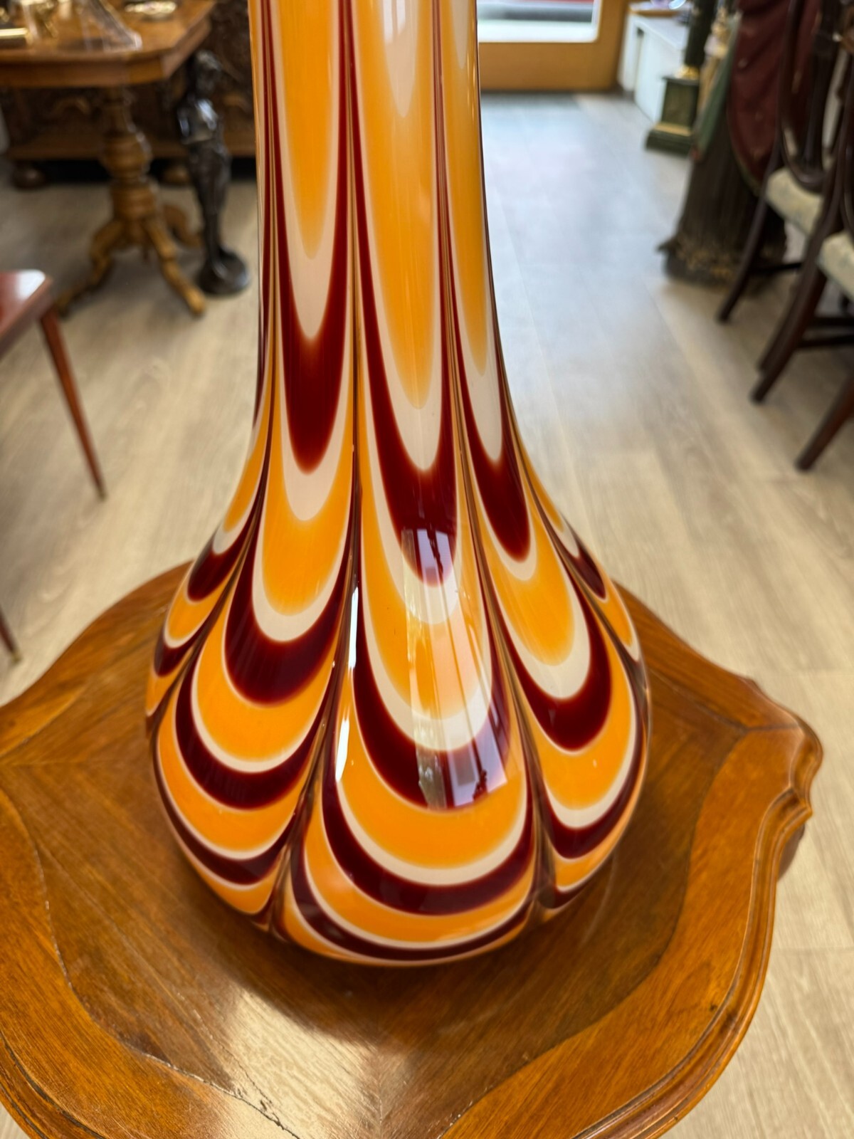 Sehr schöne, Vintage Lollipop Space Age Bodenvase aus Glas, Schott-Zwiesel, nicht signiert, 1970-80-er Jahre. Mundgeblasen, ohne Chips. Im Glas kleinere Bläschen, innen sauber. Abmessungen Höhe/ Durchmesser: 81x26cm.