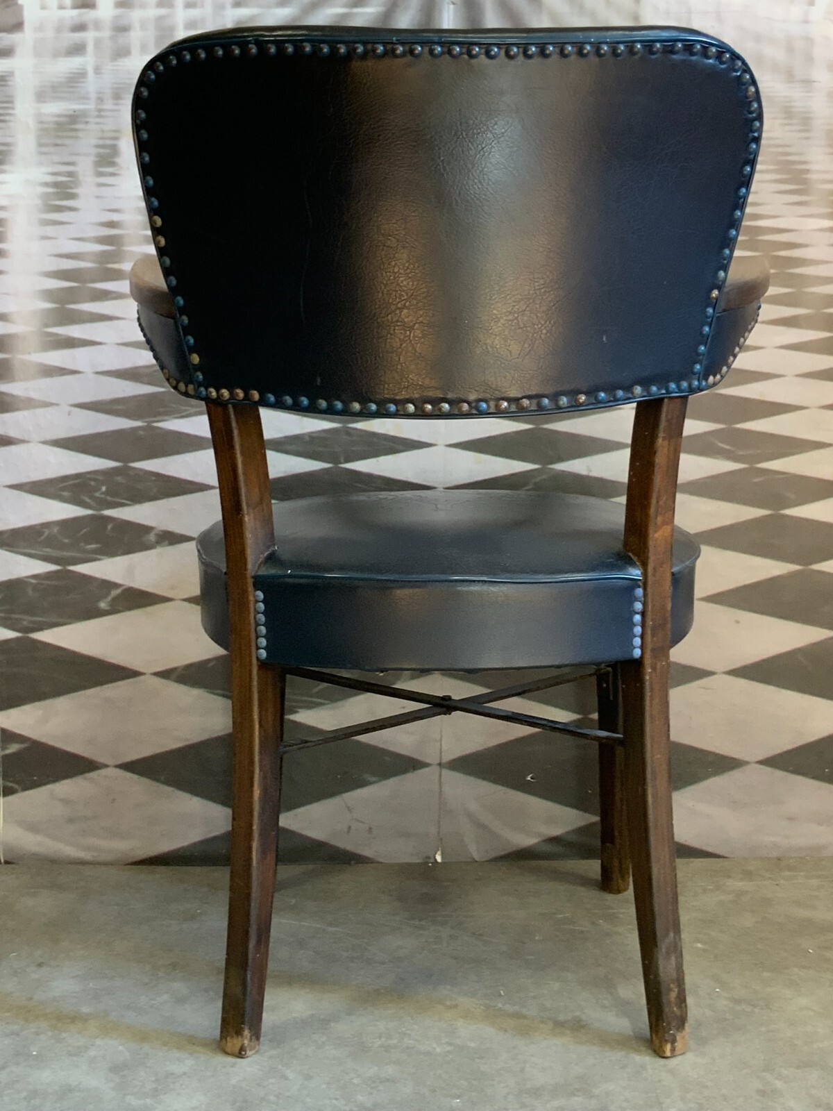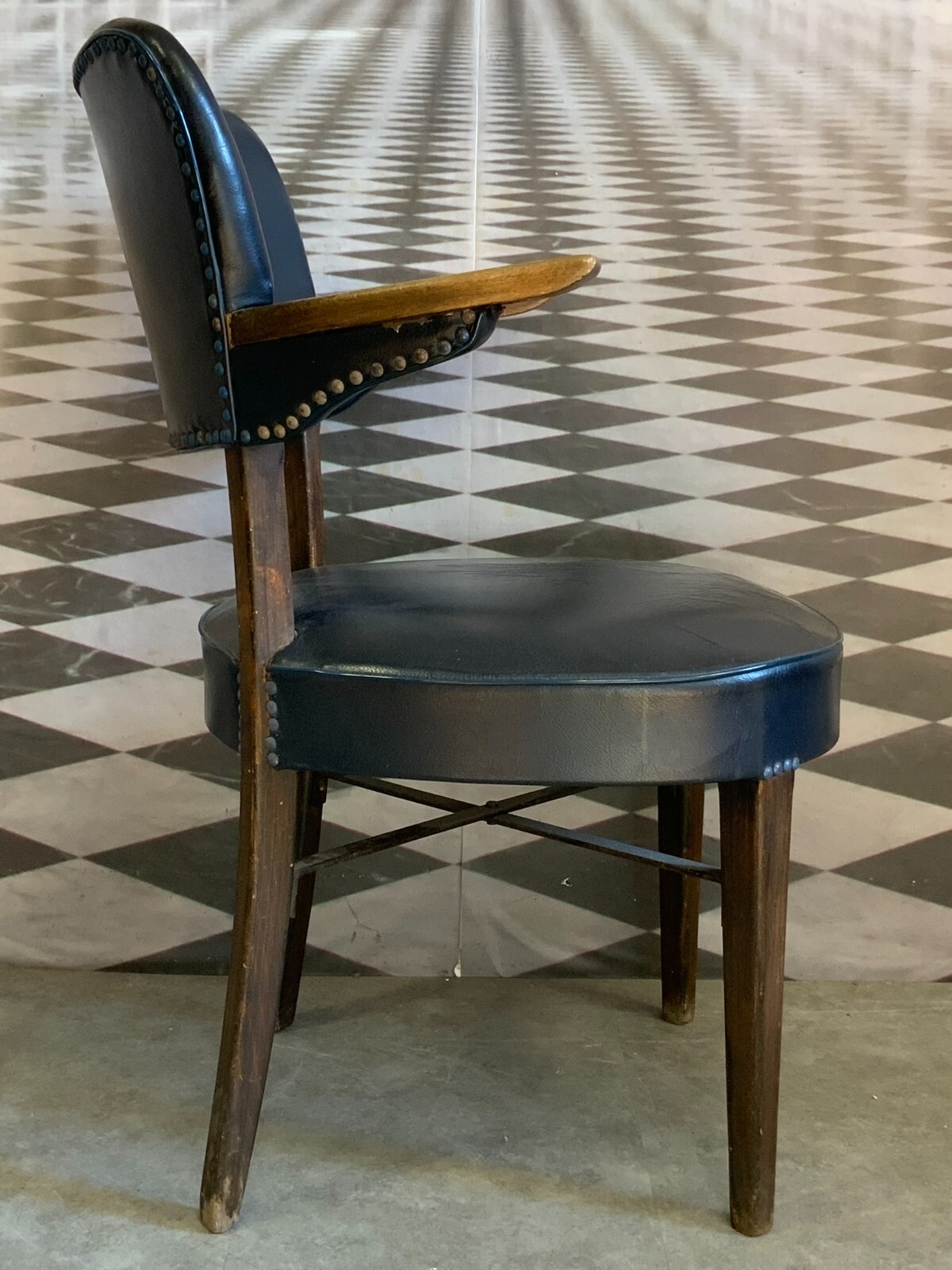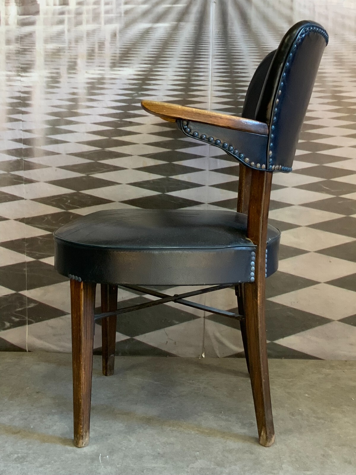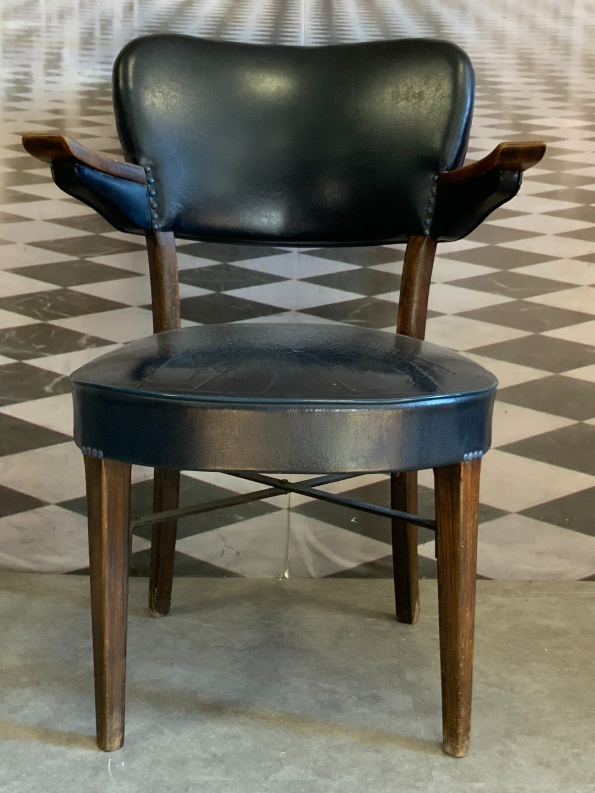 Vintage Designer Stuhl mit Armlehnen. Holzgestell mit Lederpolsterung. Die Armlehnen zum Teil berieben, guter Sitzkomfort. Die Beine sind ebenfalls berieben. An der Sitzfläche mittig kleiner Riss, die Lederstrukur ist insgesamt rissig. Abmessungen BTH 60/58/82cm, Sitzhöhe 42cm, Sitzbreite 48cm.