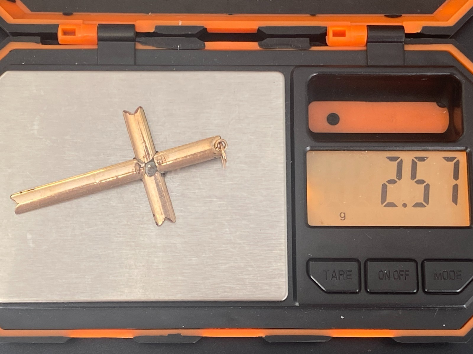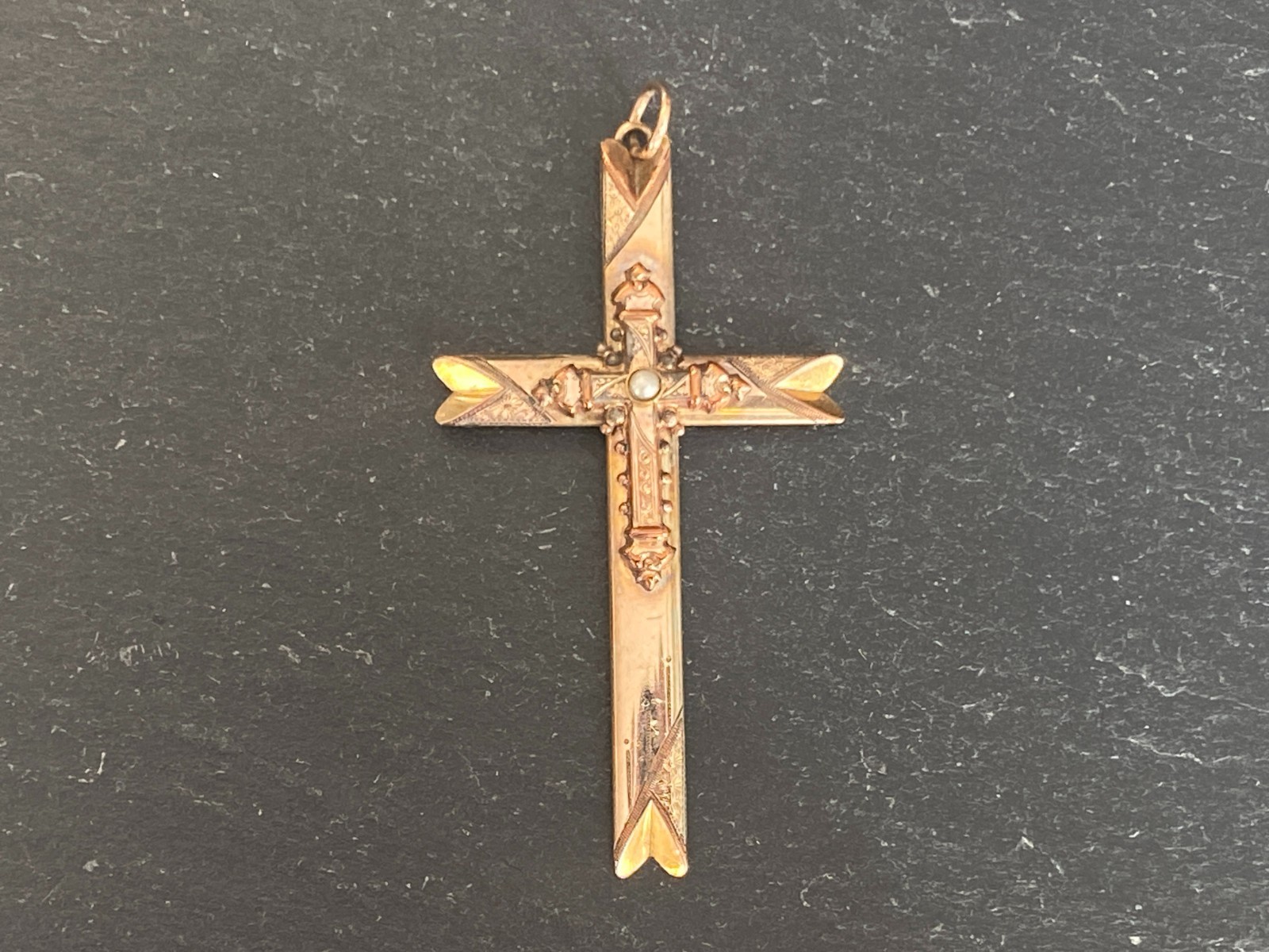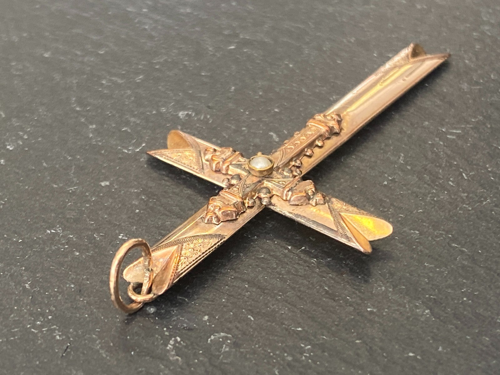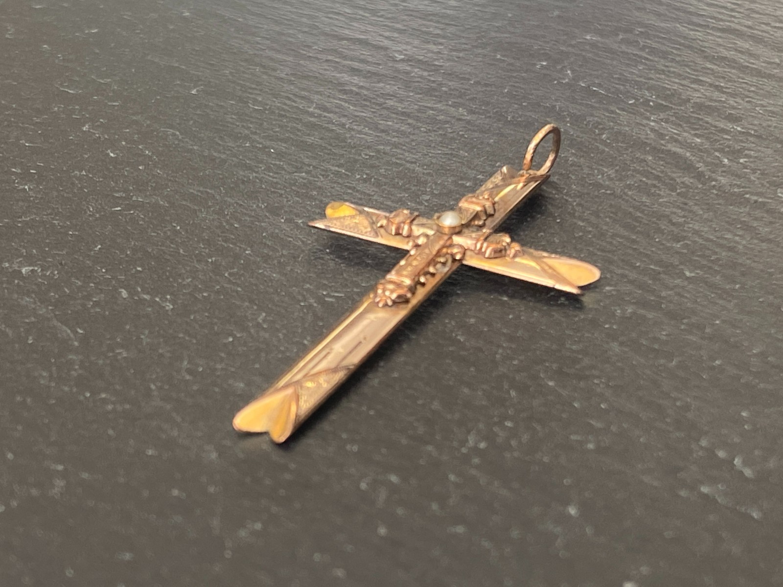Alter Kreuzanhänger, Metall mit massiver Vergoldung mit ca 27,7% Goldanteil, das kleine aufgesetzte Kreuz aus Metall, mit filigranem Dekor und einer zentralen Perle. Die Perle hat einen Durchmesser von ca. 2,4mm, auf der Oberfläche sind keine größeren Abplatzer zu sehen. Der Anhänger ist insgesamt berieben und angelaufen, hier sieht man das darunterliegende Metall an ein Paar Stellen. Das Dekor wirkt vollständig, keine Bruchstellen. Rückseitig sieht man, wo der Anhänger zusammengelötet wurde. Insgesamt ein guter altersentsprechender Zustand, BTH gesamt ca. 3/0,48/5,64cm, Gesamtgewicht ca. 2,57g.