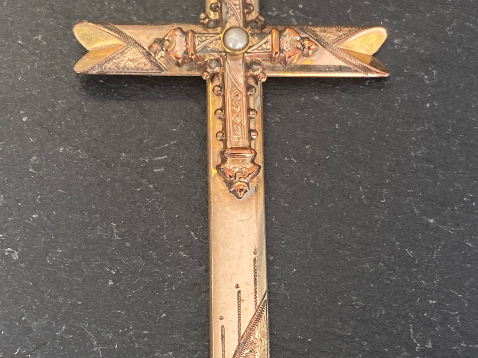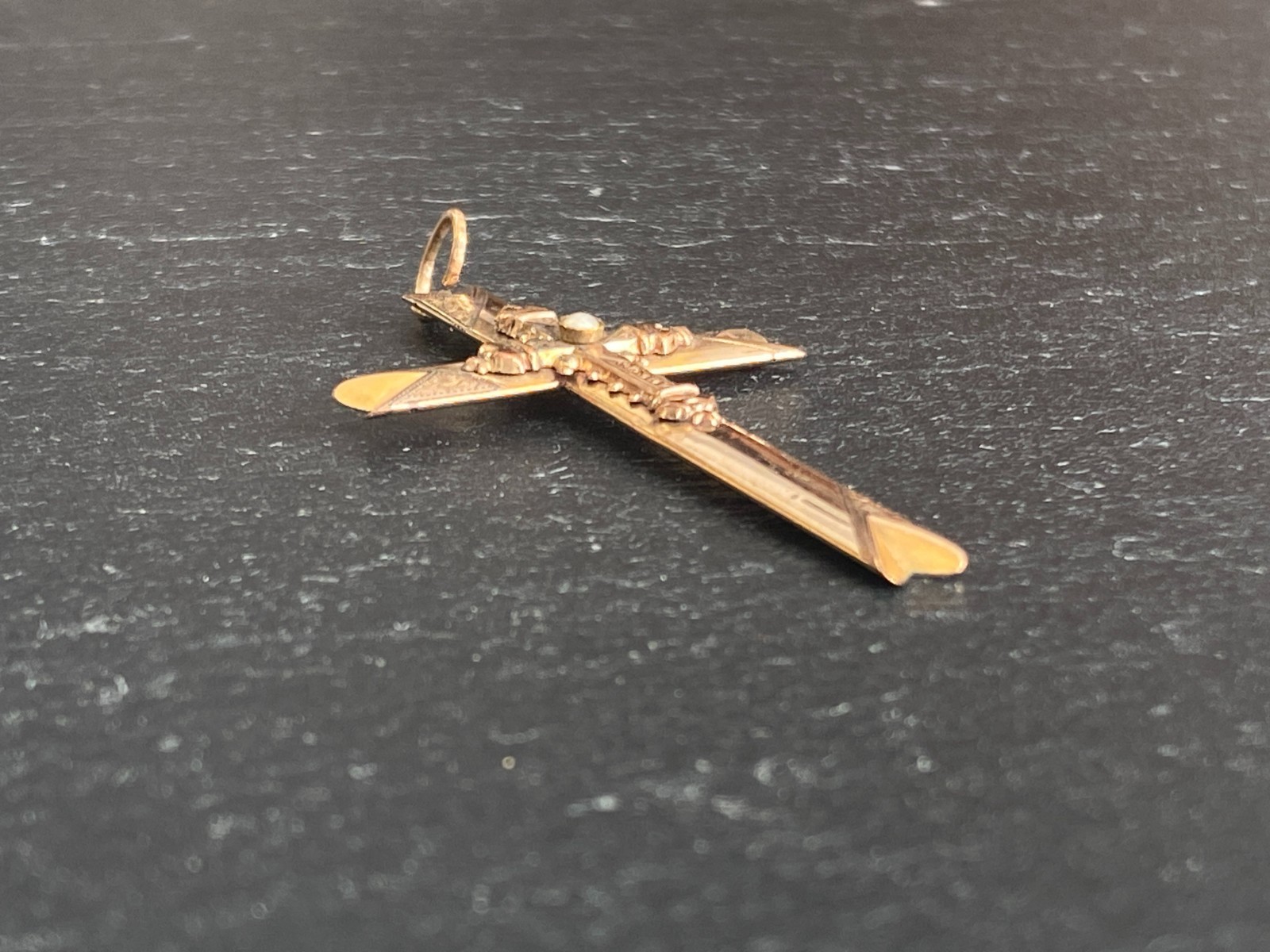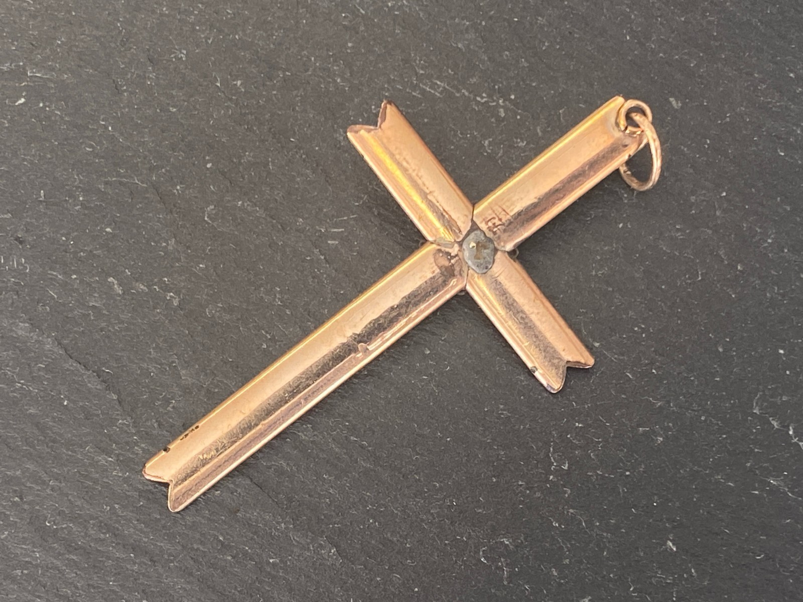 Alter Kreuzanhänger, Metall mit massiver Vergoldung mit ca 27,7% Goldanteil, das kleine aufgesetzte Kreuz aus Metall, mit filigranem Dekor und einer zentralen Perle. Die Perle hat einen Durchmesser von ca. 2,4mm, auf der Oberfläche sind keine größeren Abplatzer zu sehen. Der Anhänger ist insgesamt berieben und angelaufen, hier sieht man das darunterliegende Metall an ein Paar Stellen. Das Dekor wirkt vollständig, keine Bruchstellen. Rückseitig sieht man, wo der Anhänger zusammengelötet wurde. Insgesamt ein guter altersentsprechender Zustand, BTH gesamt ca. 3/0,48/5,64cm, Gesamtgewicht ca. 2,57g.