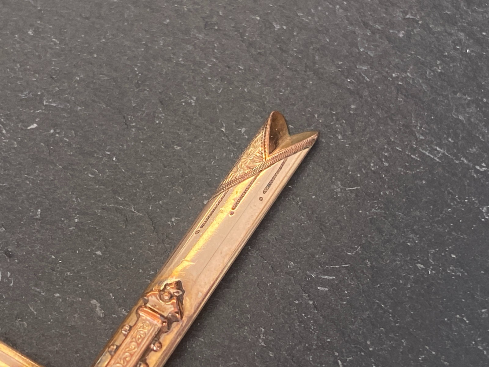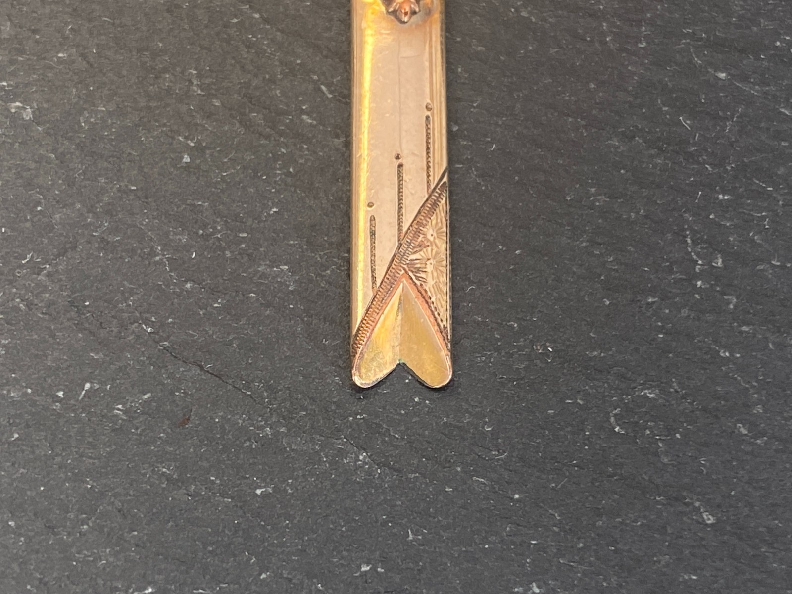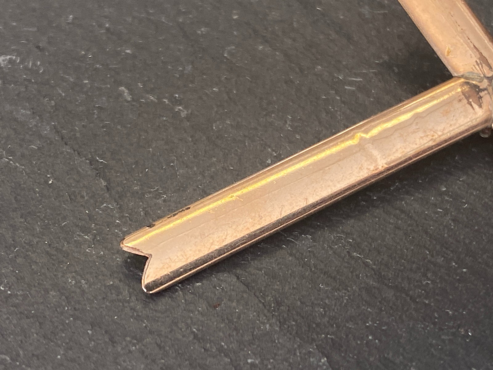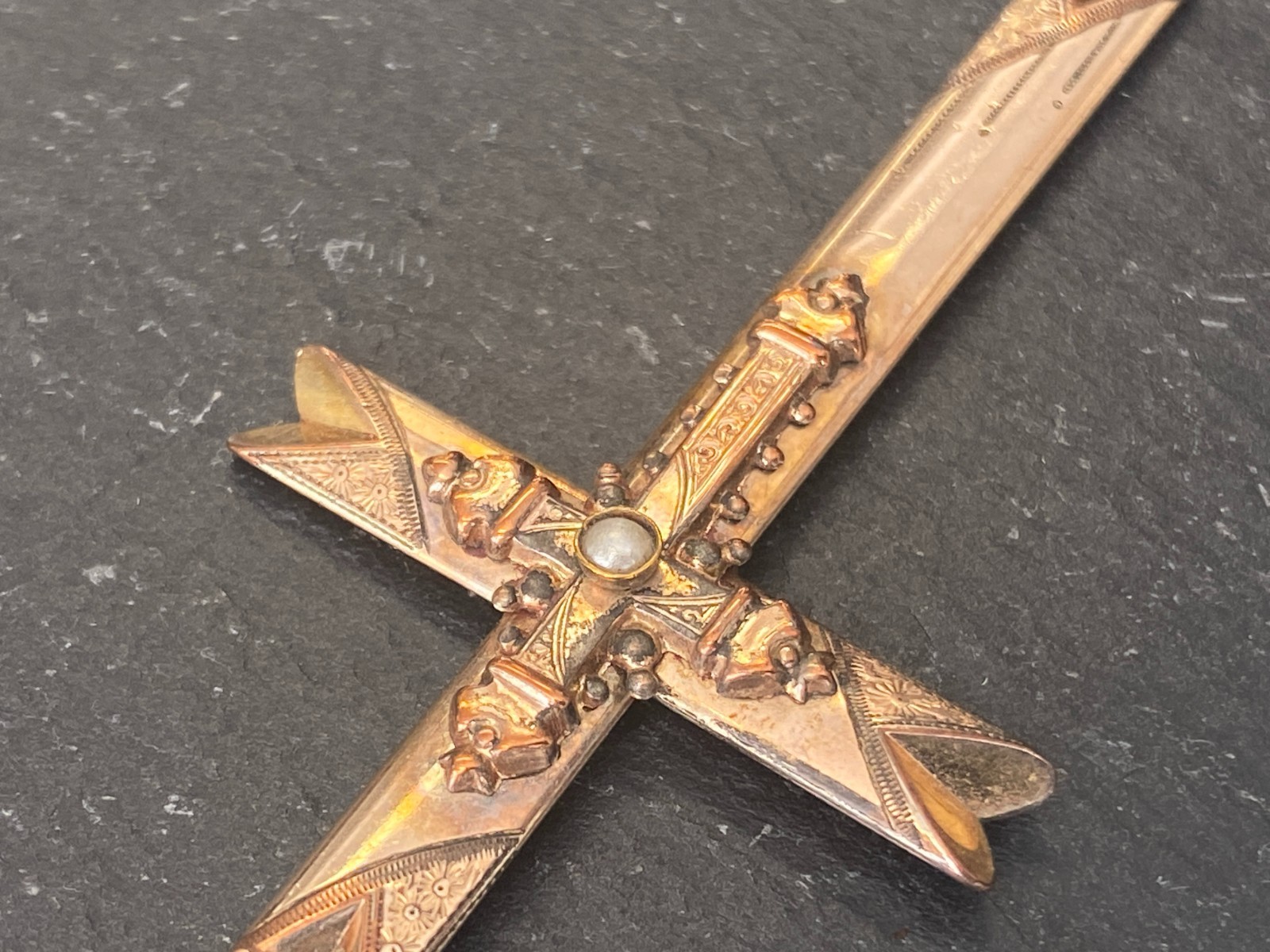 Alter Kreuzanhänger, Metall mit massiver Vergoldung mit ca 27,7% Goldanteil, das kleine aufgesetzte Kreuz aus Metall, mit filigranem Dekor und einer zentralen Perle. Die Perle hat einen Durchmesser von ca. 2,4mm, auf der Oberfläche sind keine größeren Abplatzer zu sehen. Der Anhänger ist insgesamt berieben und angelaufen, hier sieht man das darunterliegende Metall an ein Paar Stellen. Das Dekor wirkt vollständig, keine Bruchstellen. Rückseitig sieht man, wo der Anhänger zusammengelötet wurde. Insgesamt ein guter altersentsprechender Zustand, BTH gesamt ca. 3/0,48/5,64cm, Gesamtgewicht ca. 2,57g.