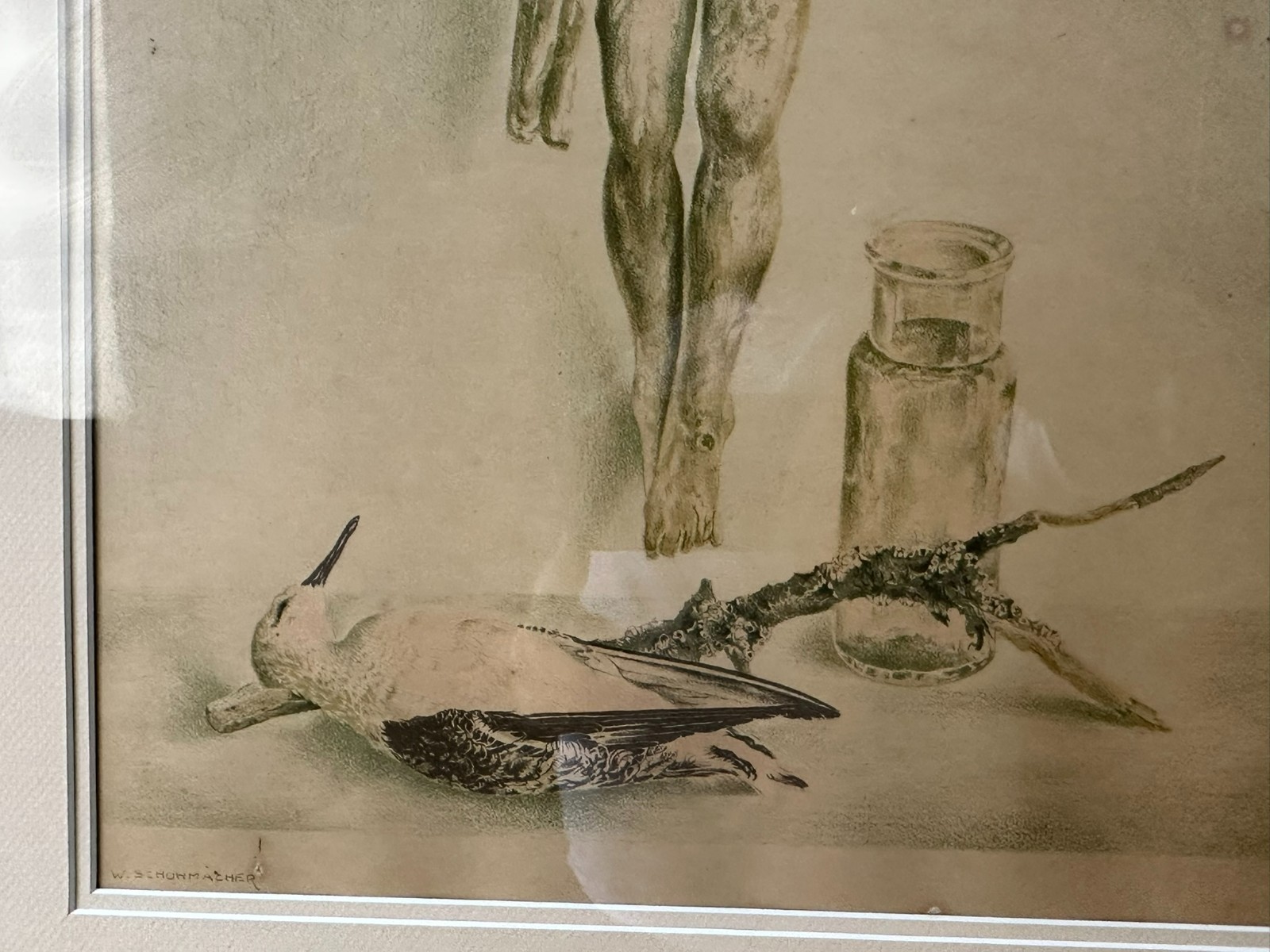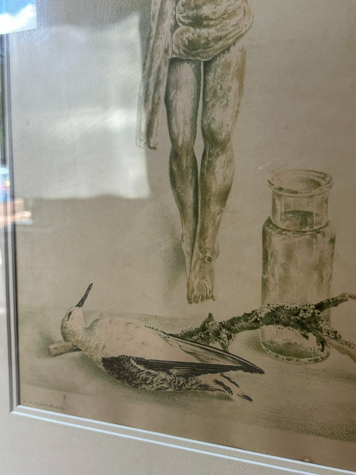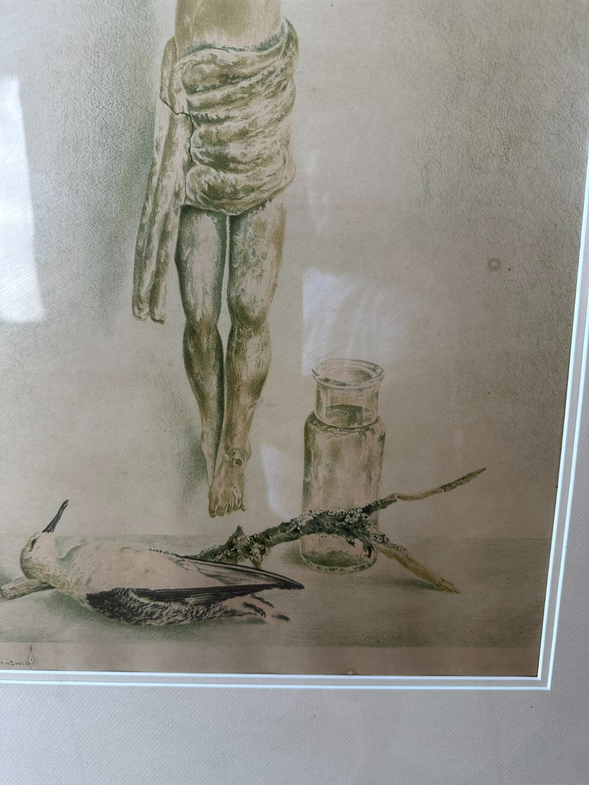Große Litografie auf Papier, unten links signiert, gerahmt hinter Glas. Der Rahmen an den Ecken leicht bestossen, das Blatt ist zum Teil vergilbt und fleckig. Gesamtabmessungen 54x81cm.