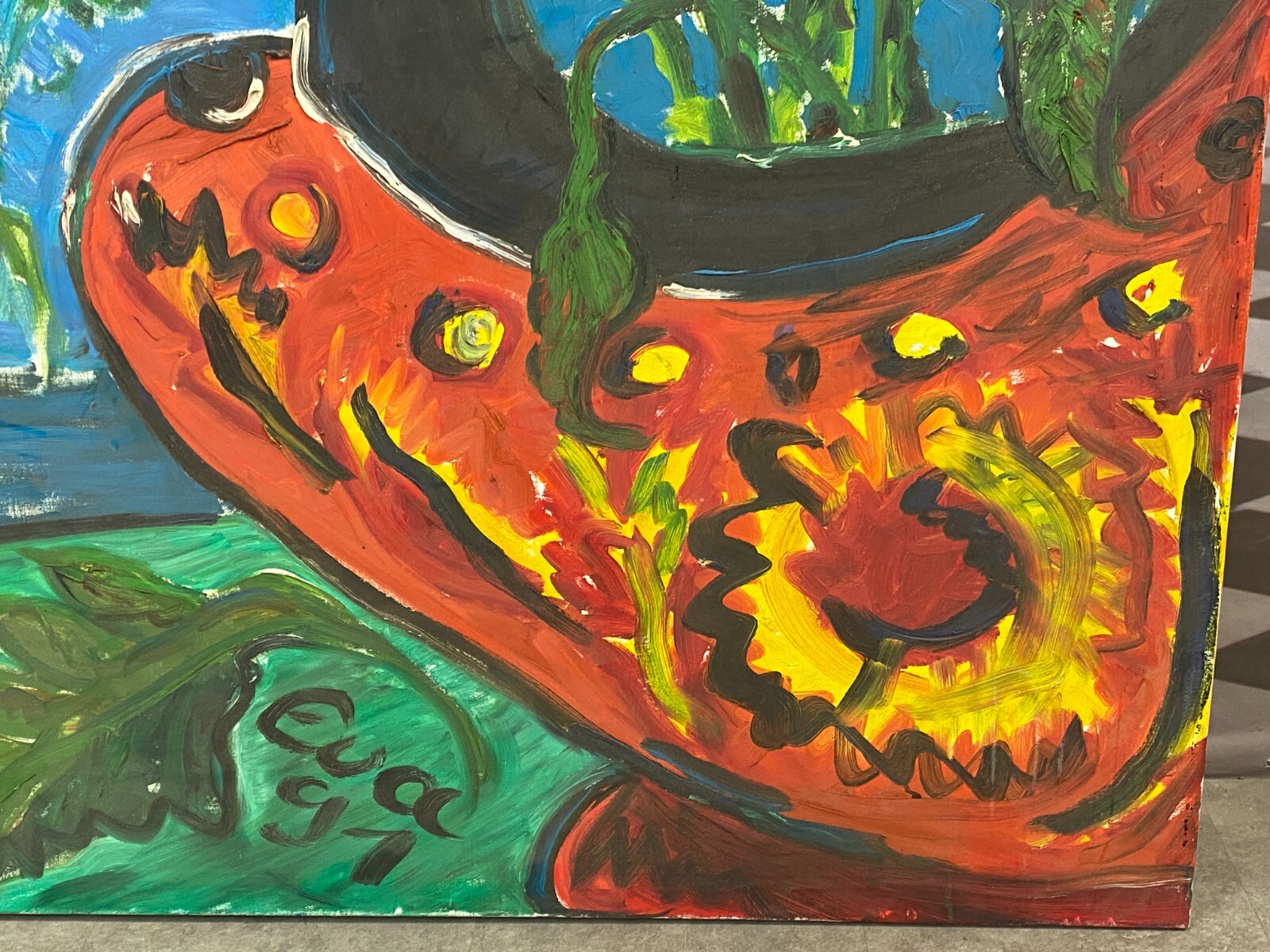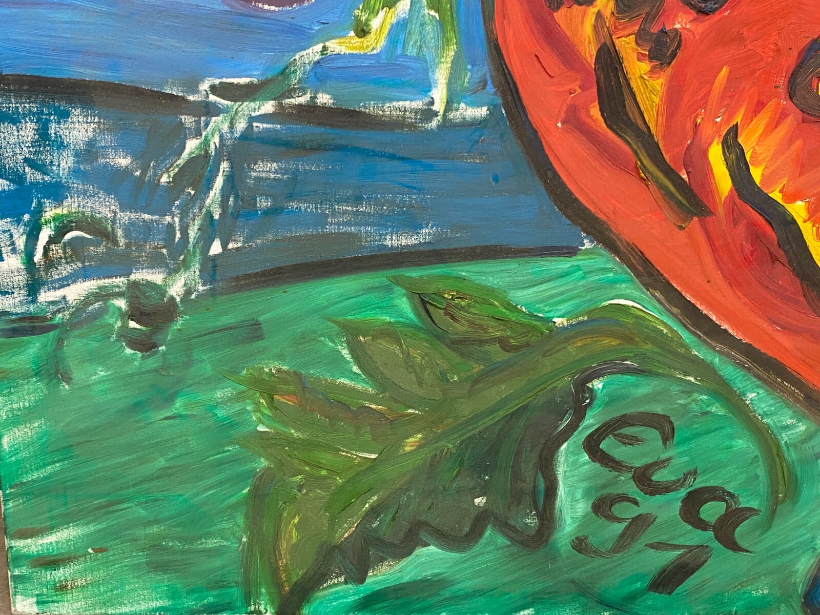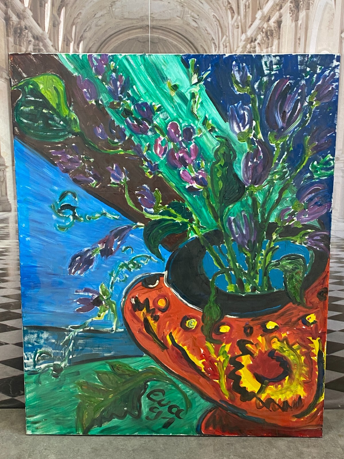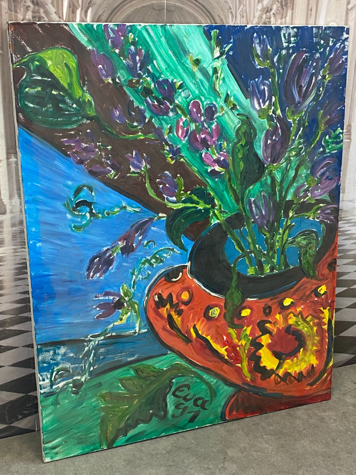 Sehr großes Acryl Gemälde auf Leinwand, unten signiert Eva ´91. Sehr schöner Zustand. Abmessungen 120x150cm.